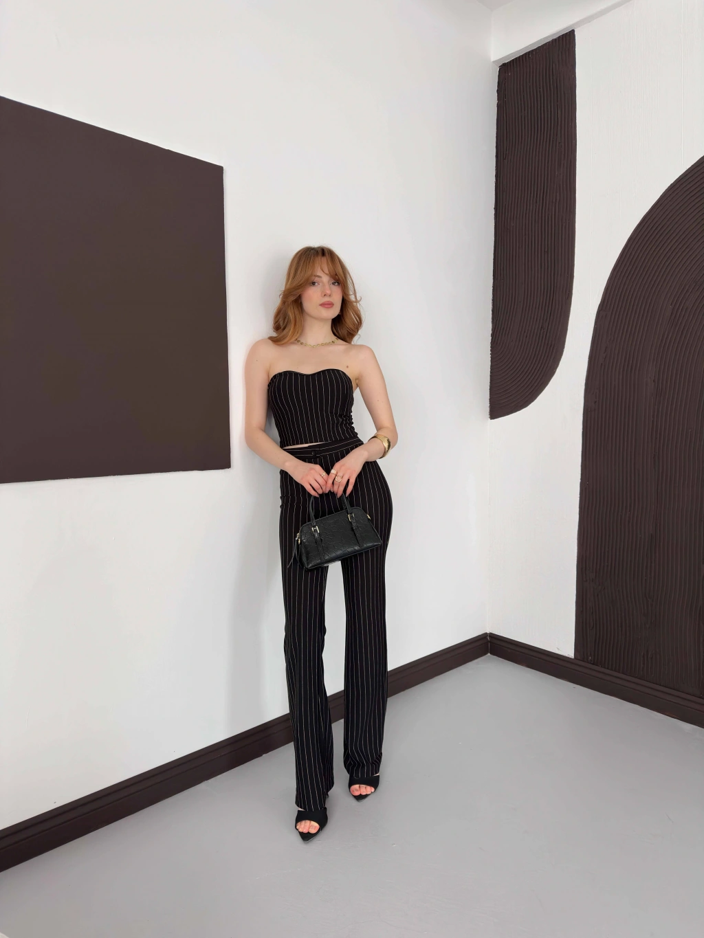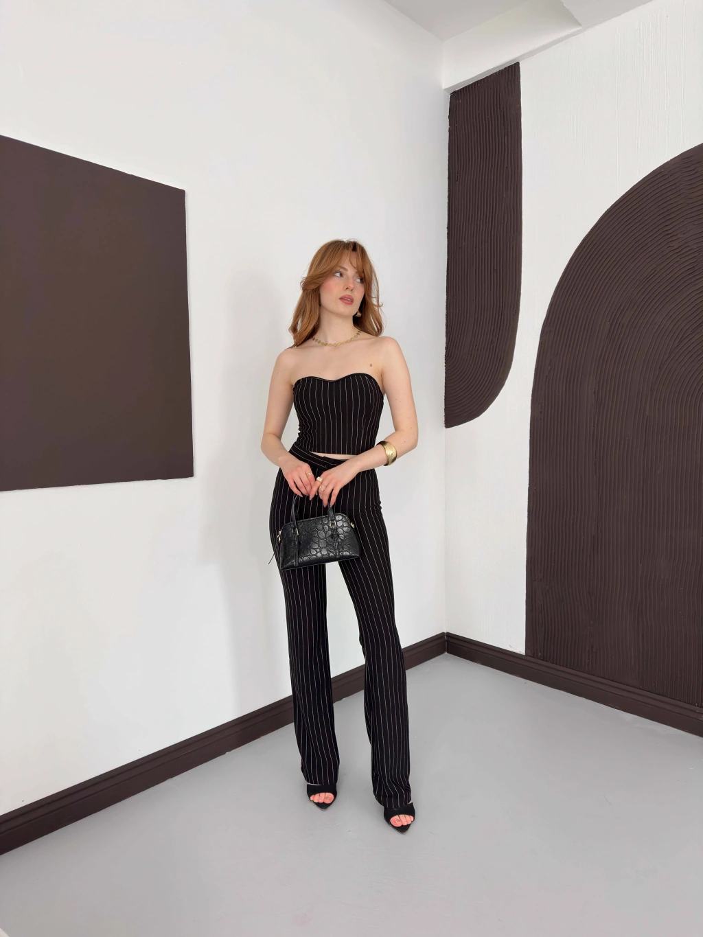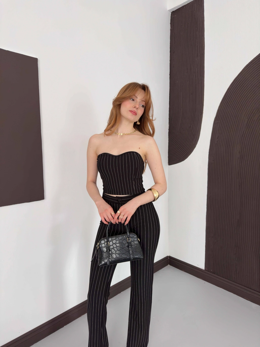 Çizgi Detaylı Crop - Pantolon Takım Siyah