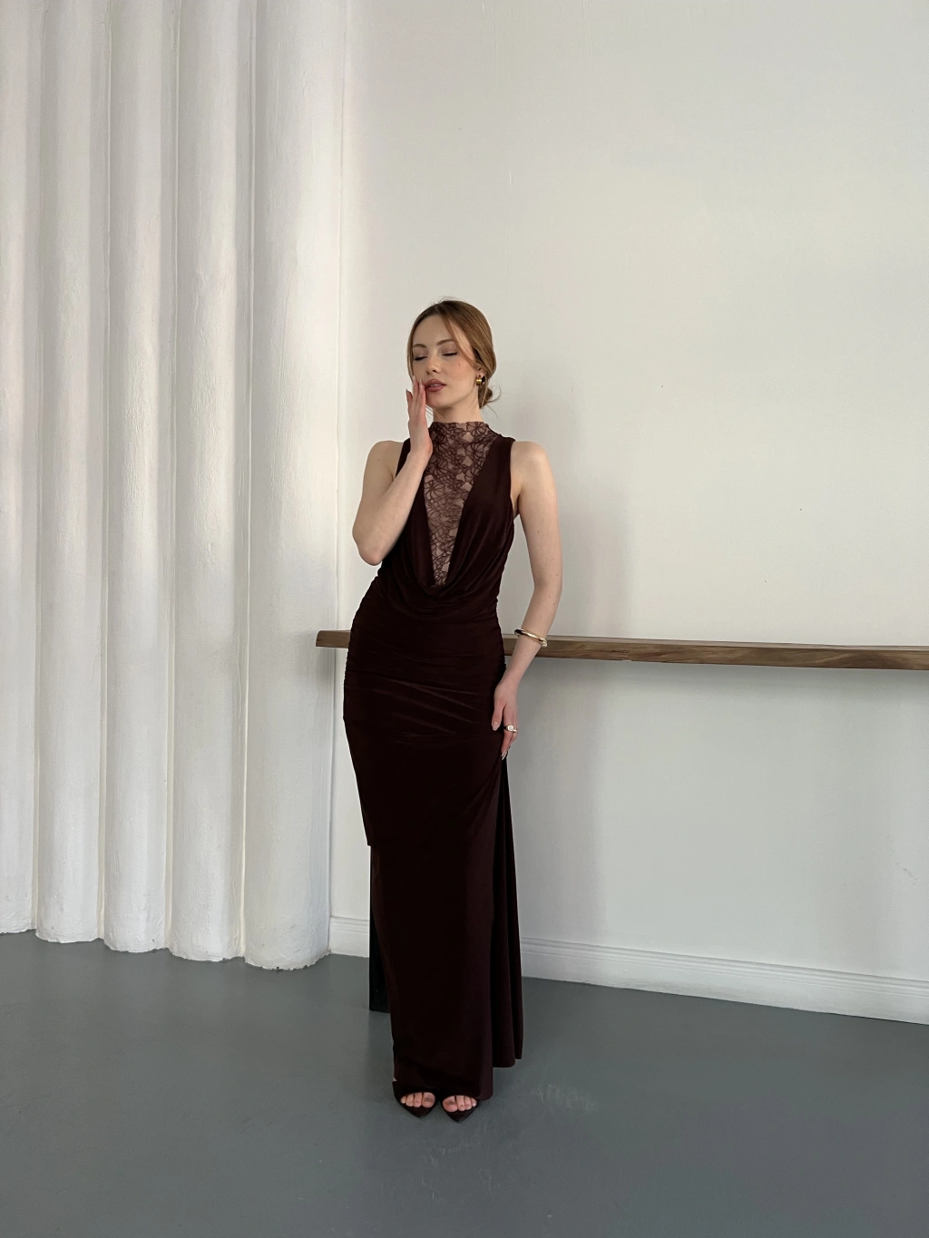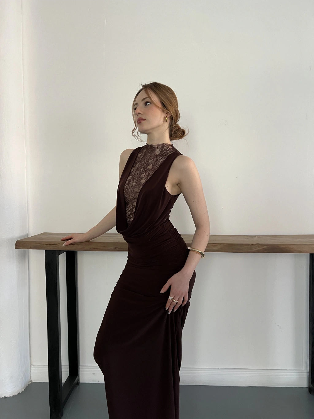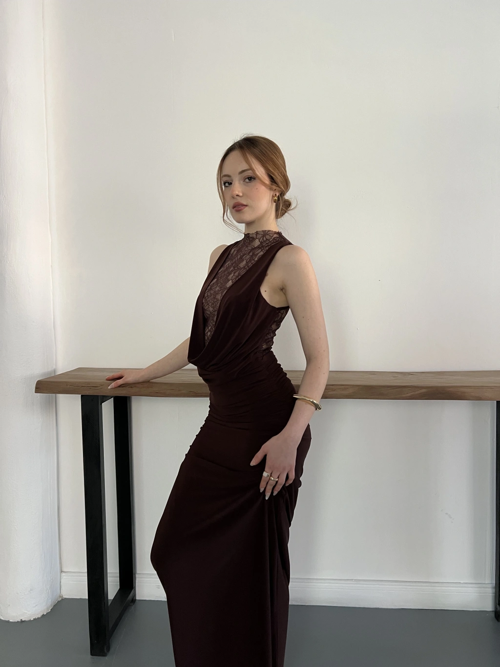 Dantel Detaylı Drapeli Couture Gece Elbisesi