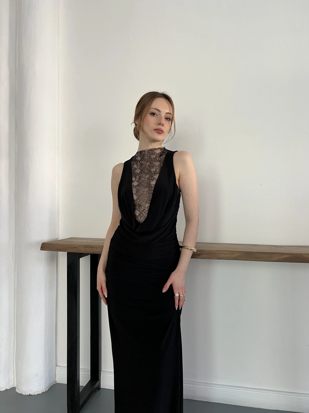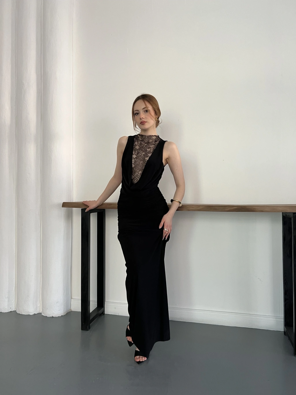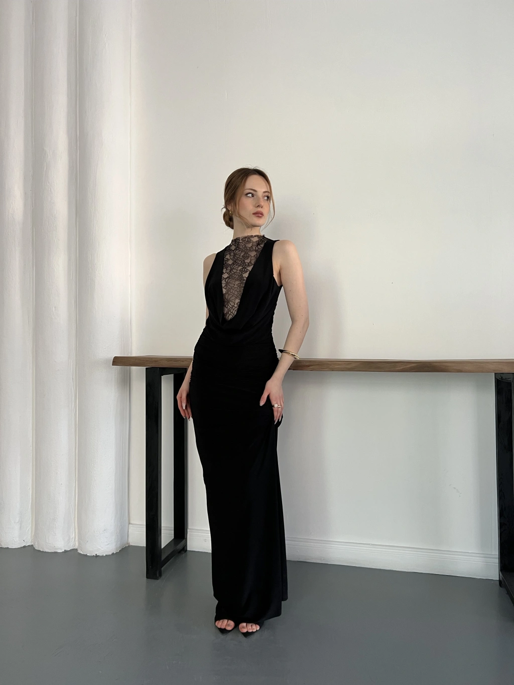 Dantel Detaylı Drapeli Couture Gece Elbisesi Siyah