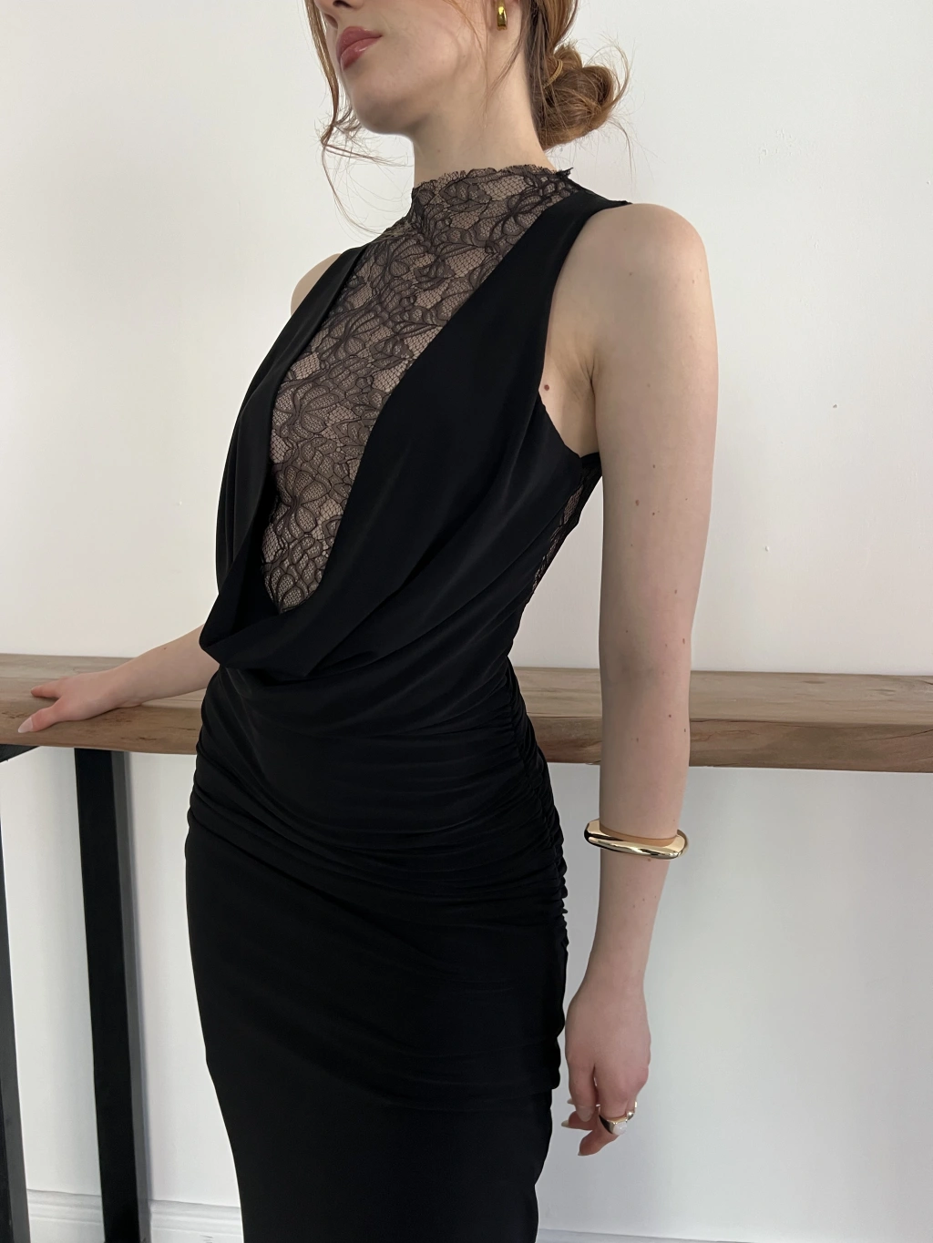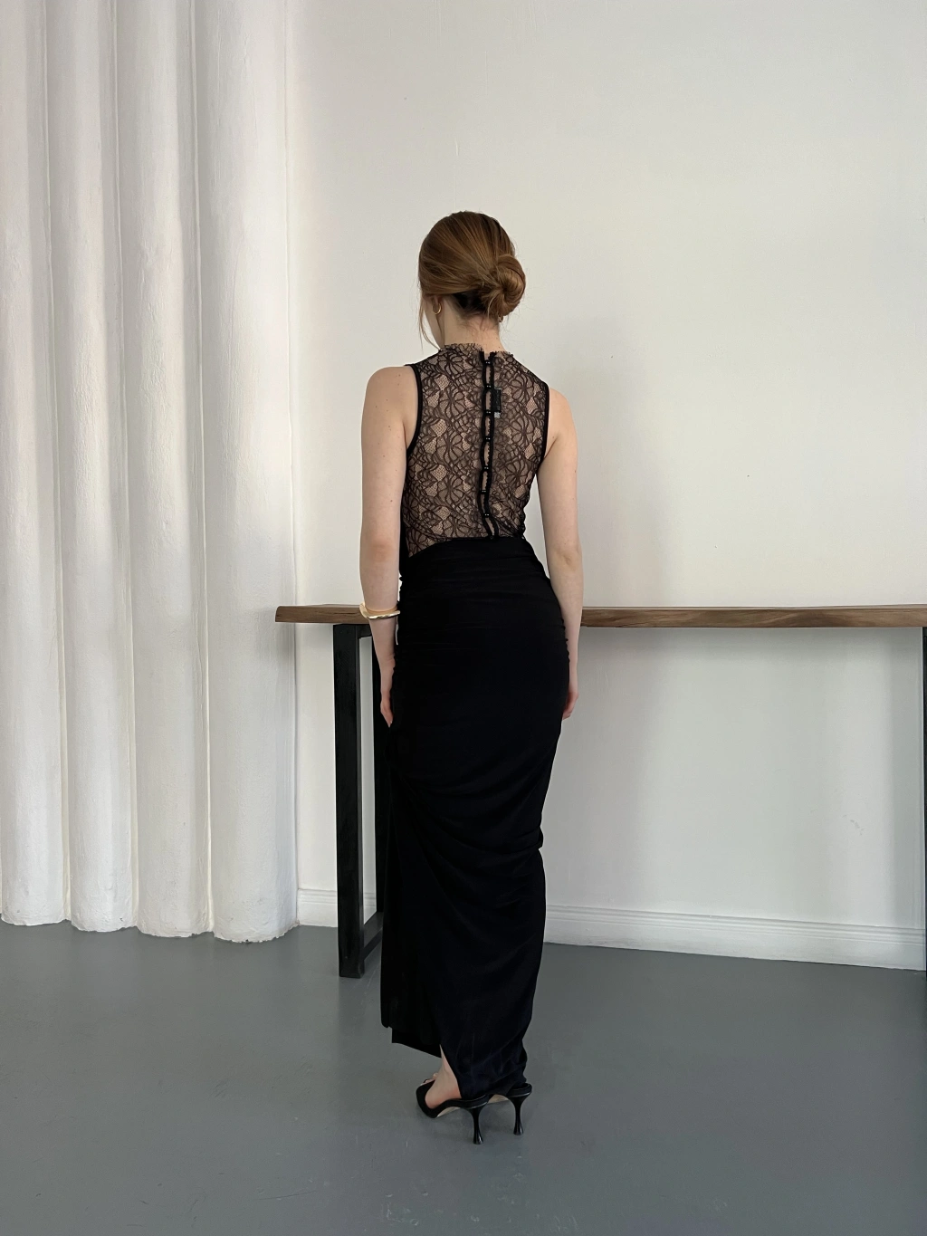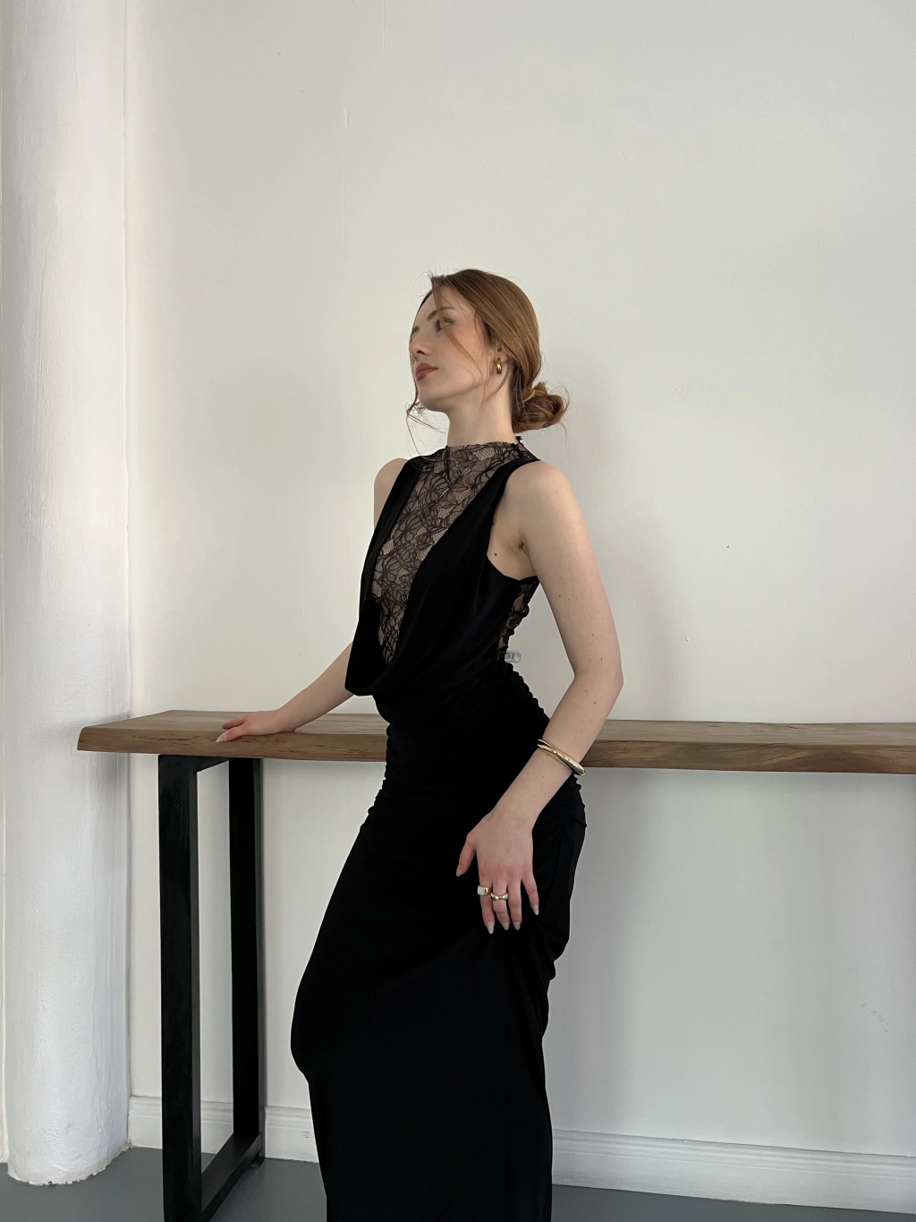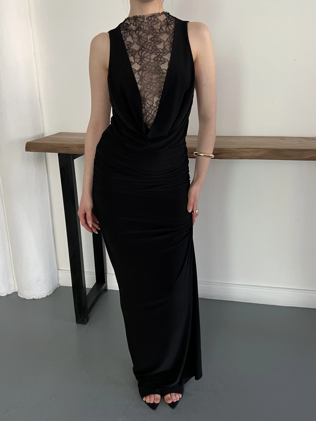 Dantel Detaylı Drapeli Couture Gece Elbisesi Siyah