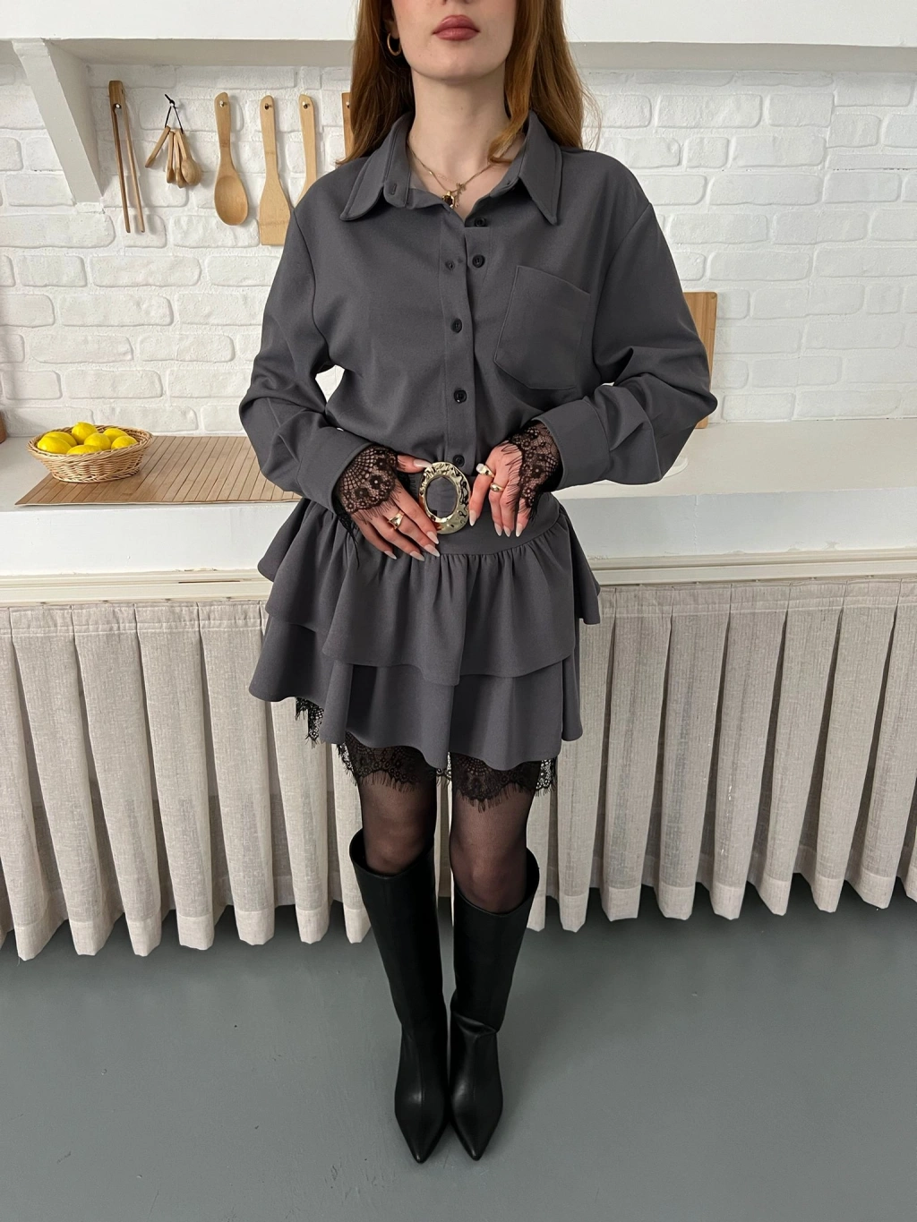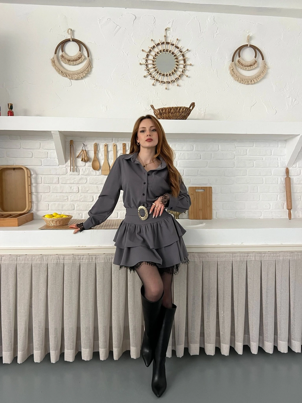 Dantel Detaylı Kemerli Mini Elbise Gri
