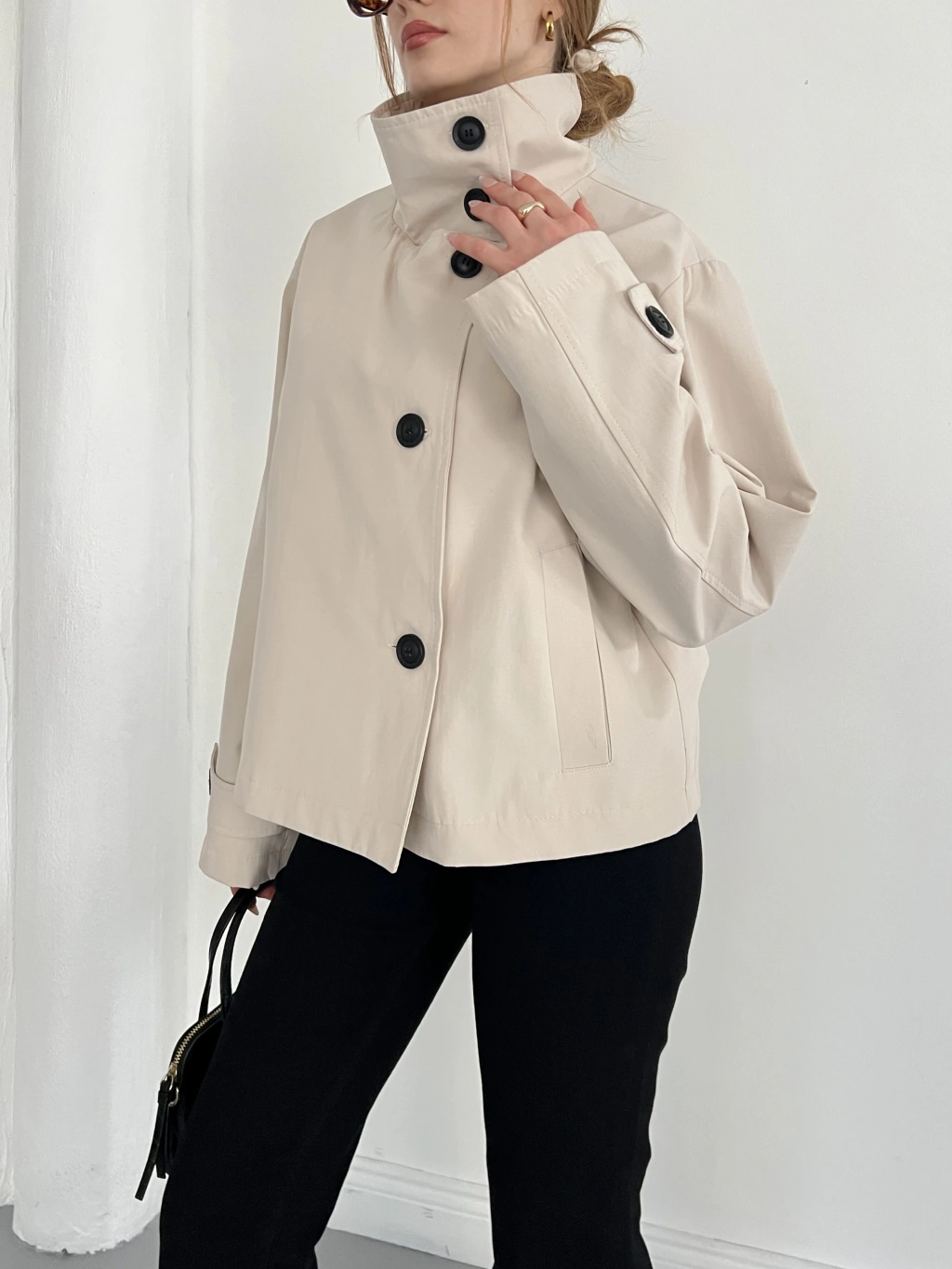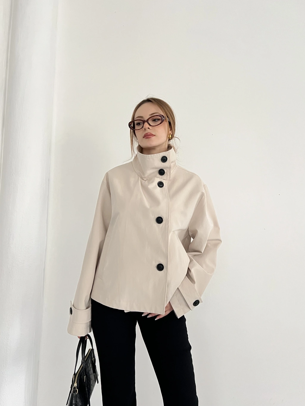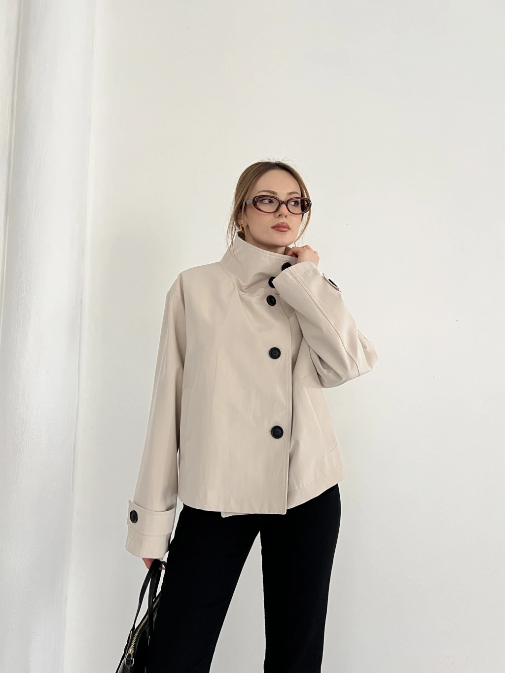 Dik Yaka Düğme Detaylı Trenckot Bej