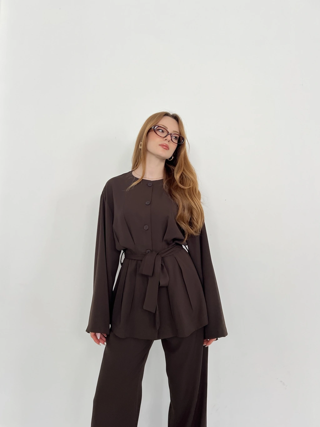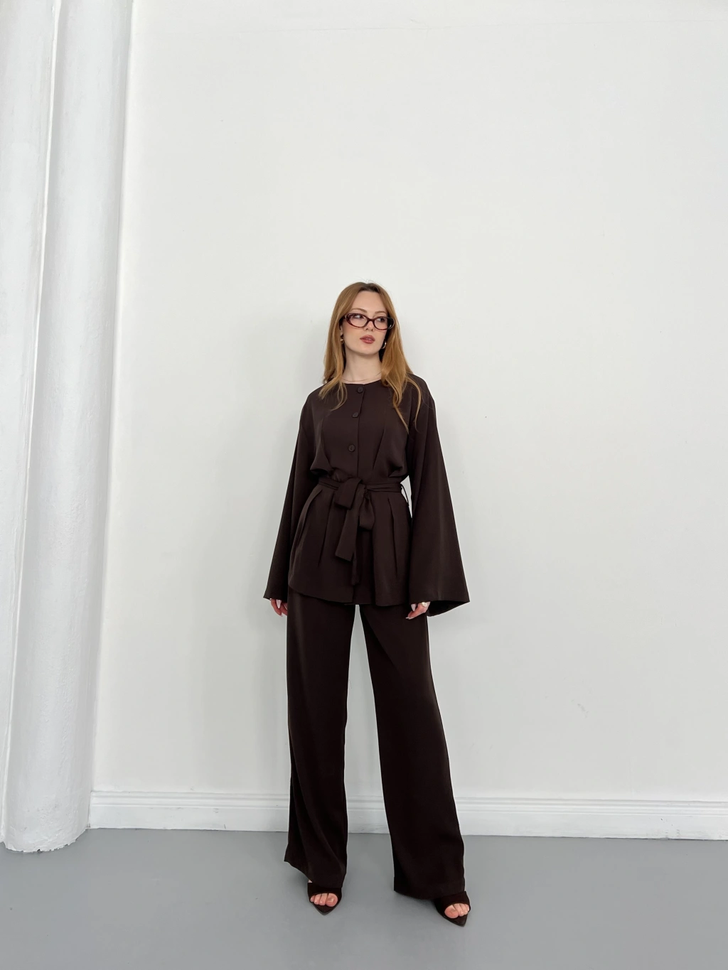 Düğme Detaylı Bel Kuşaklı İspanyol Kol Takım Acı Kahve