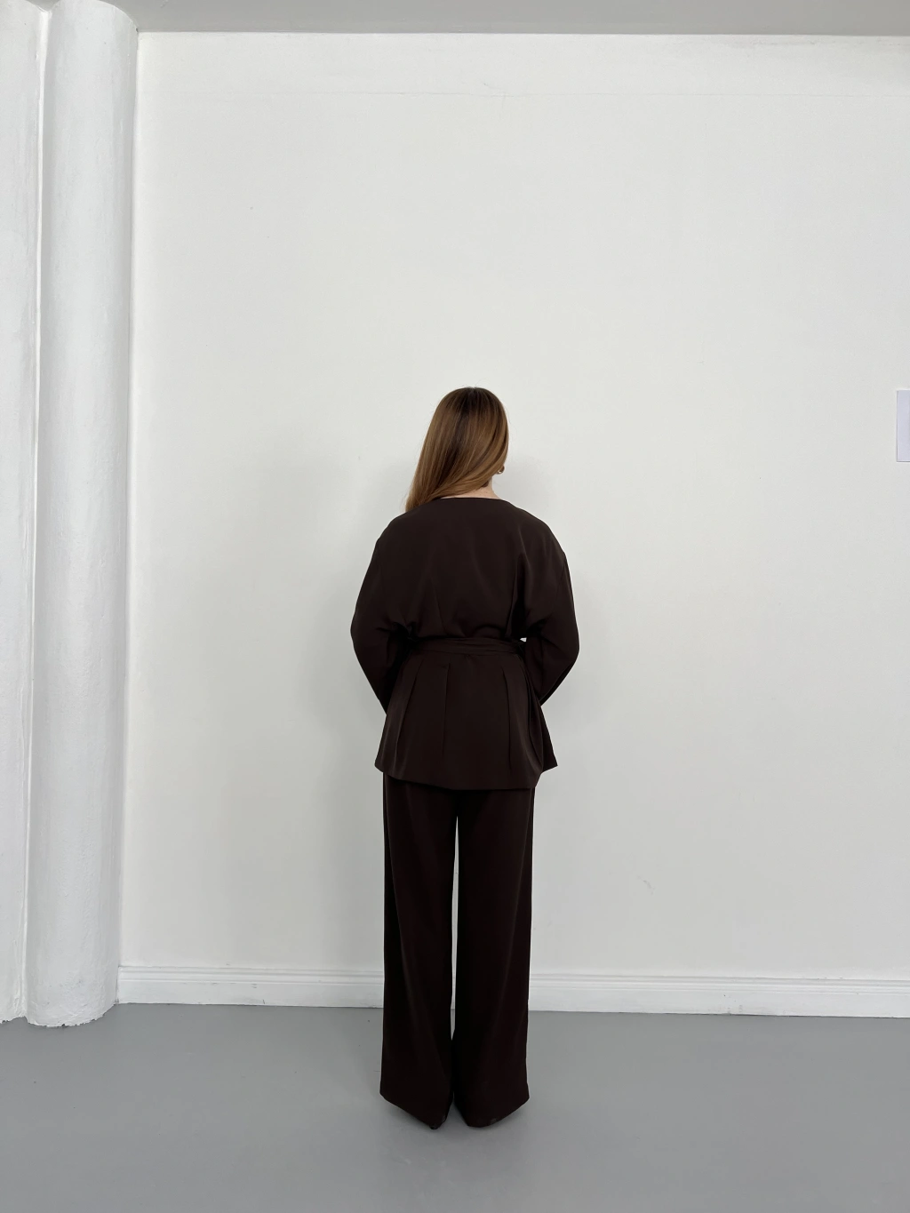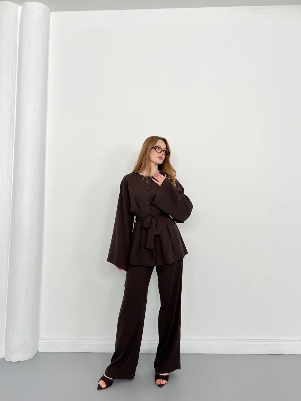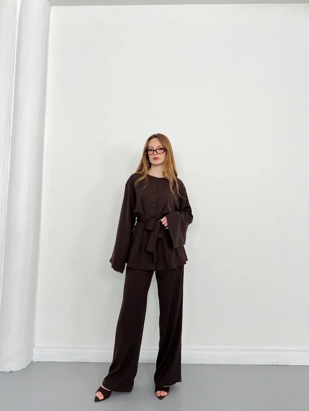 Düğme Detaylı Bel Kuşaklı İspanyol Kol Takım Kahve