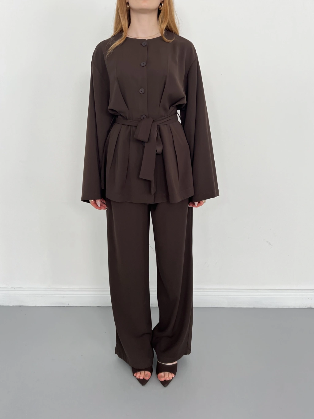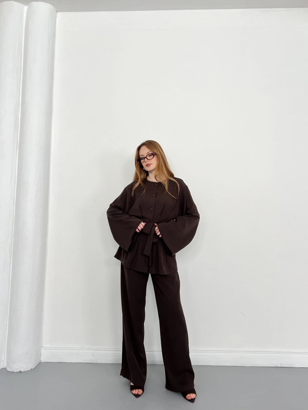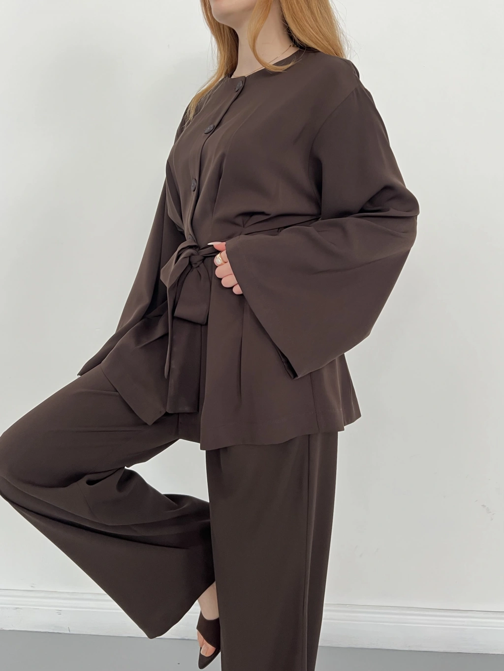 Düğme Detaylı Bel Kuşaklı İspanyol Kol Takım Kahve