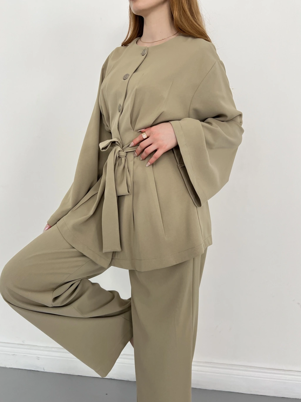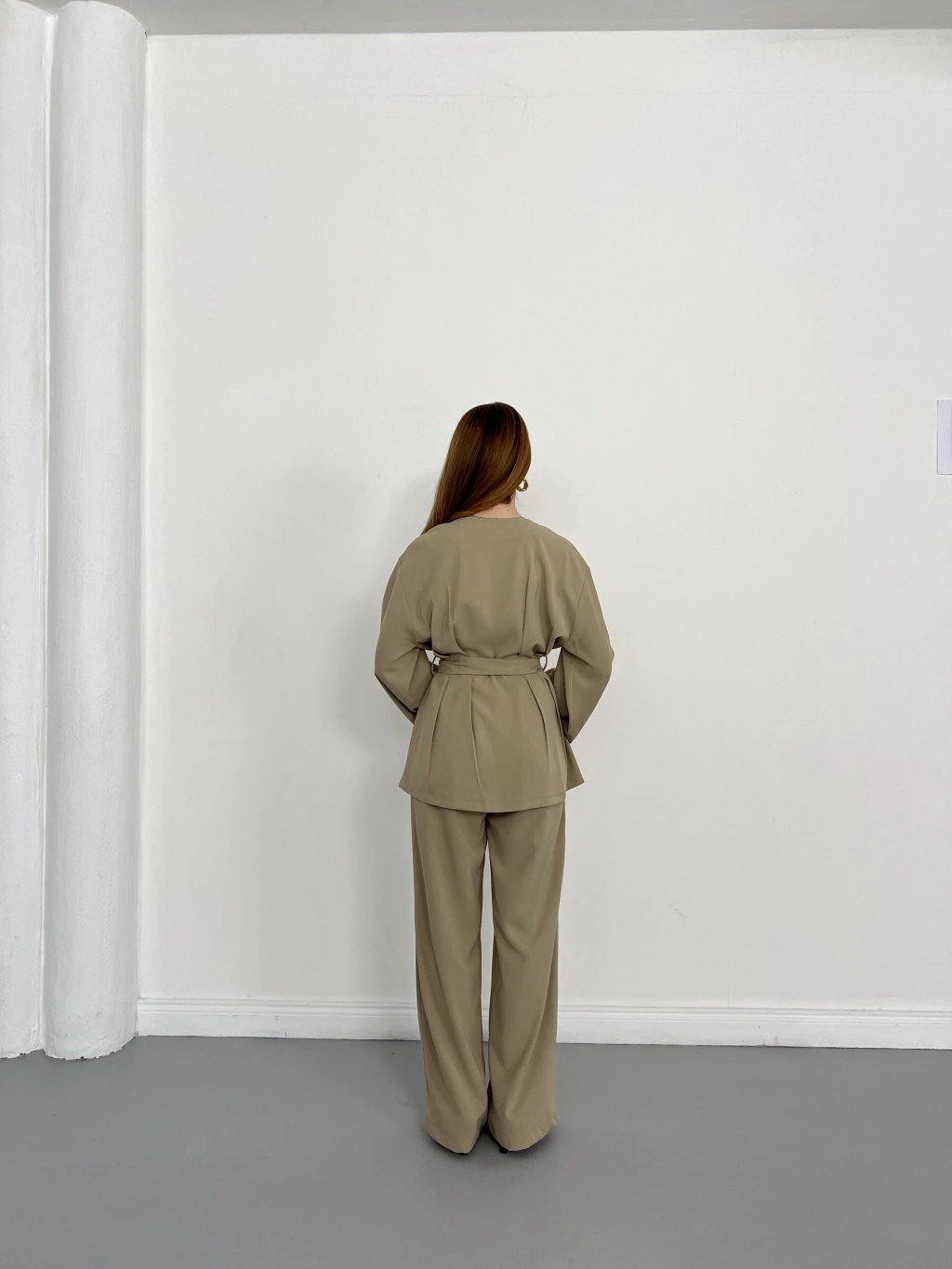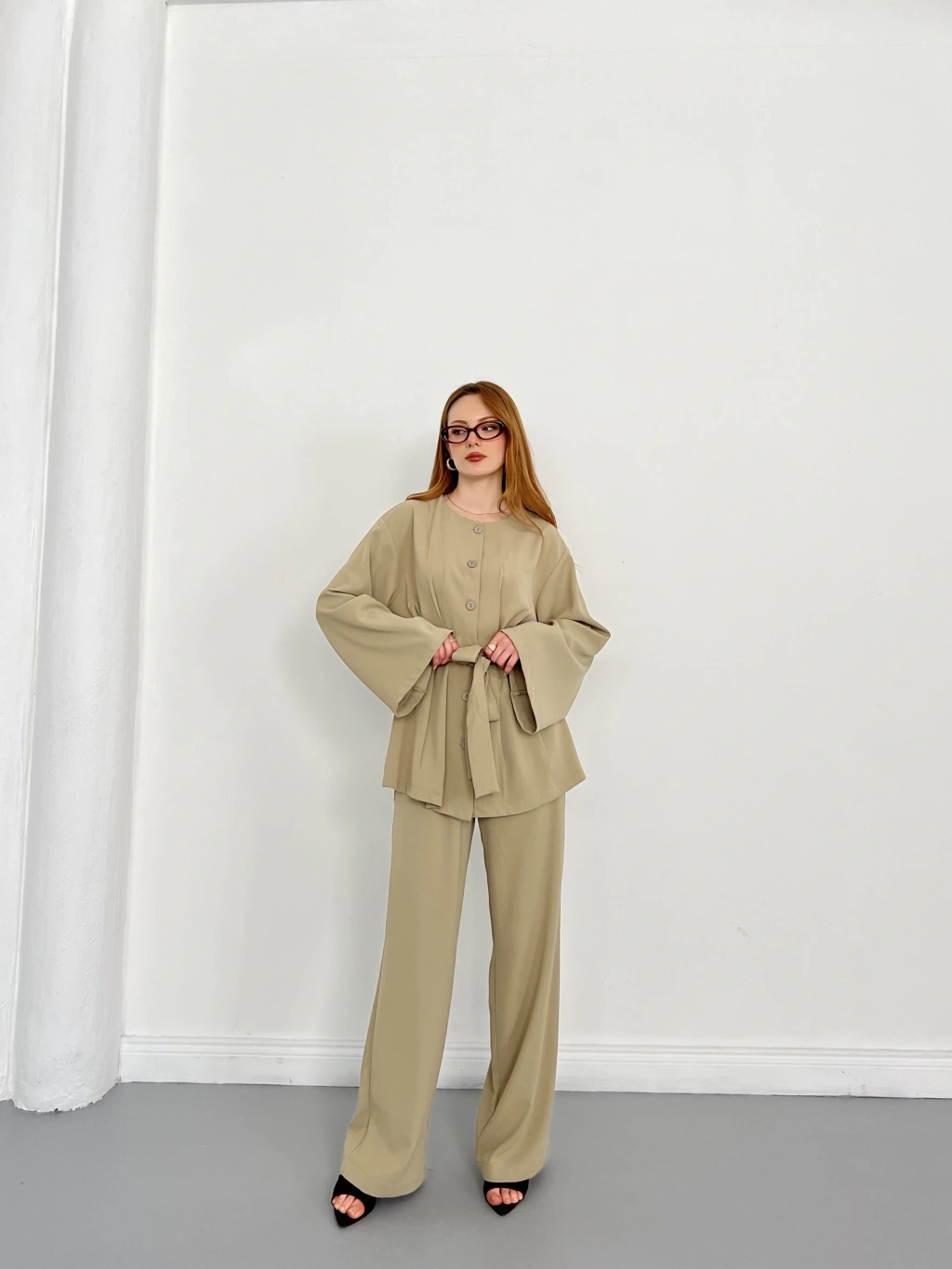 Düğme Detaylı Bel Kuşaklı İspanyol Kol Takım Acı Bej