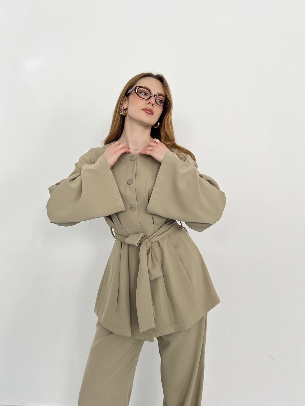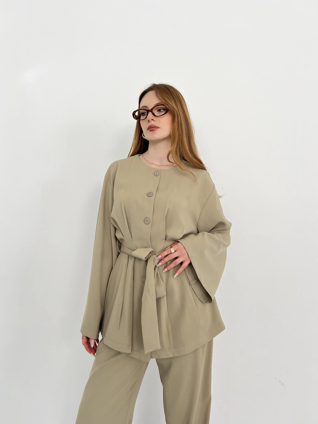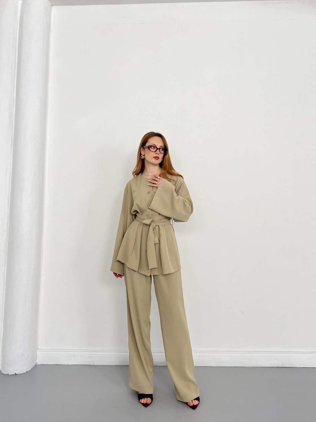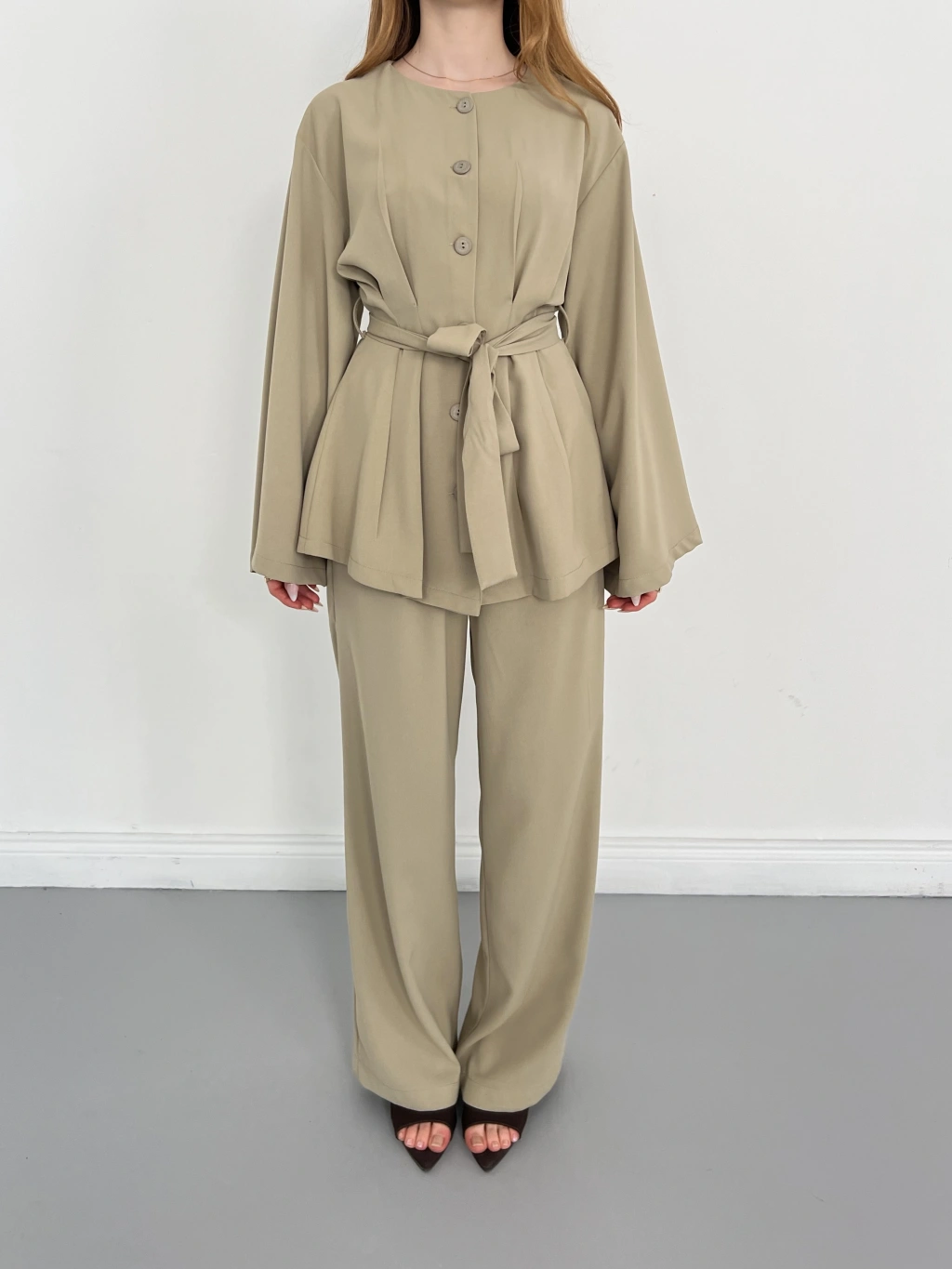 Düğme Detaylı Bel Kuşaklı İspanyol Kol Takım Acı Bej