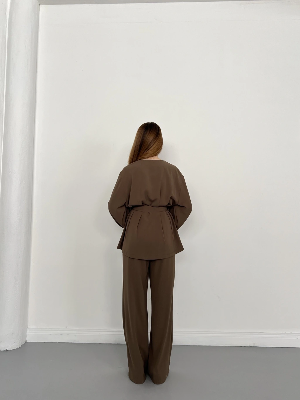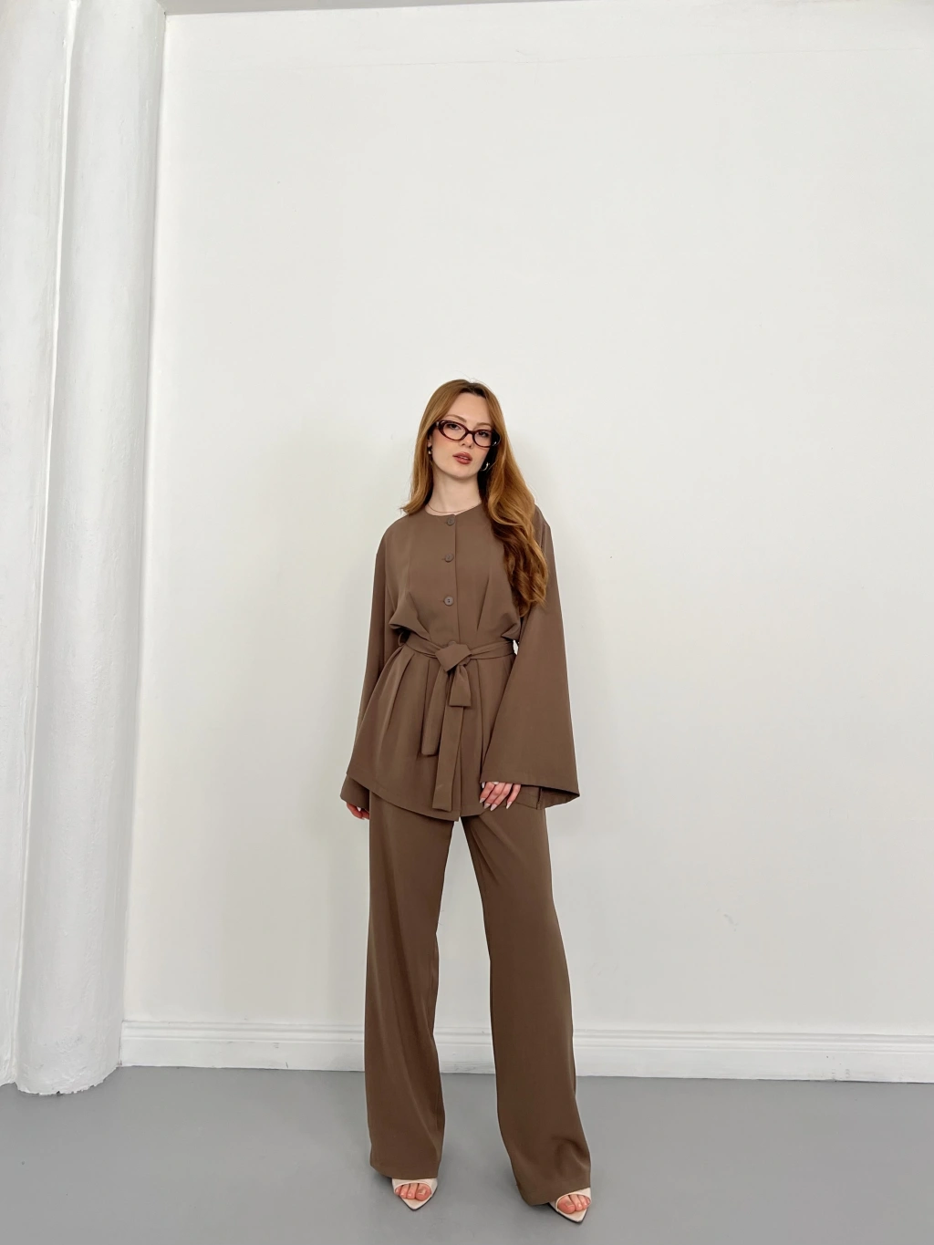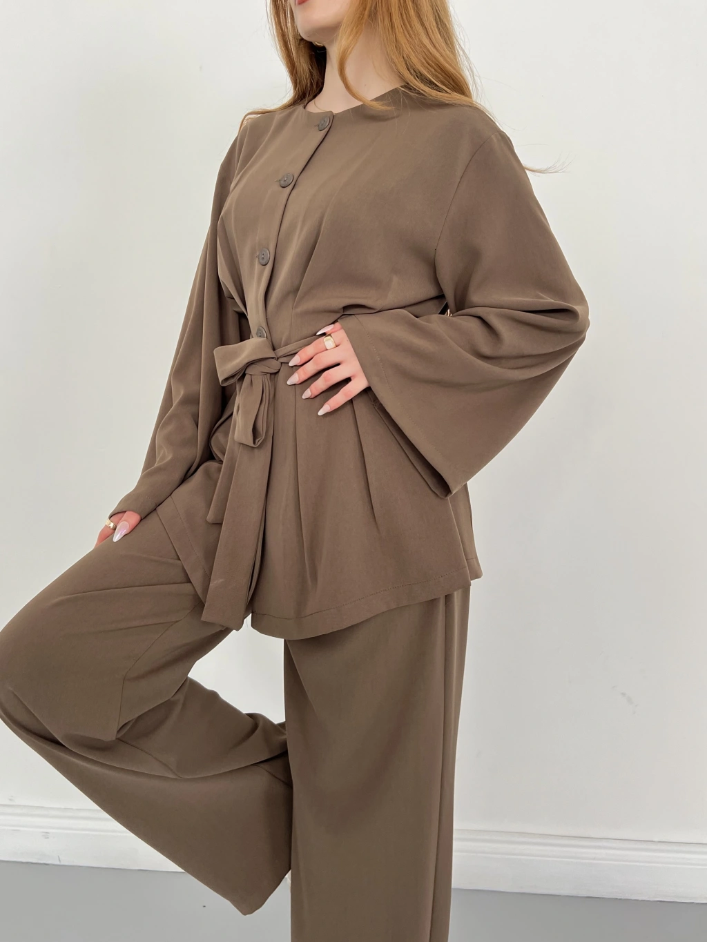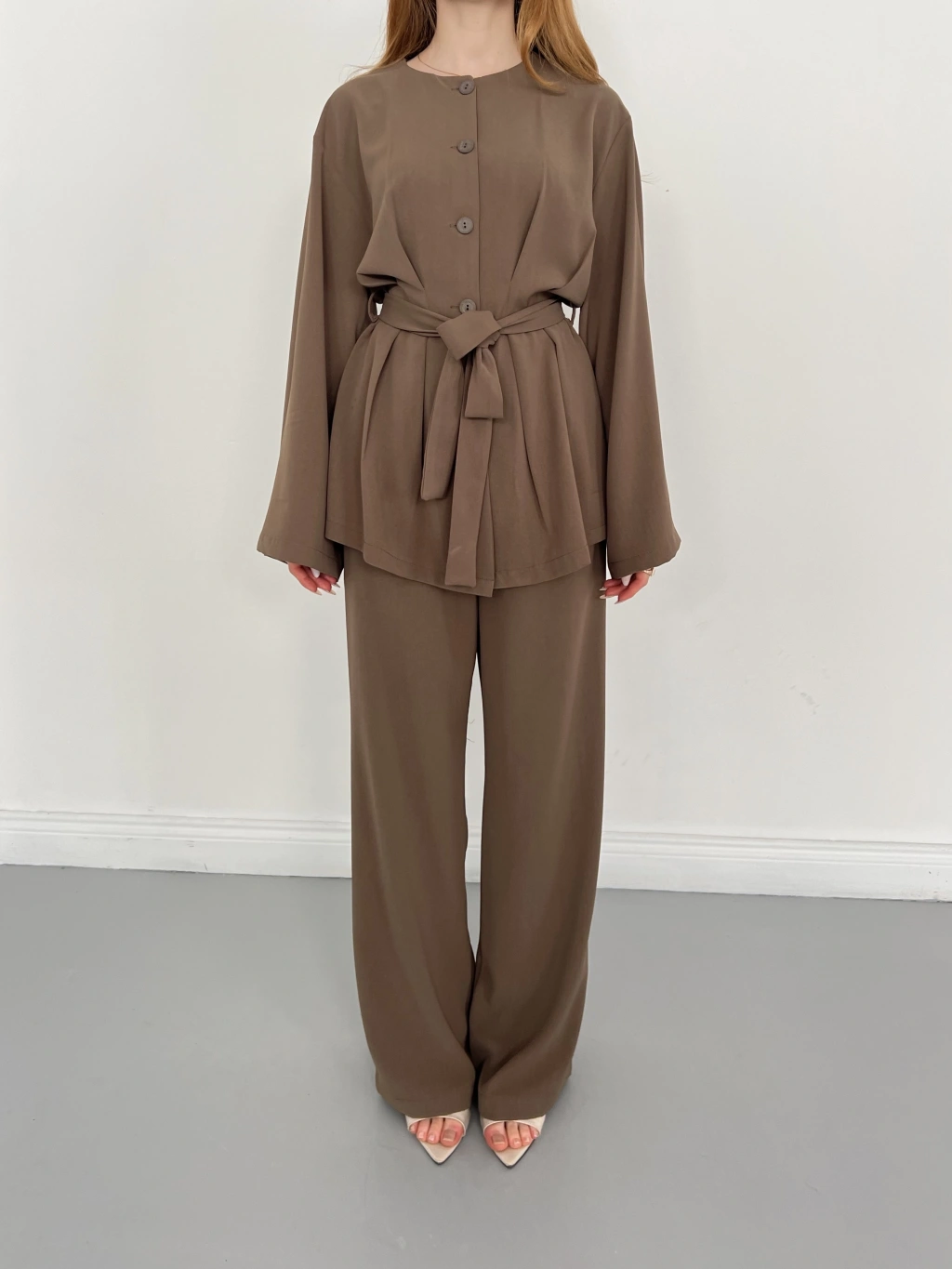 Düğme Detaylı Bel Kuşaklı İspanyol Kol Takım Kahve