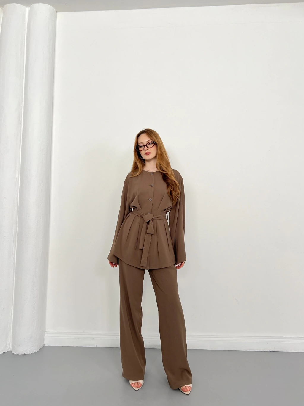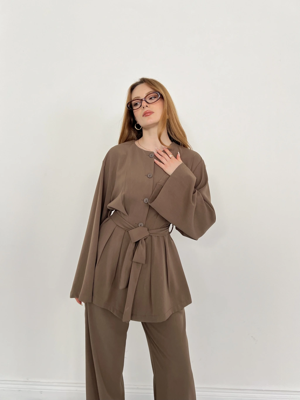 Düğme Detaylı Bel Kuşaklı İspanyol Kol Takım Acı Kahve