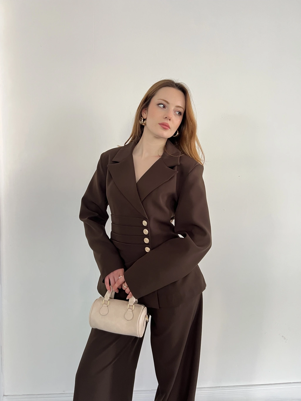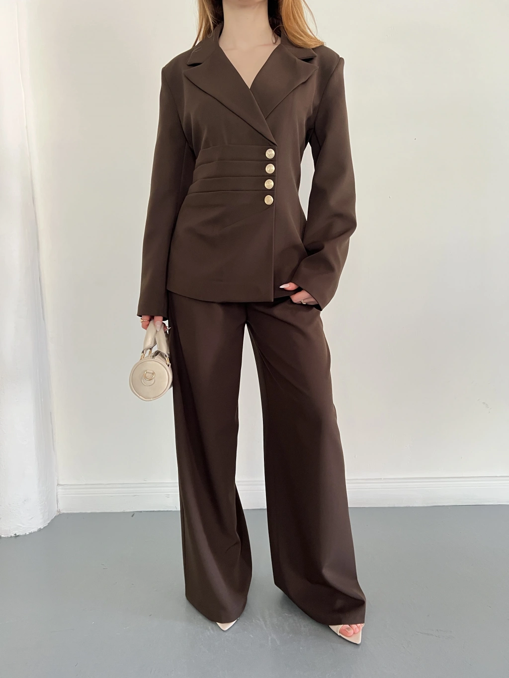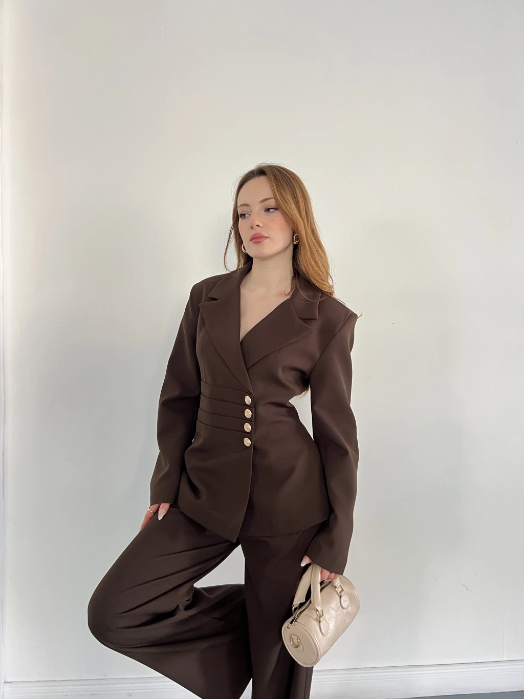 Düğme Detaylı Doublu Kumaş Tasarım Takım Kahve