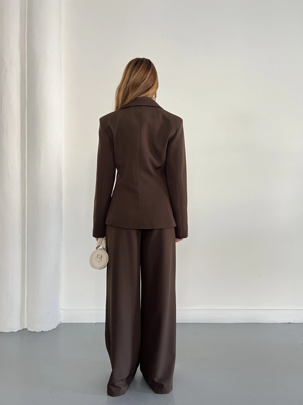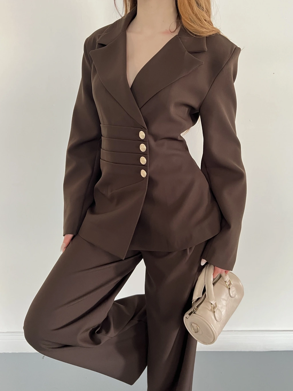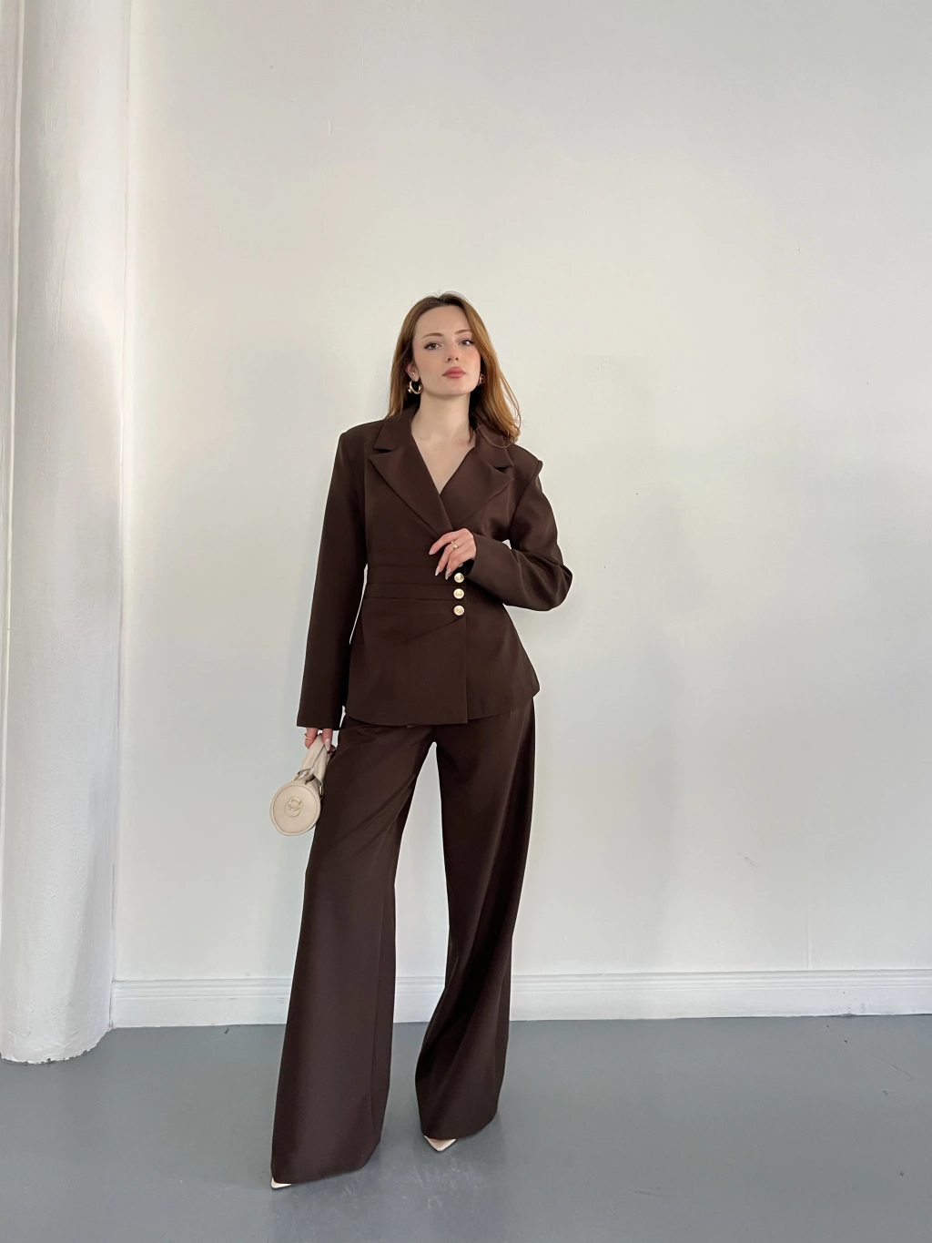 Düğme Detaylı Doublu Kumaş Tasarım Takım Kahve