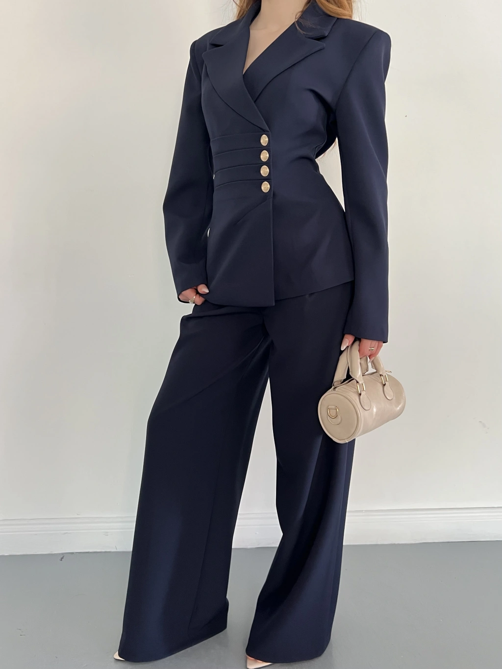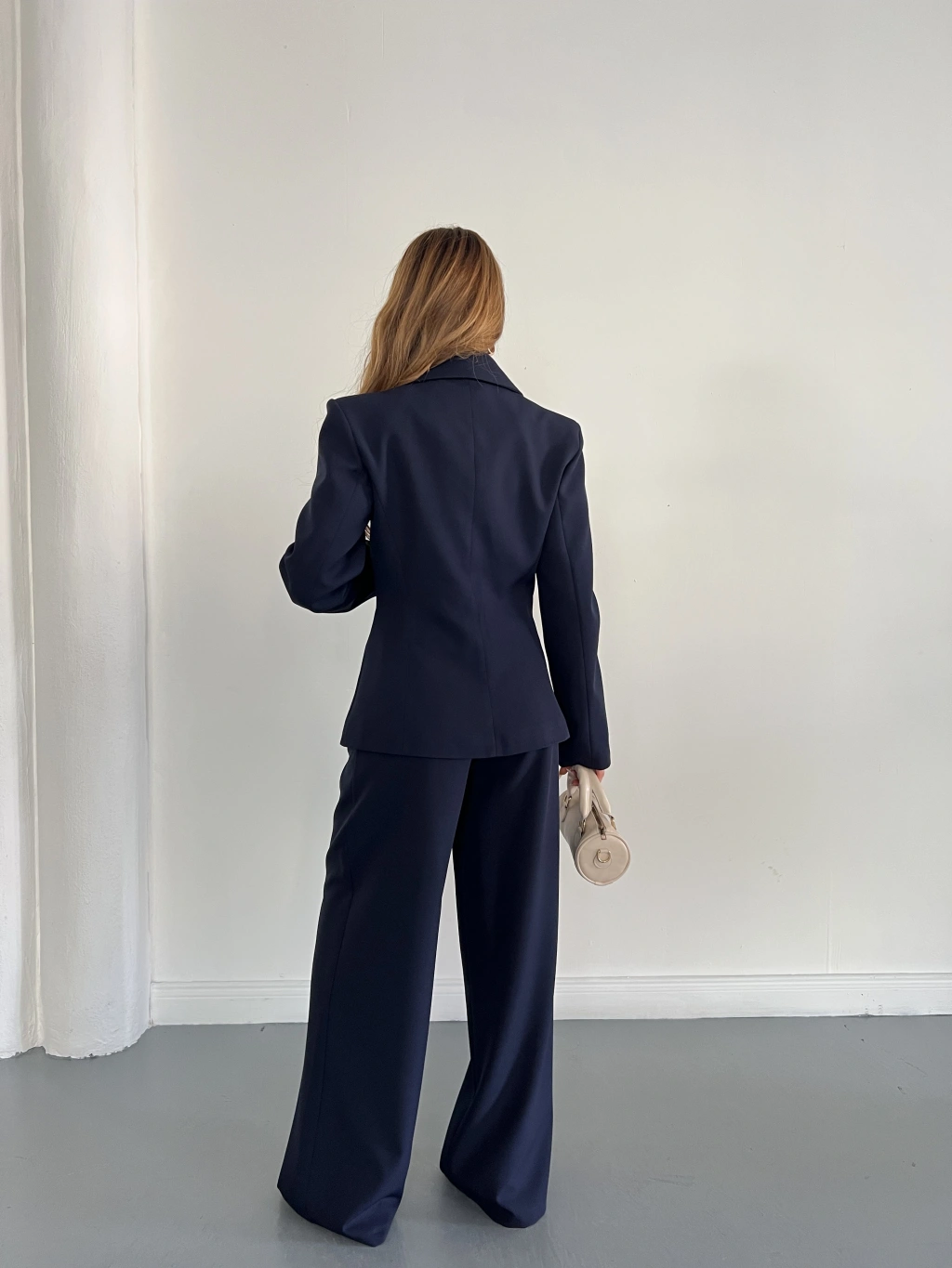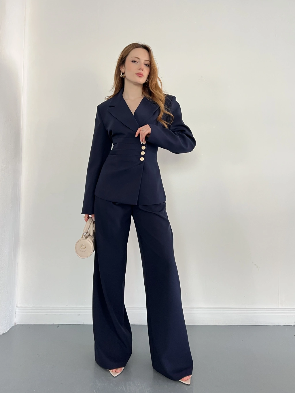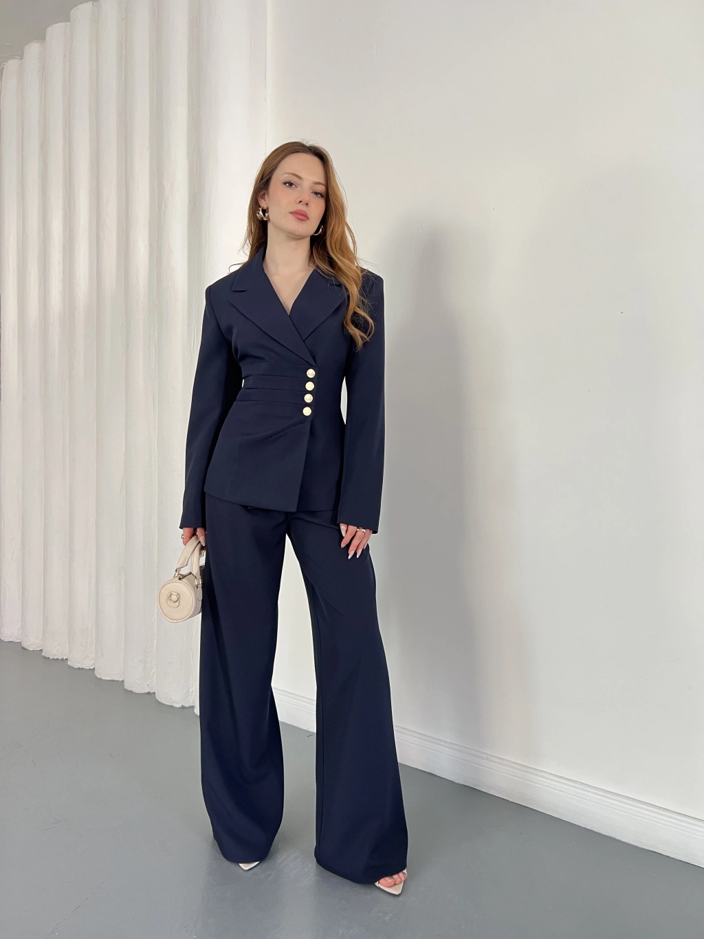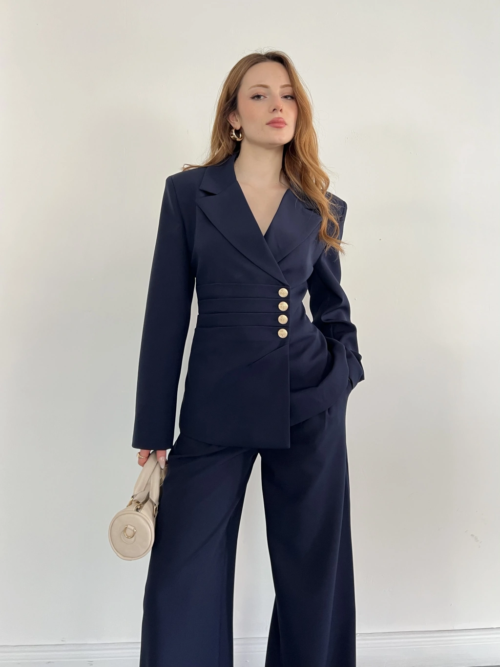 Düğme Detaylı Doublu Kumaş Tasarım Takım Lacivert