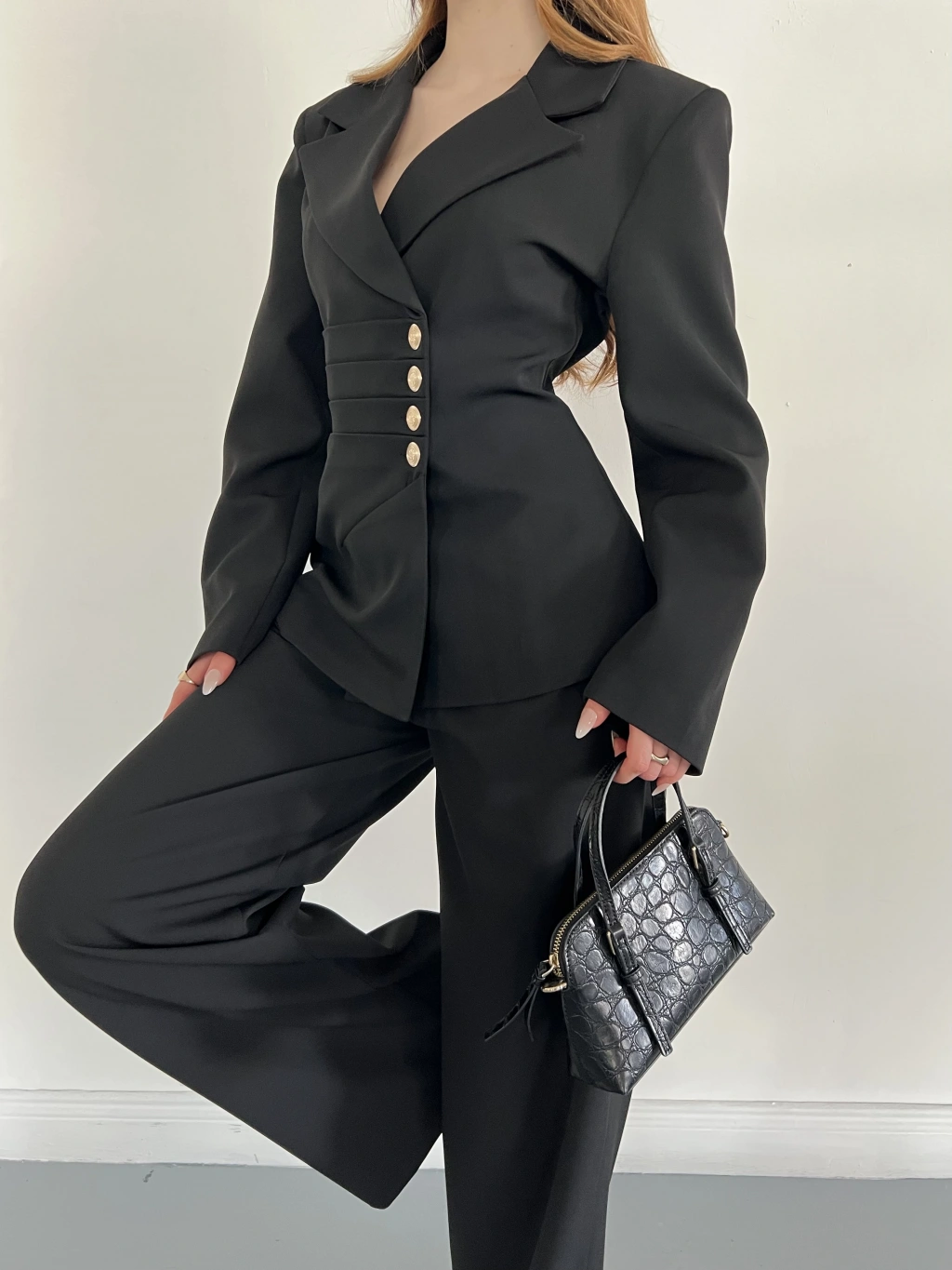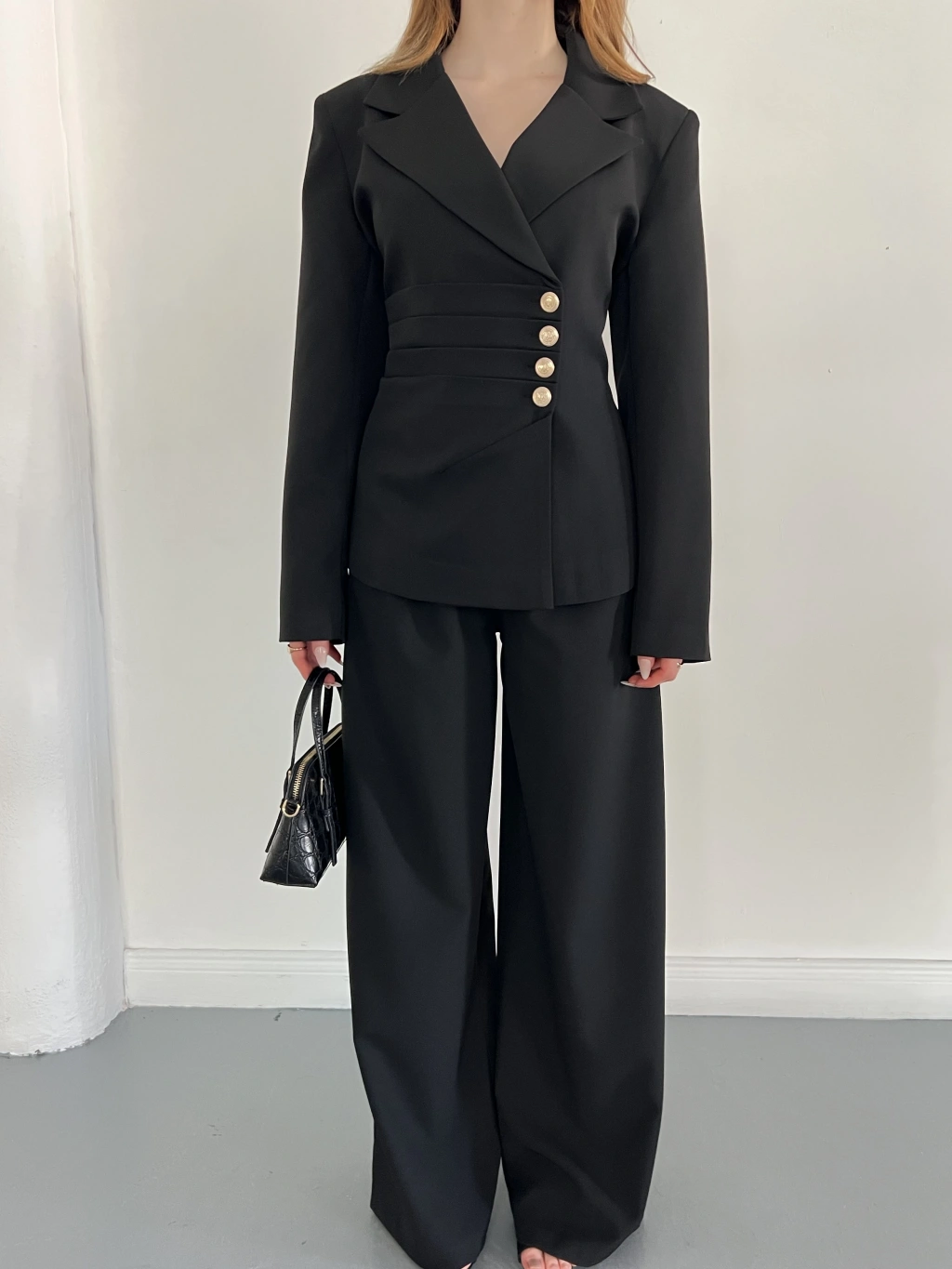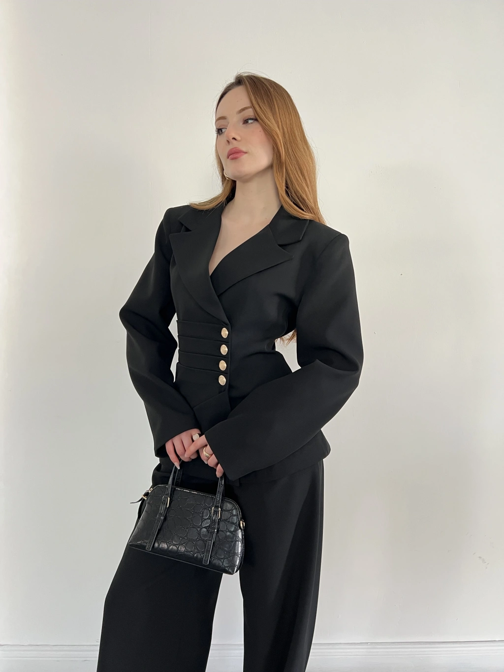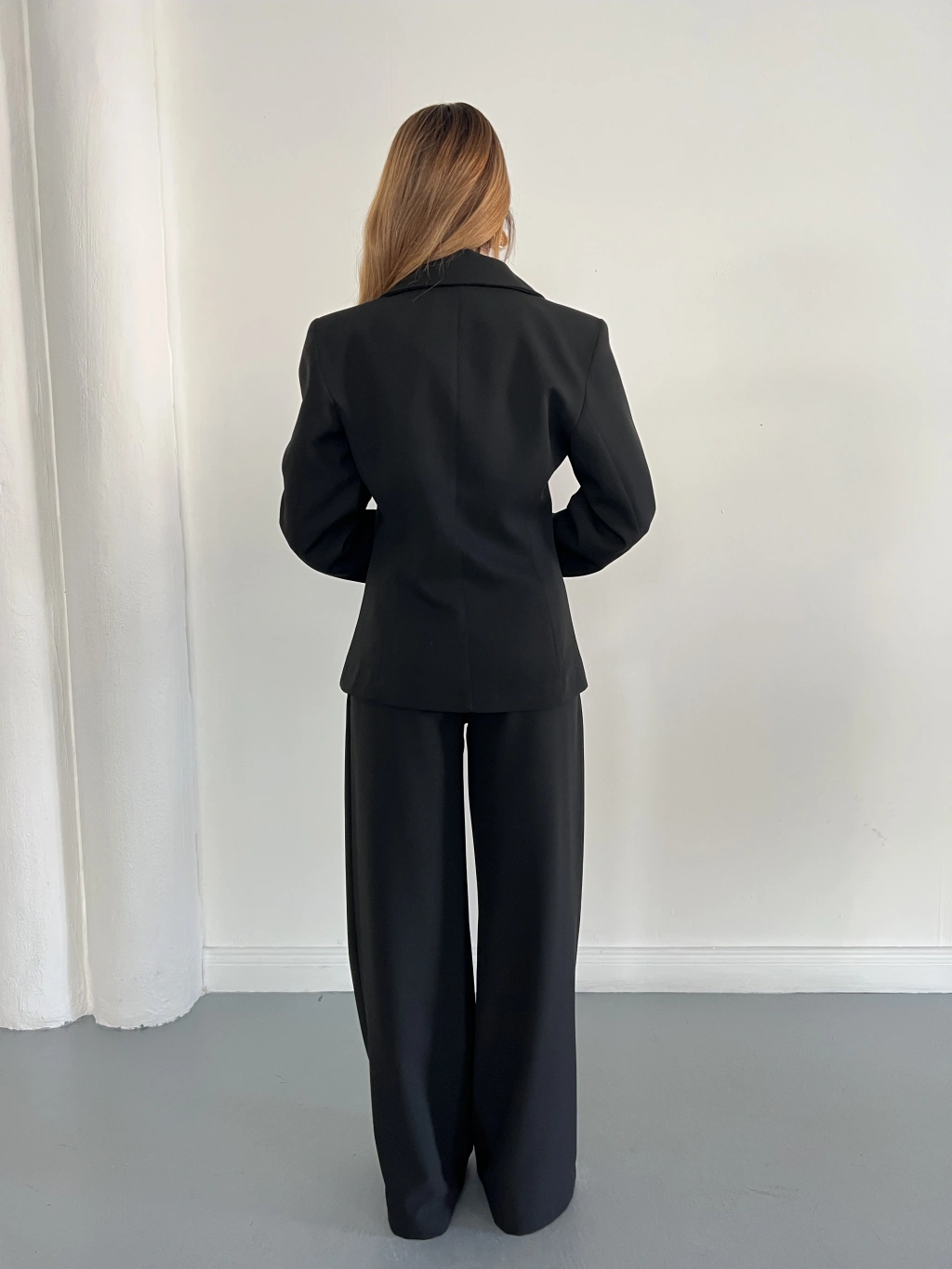 Düğme Detaylı Doublu Kumaş Tasarım Takım Siyah