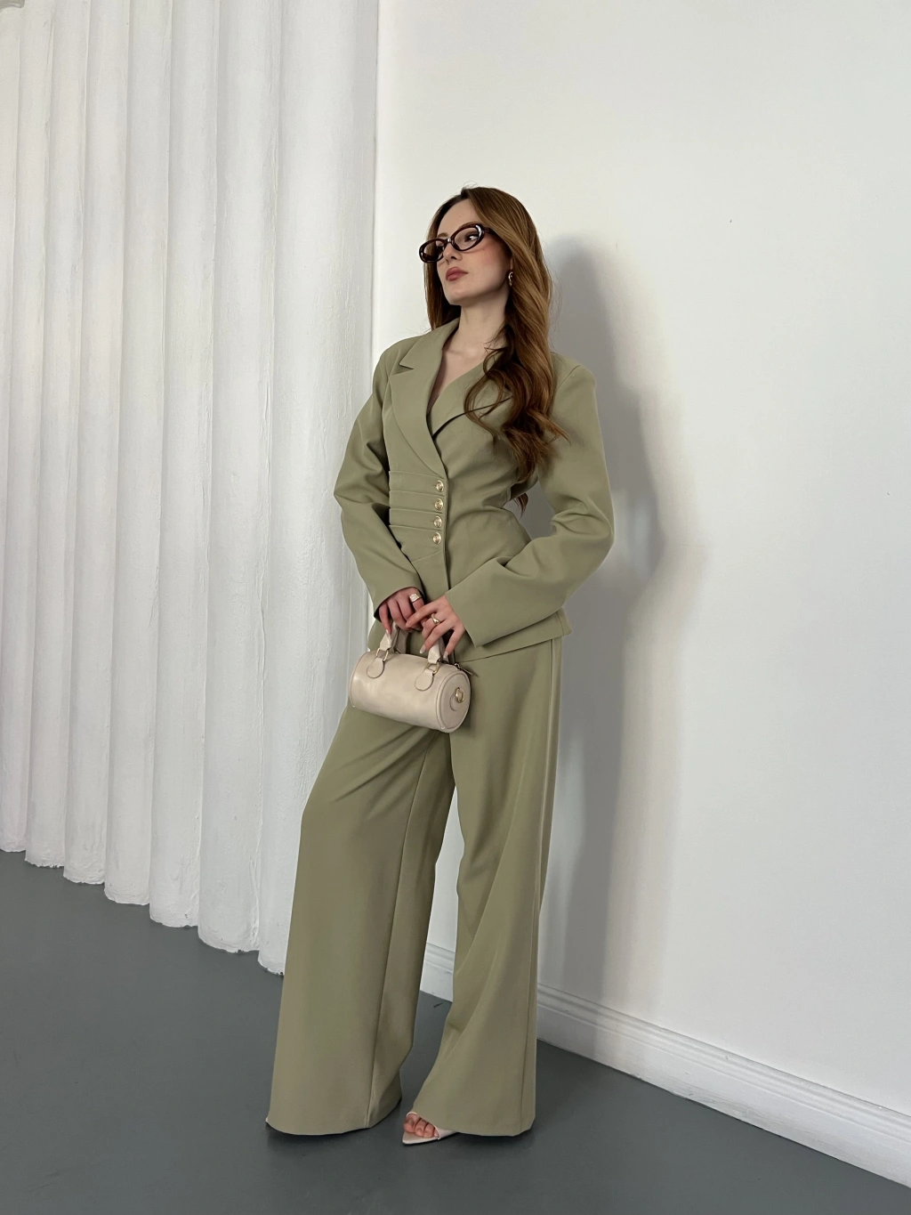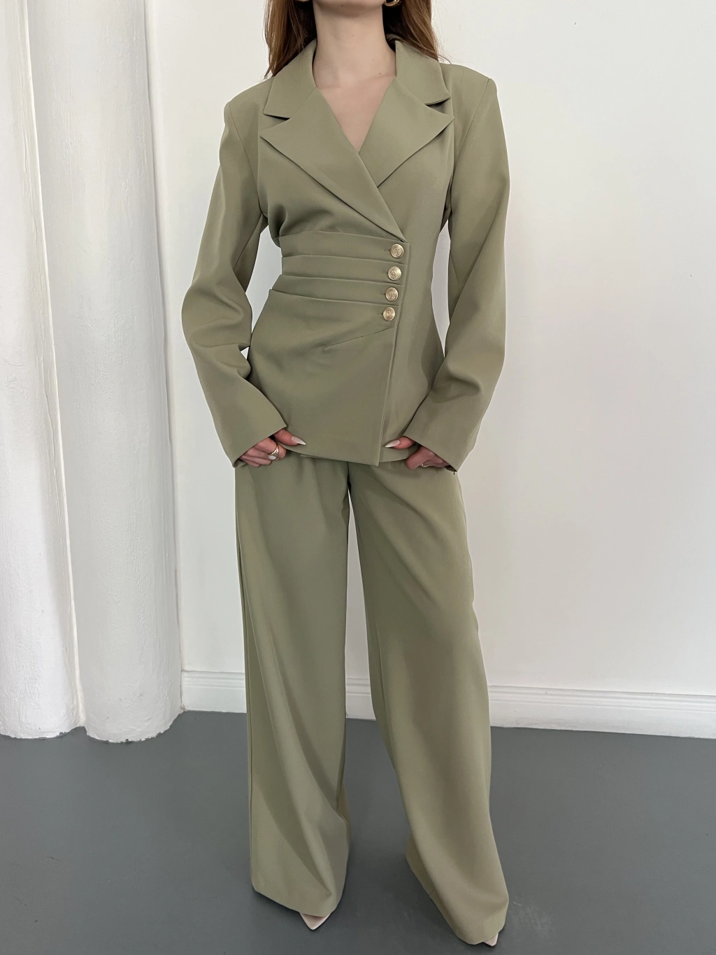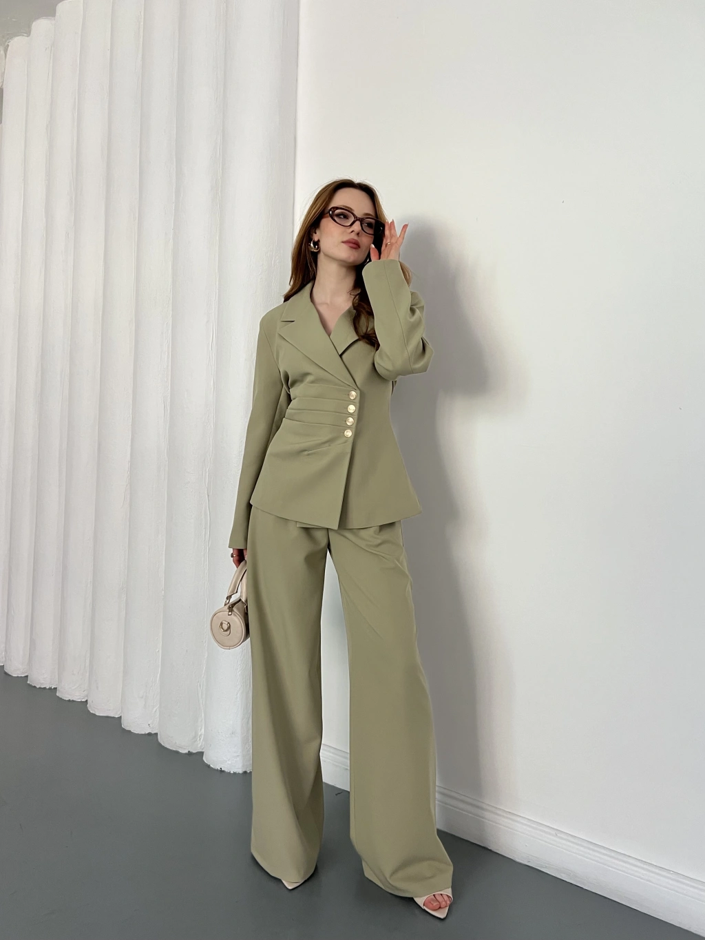 Düğme Detaylı Doublu Kumaş Tasarım Takım Yeşil