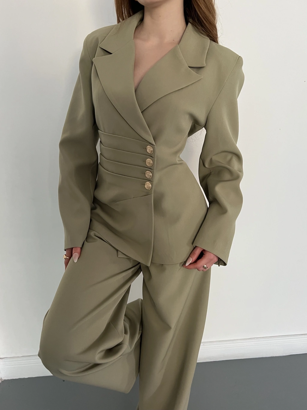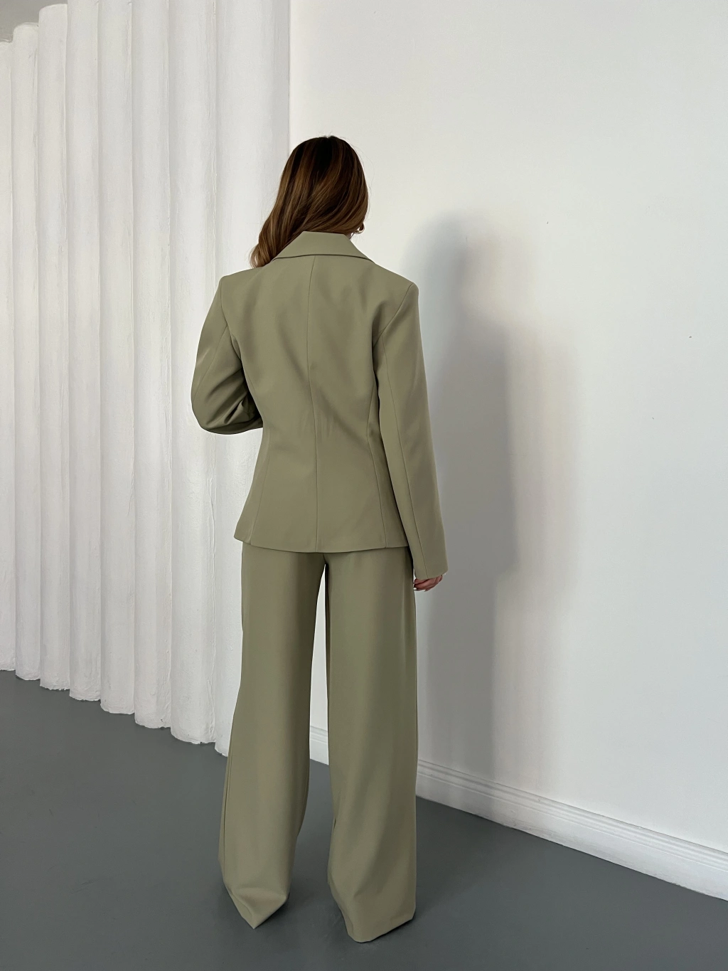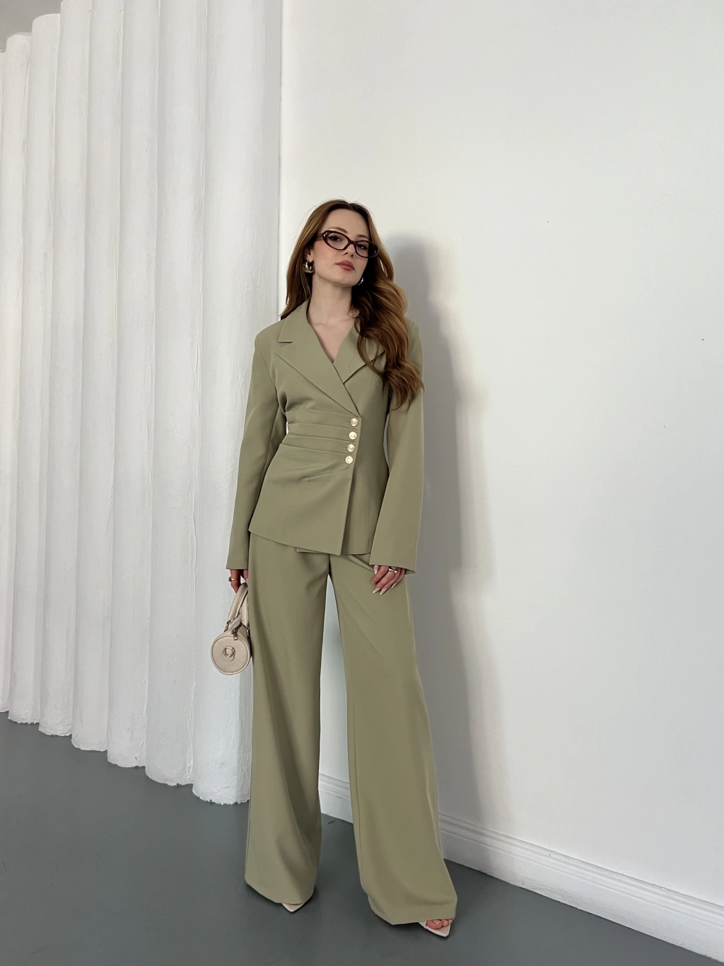 Düğme Detaylı Doublu Kumaş Tasarım Takım Yeşil