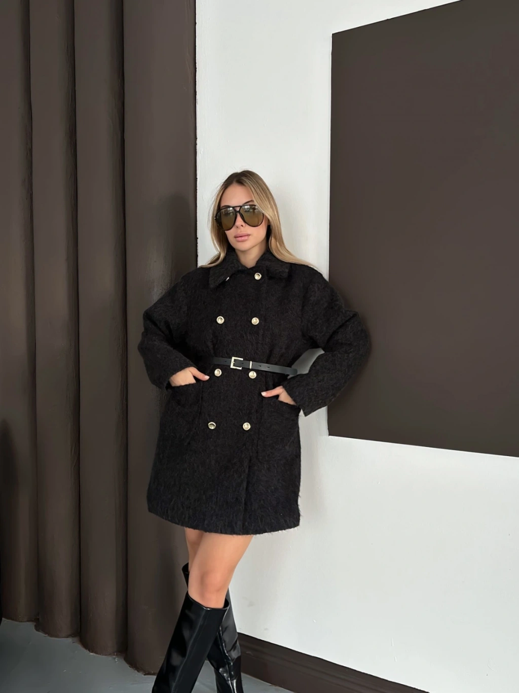 Düğme Detaylı Kemerli Tüylü Kumaş Kaban Siyah