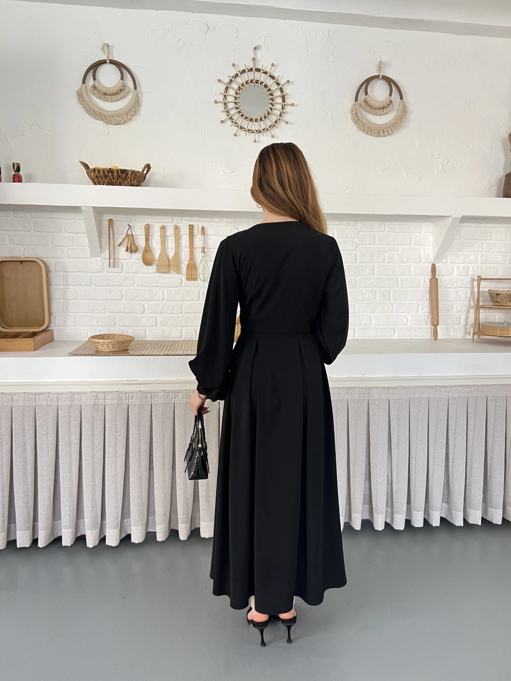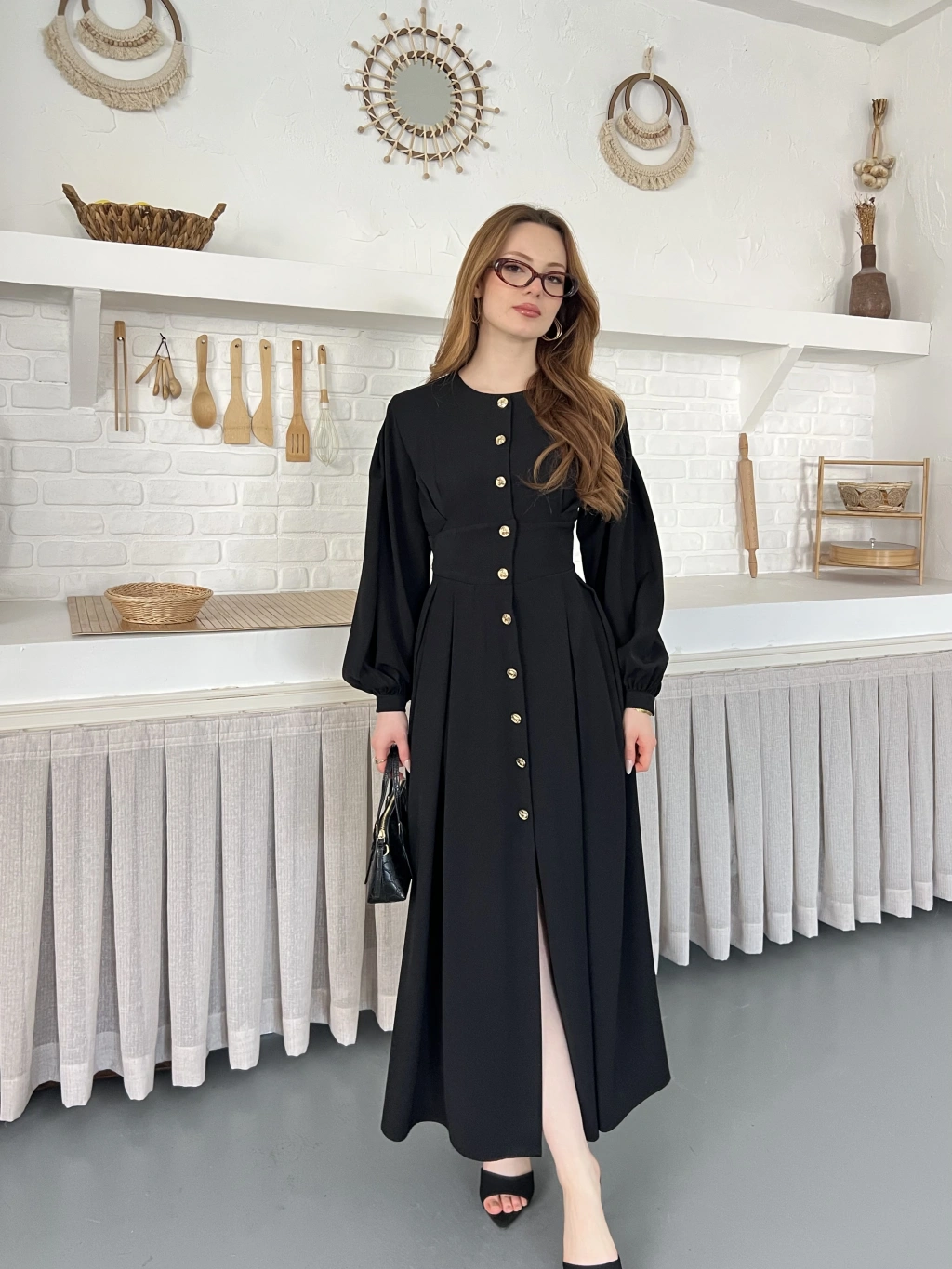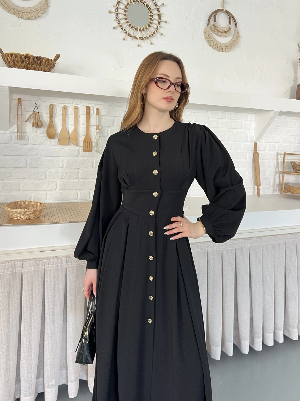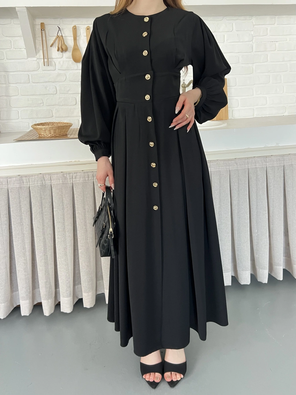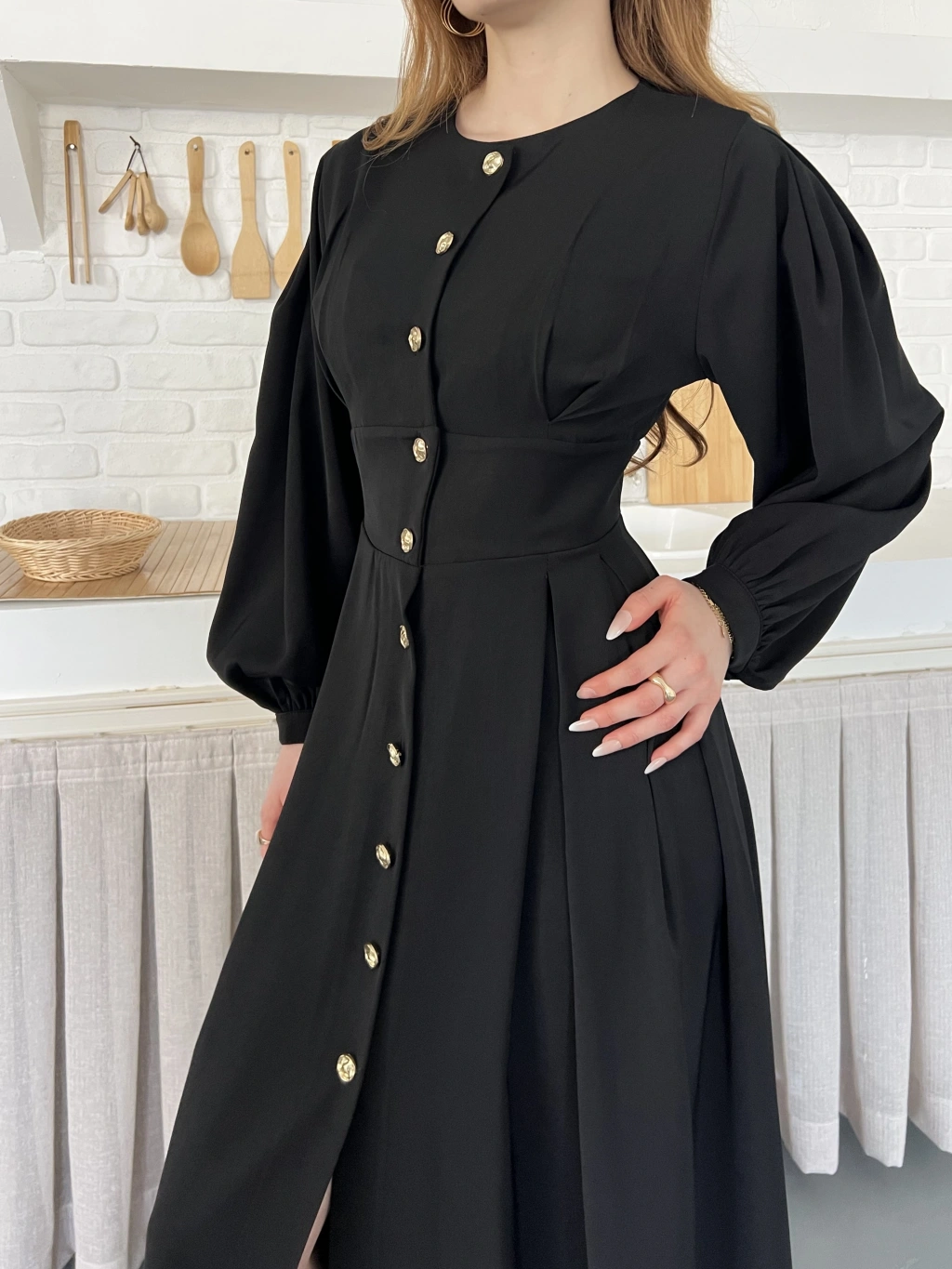 Düğme Detaylı Uzun Zarif Gömlek Elbise Siyah