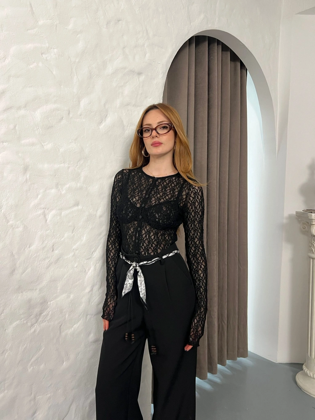 Düğmeli Transparan Bluz Siyah