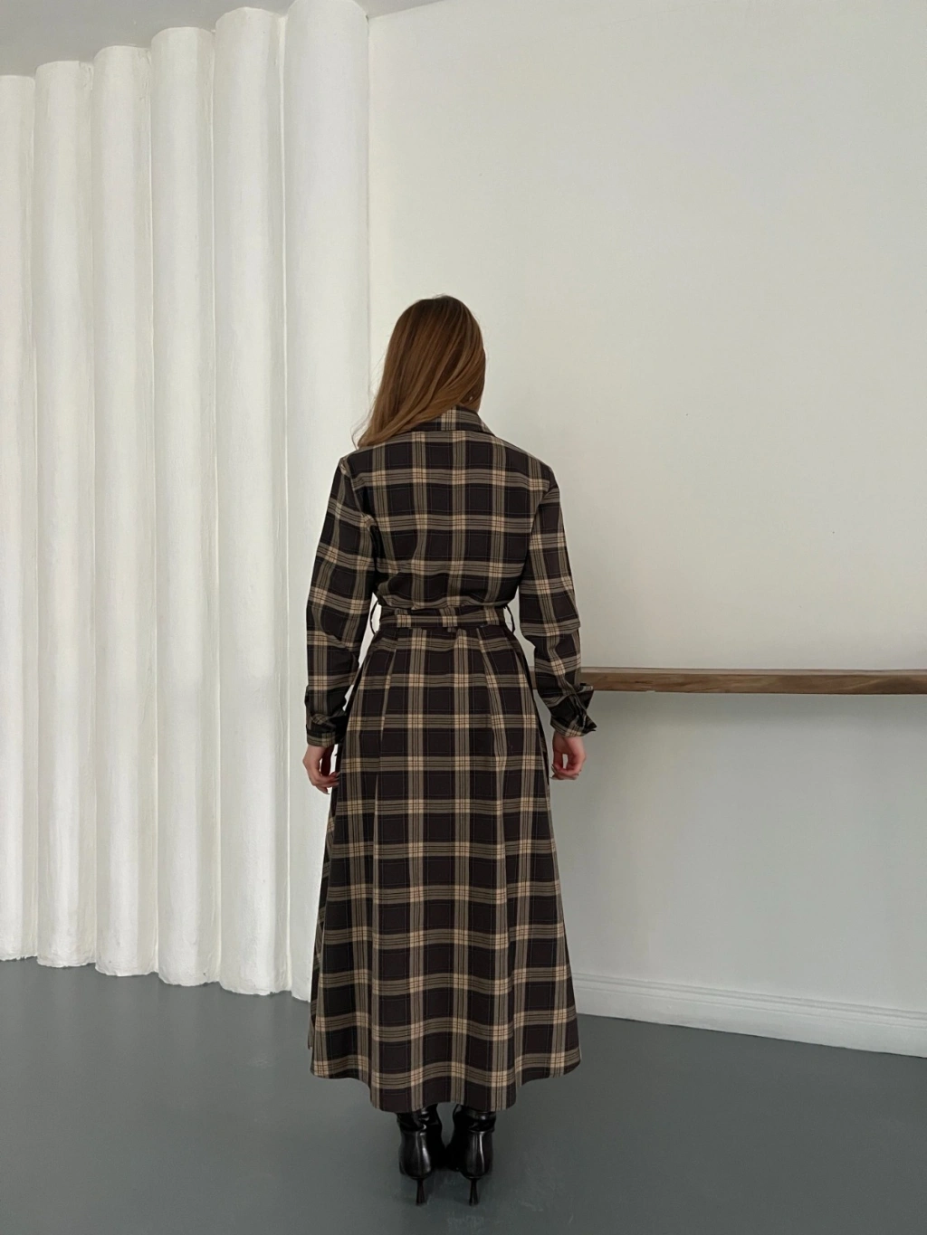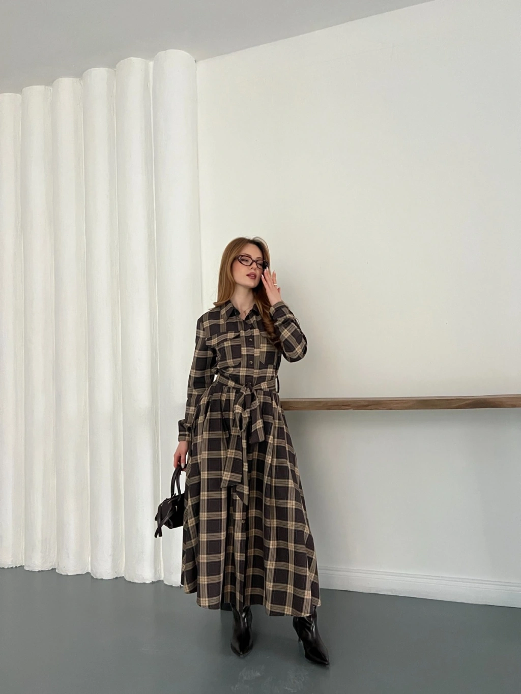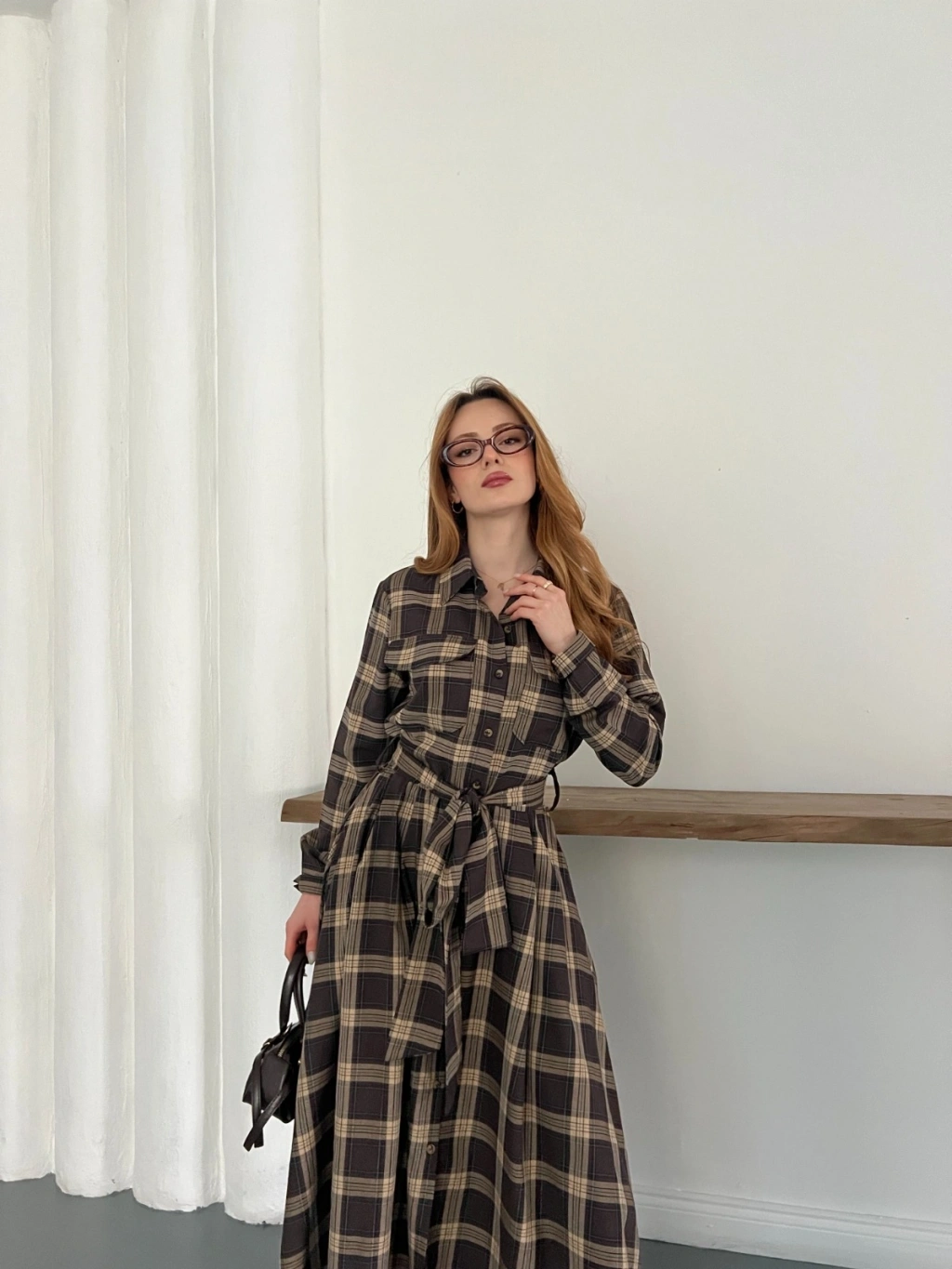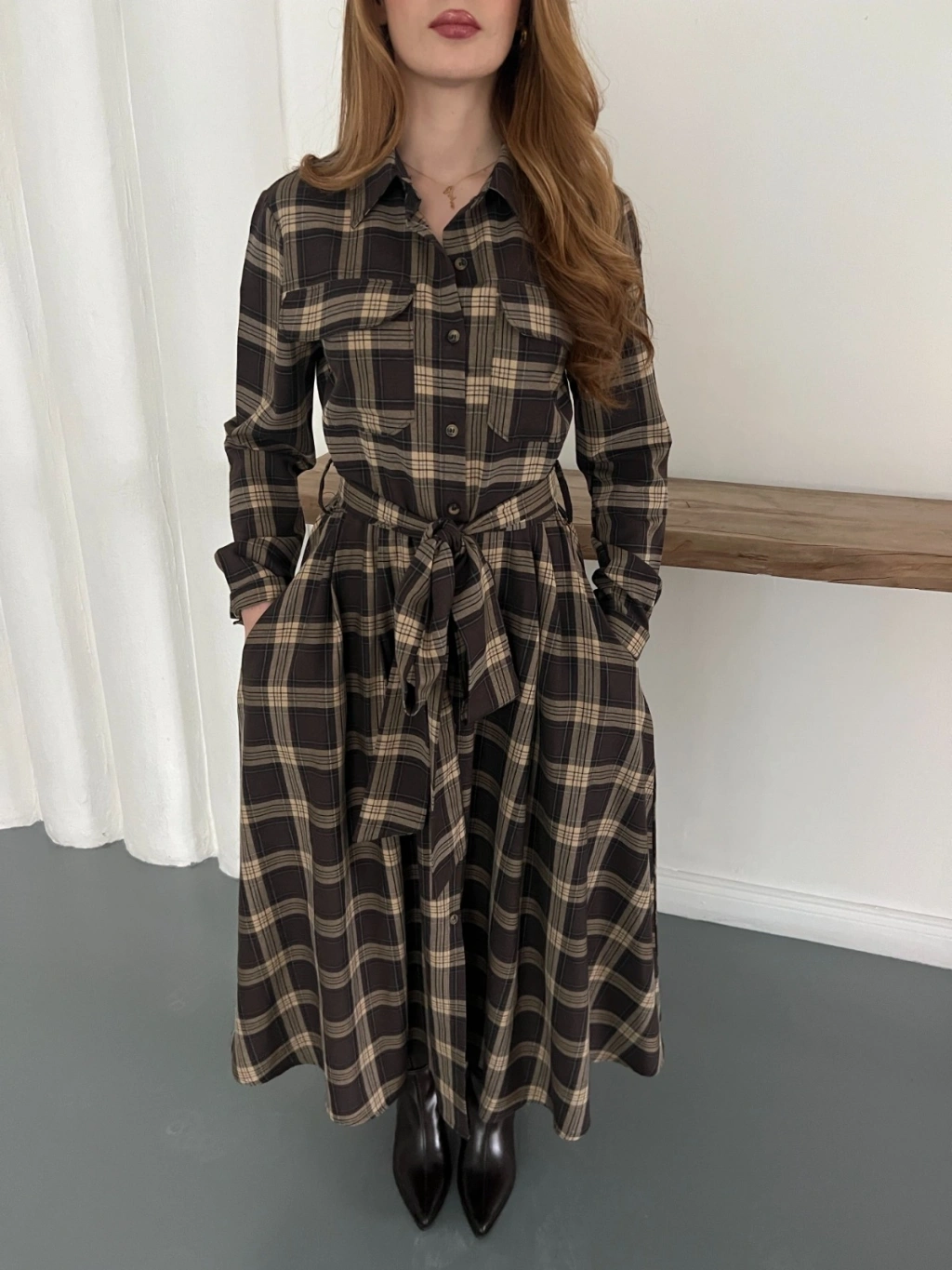 Ekose Belden Bağlamalı Gömlek Elbise