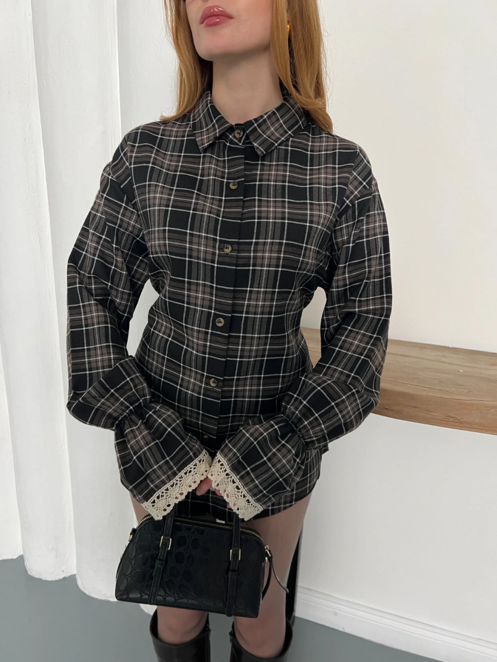 Ekose Dantel Detay Kol Büzgülü Gömlek