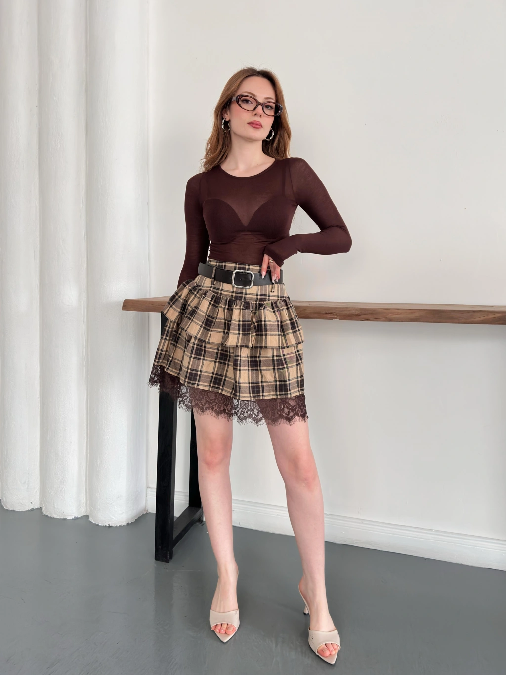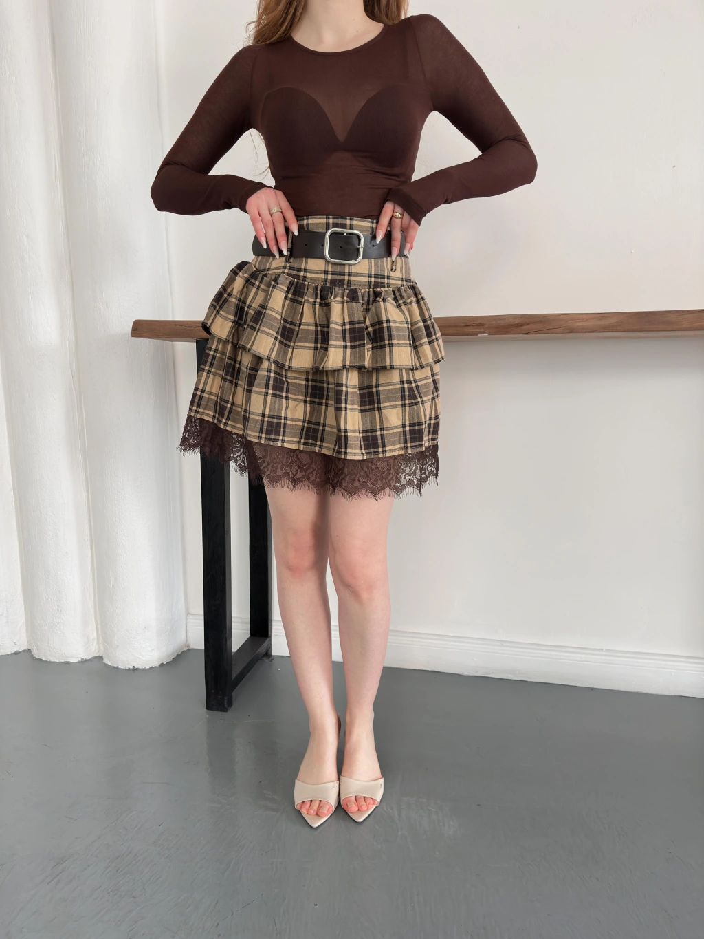 Ekose Dantel Detaylı Kemerli Etek Bej
