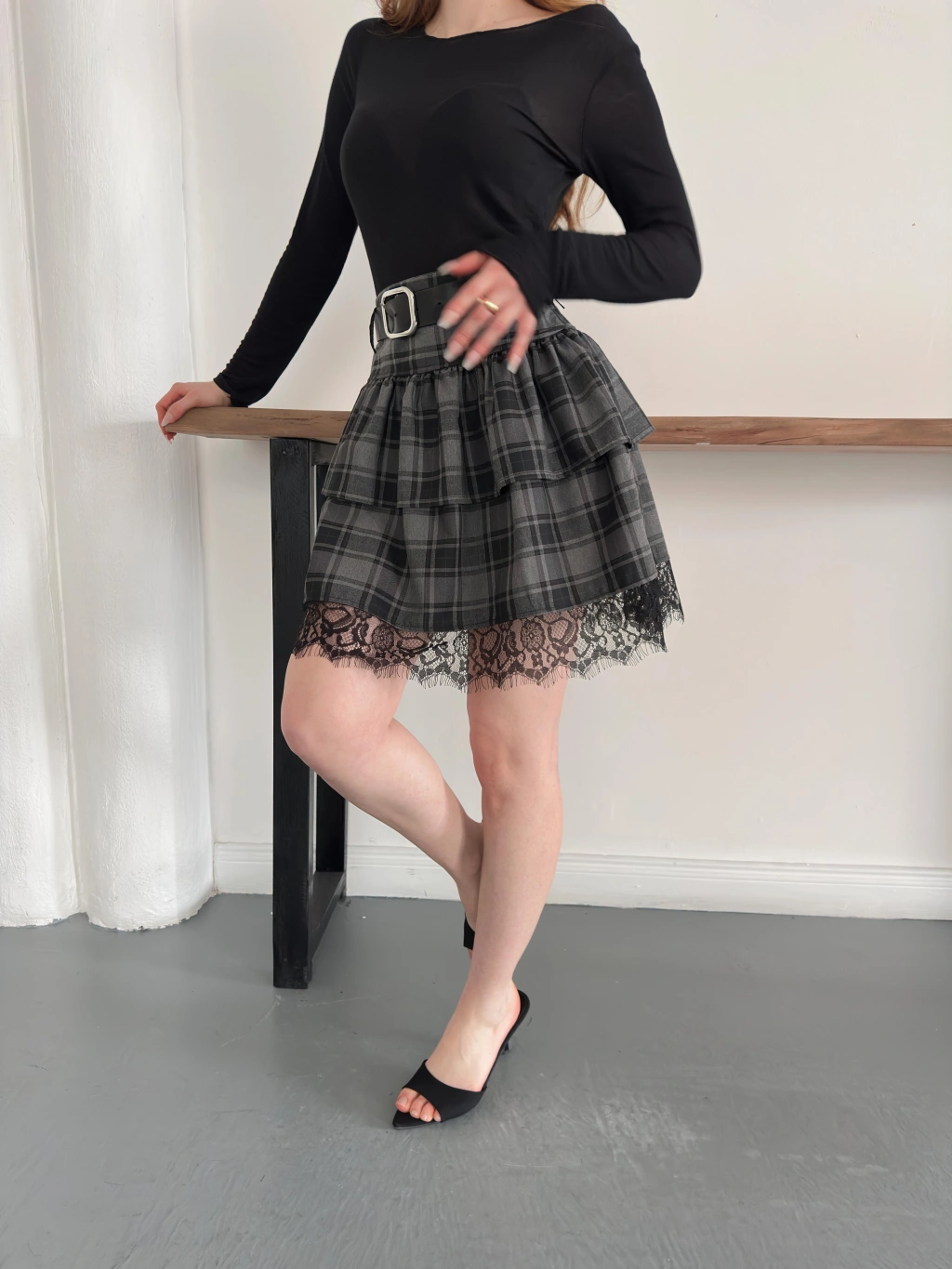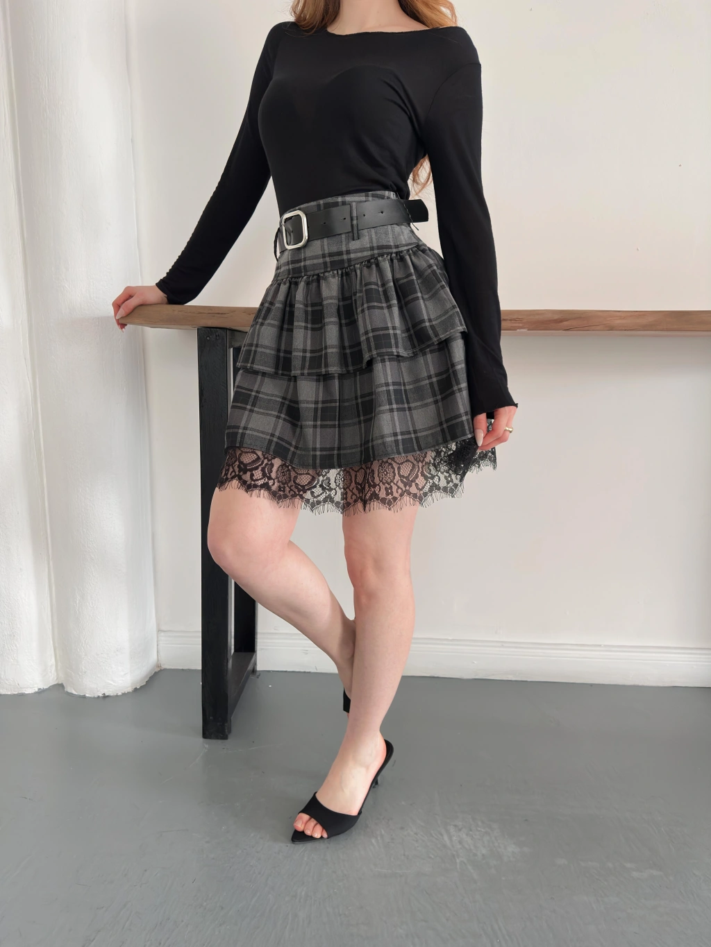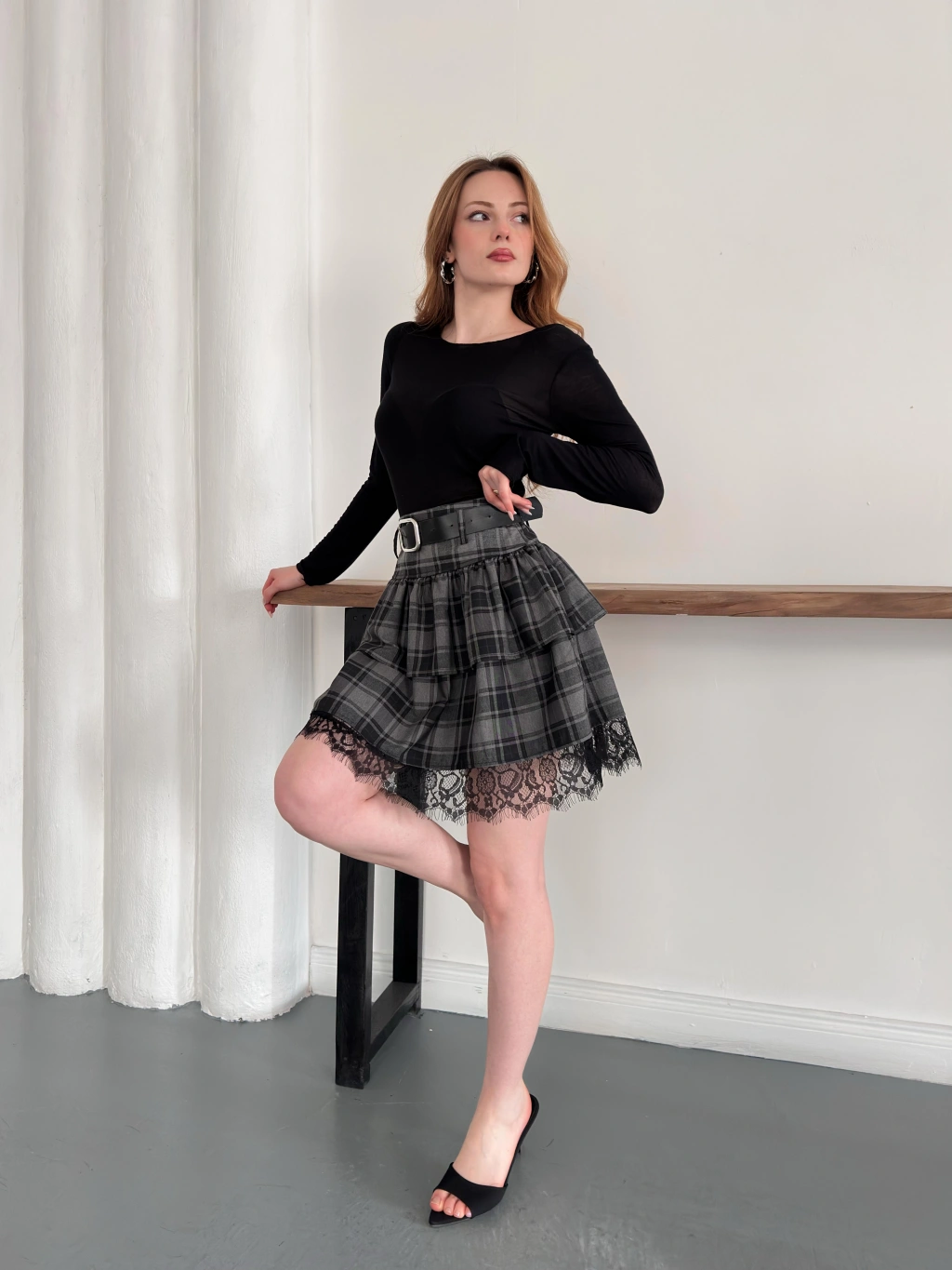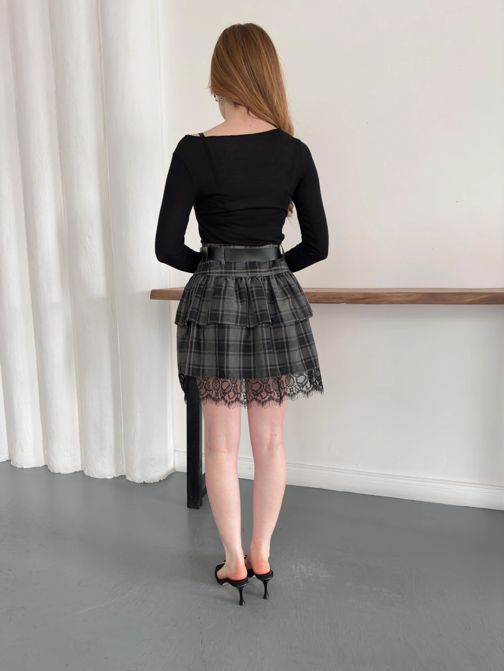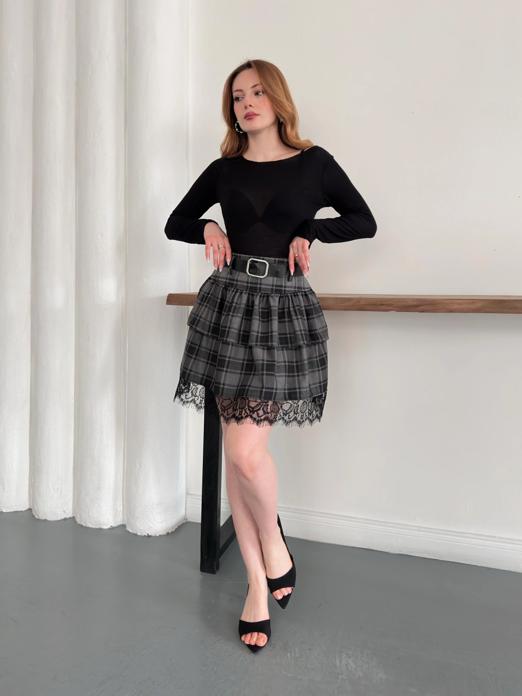 Ekose Dantel Detaylı Kemerli Etek Siyah