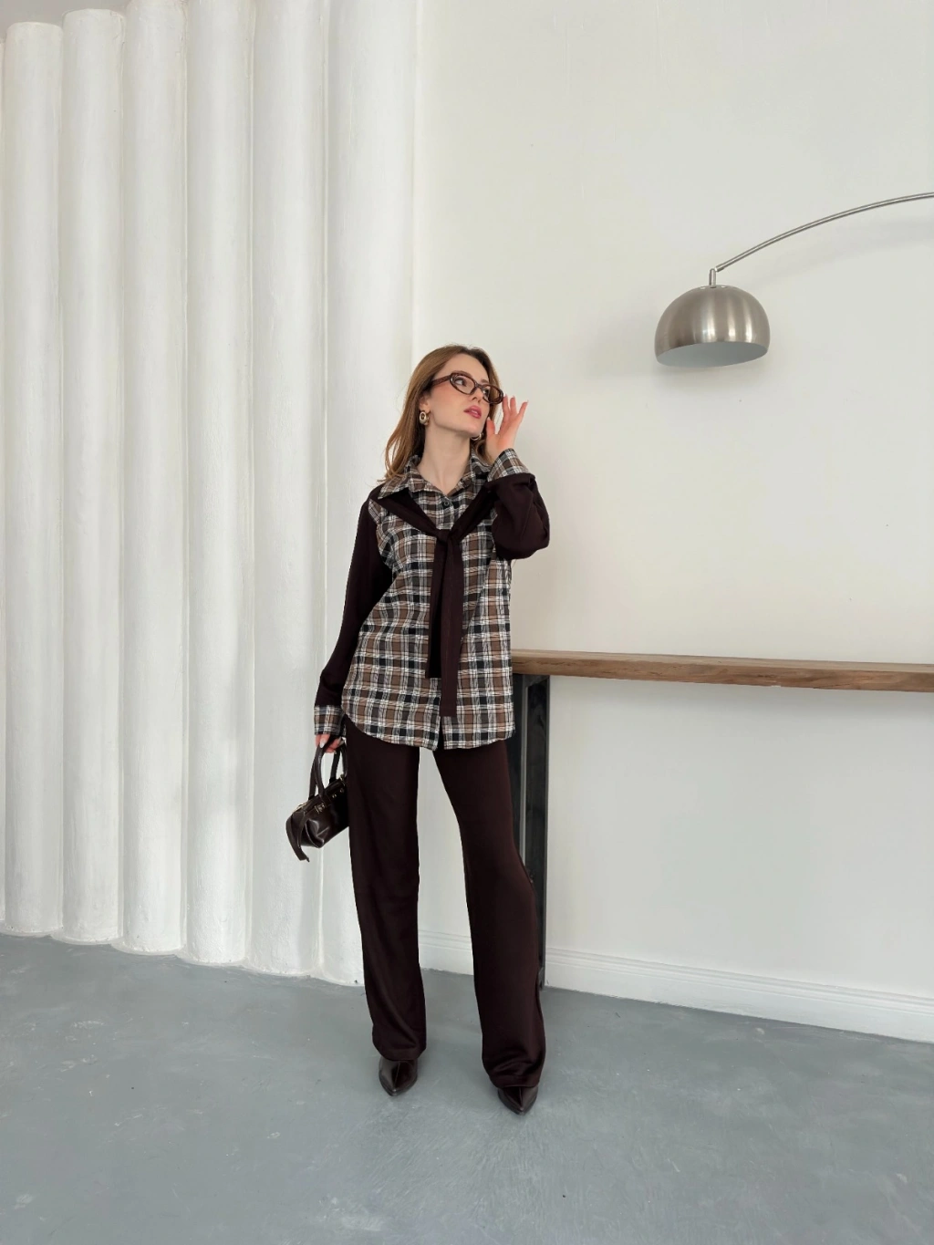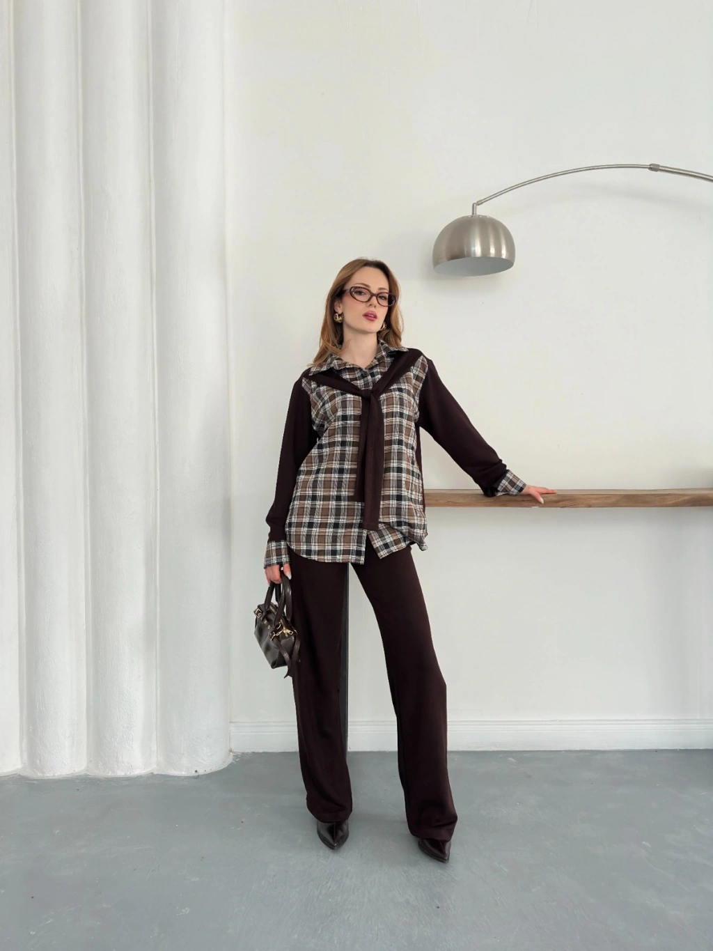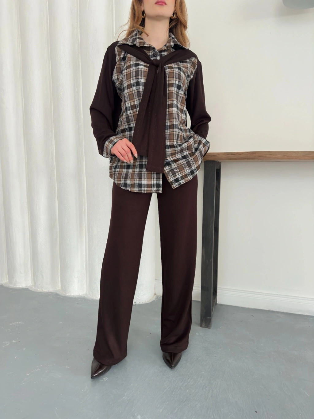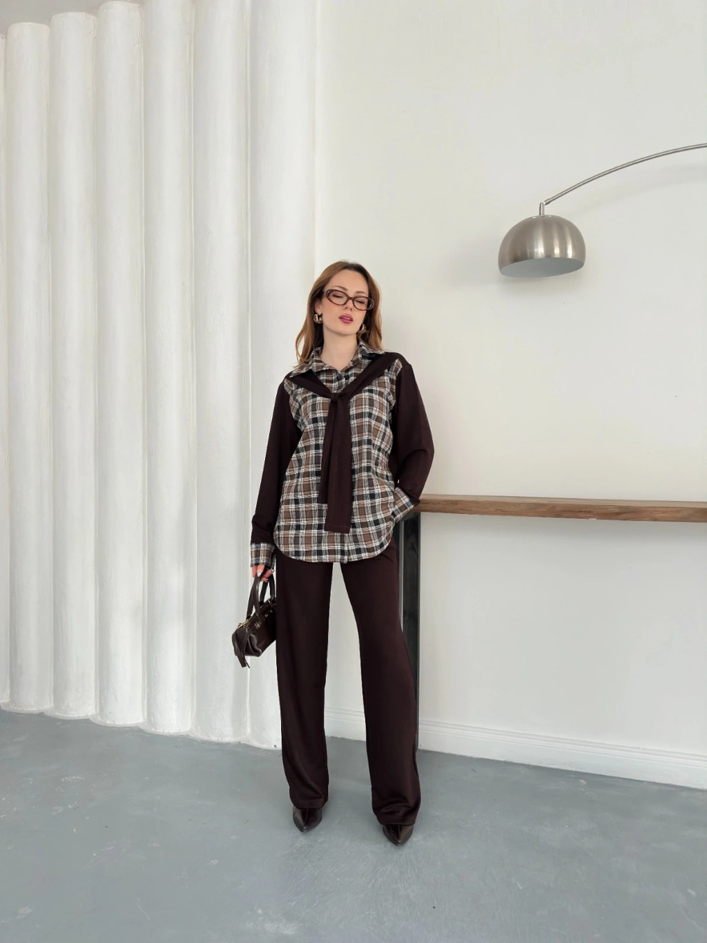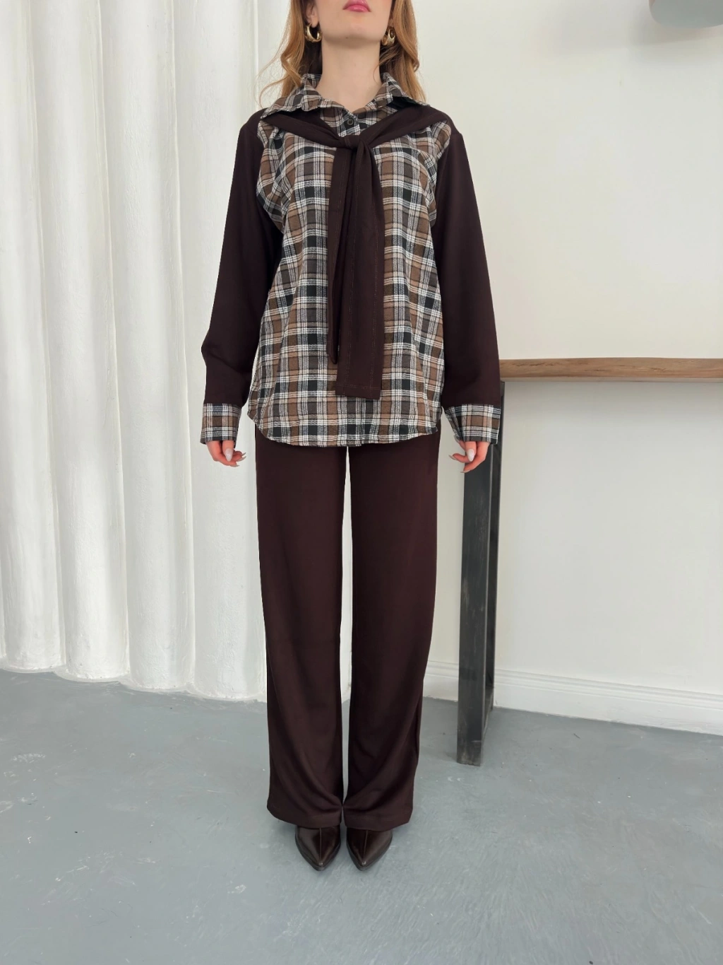 Ekose Detaylı Bağlama Yaka Pantolonlu Takım Kahve