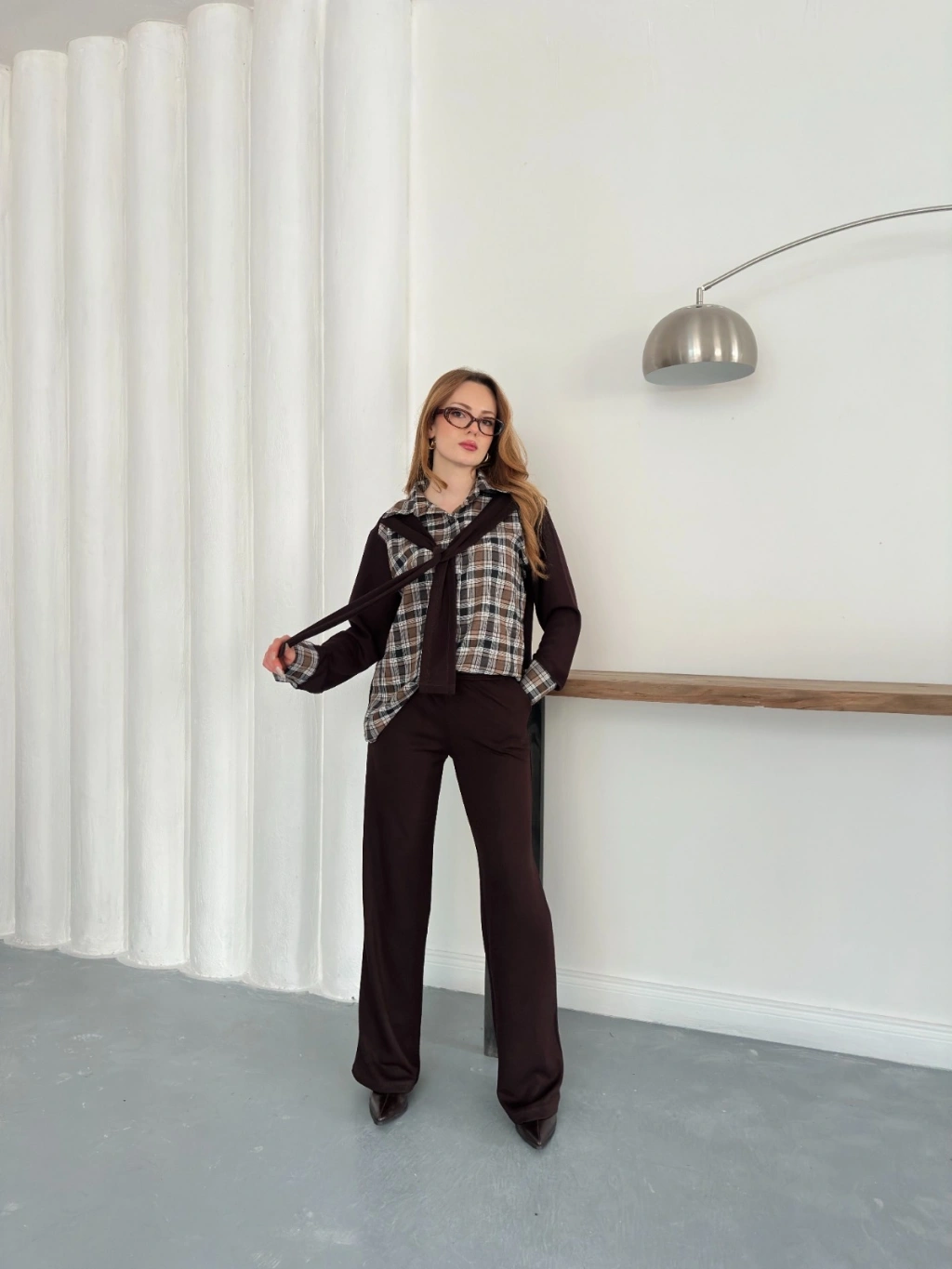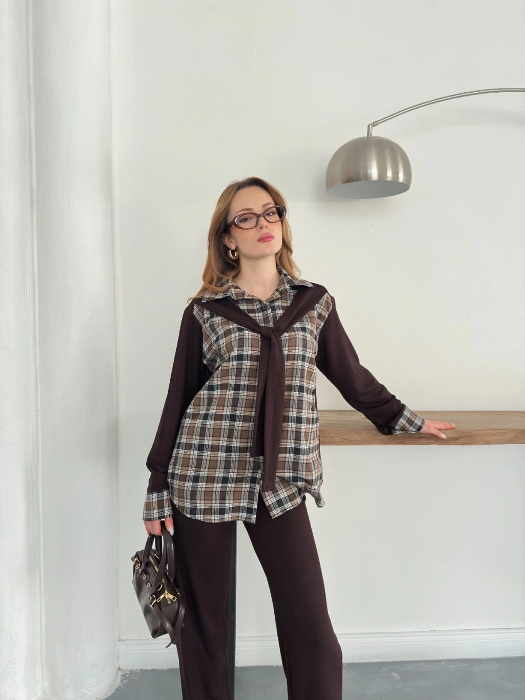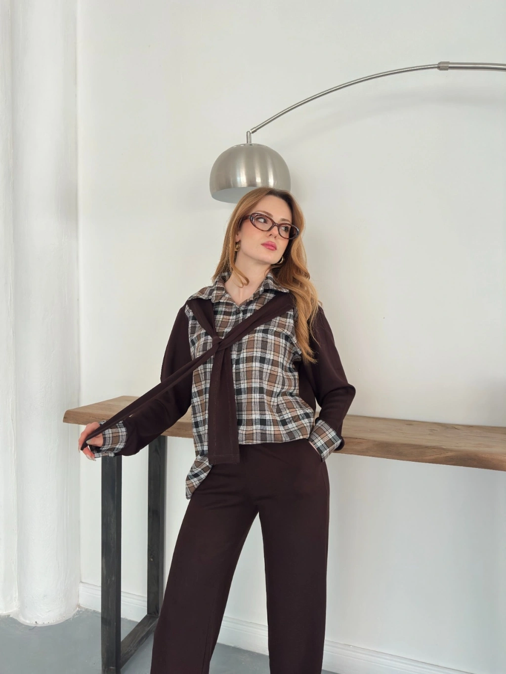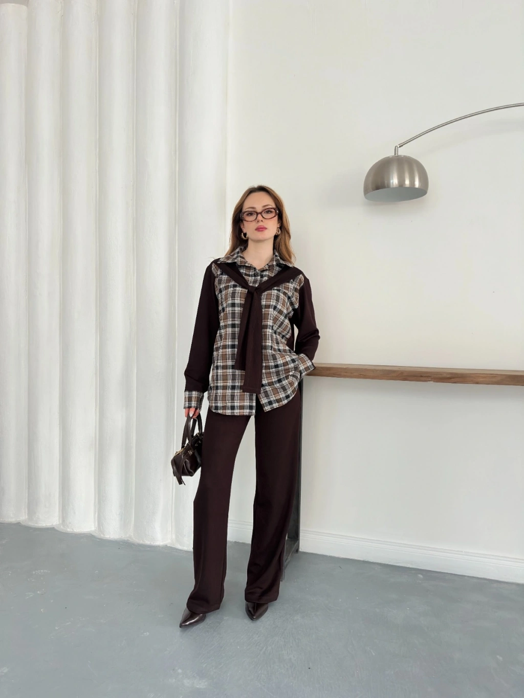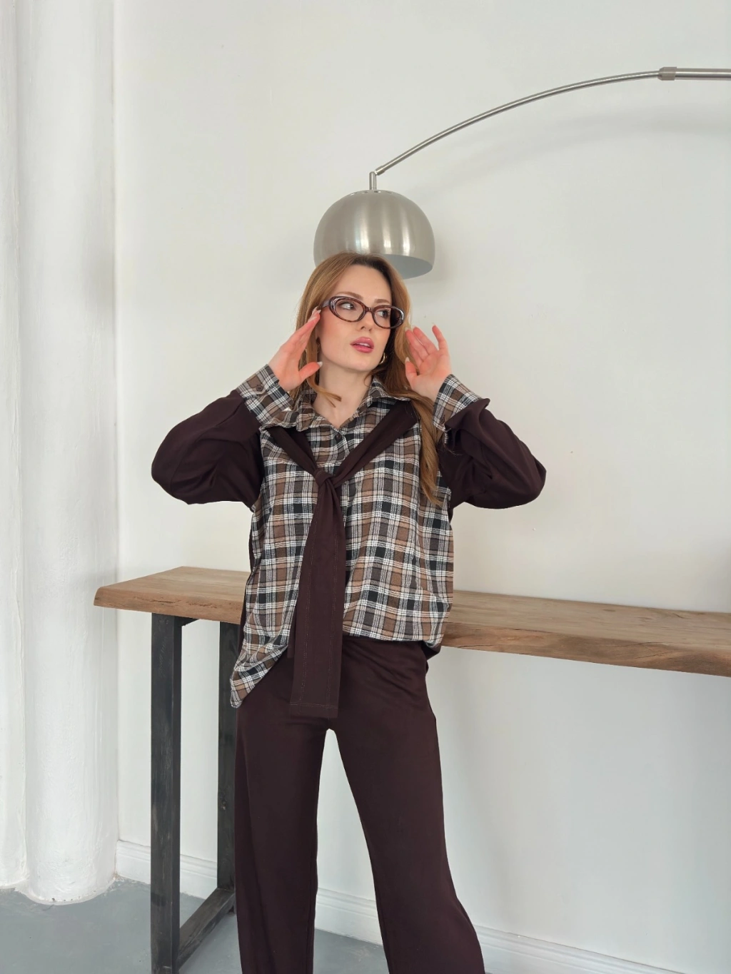 Ekose Detaylı Bağlama Yaka Pantolonlu Takım Kahve