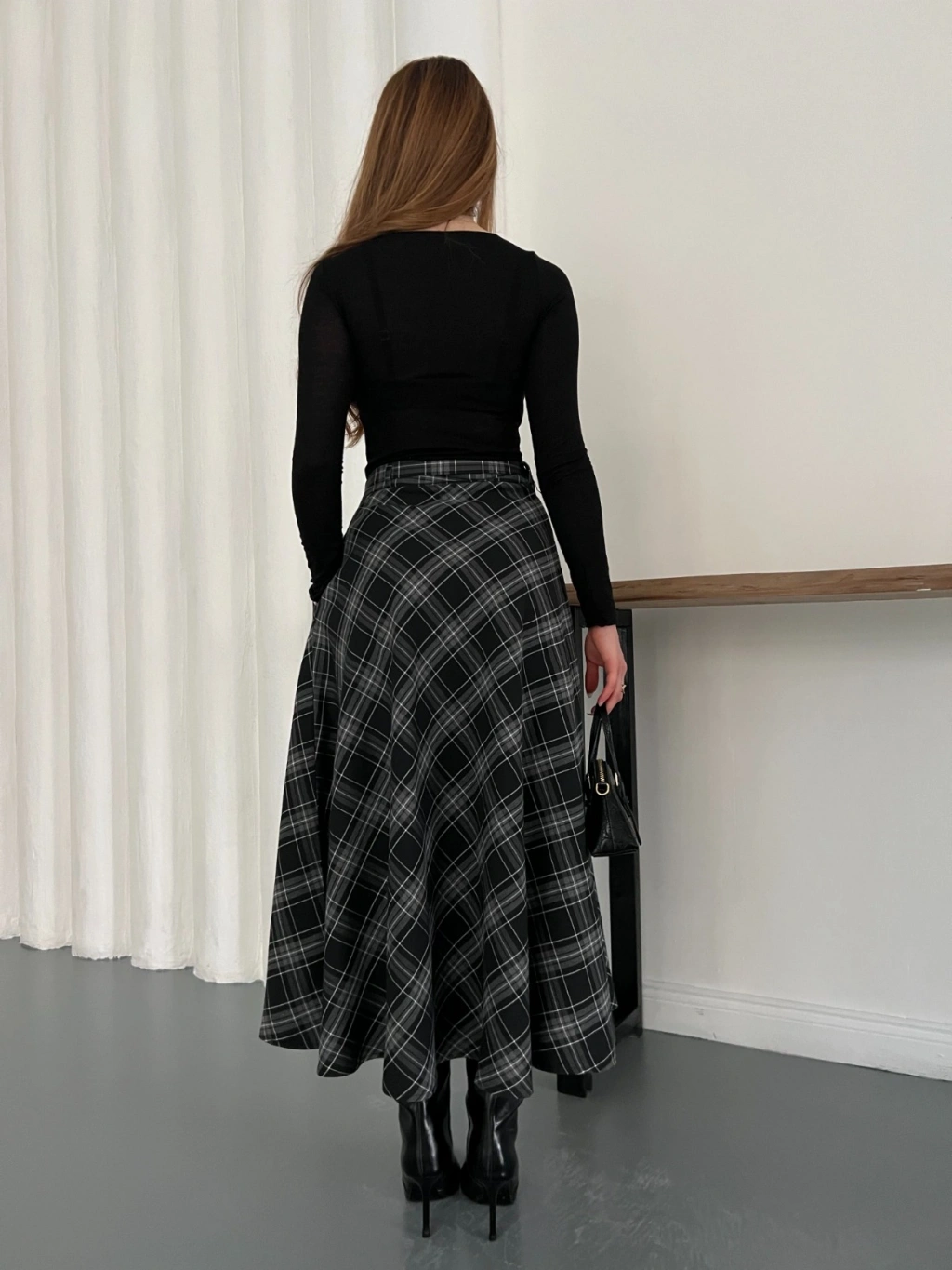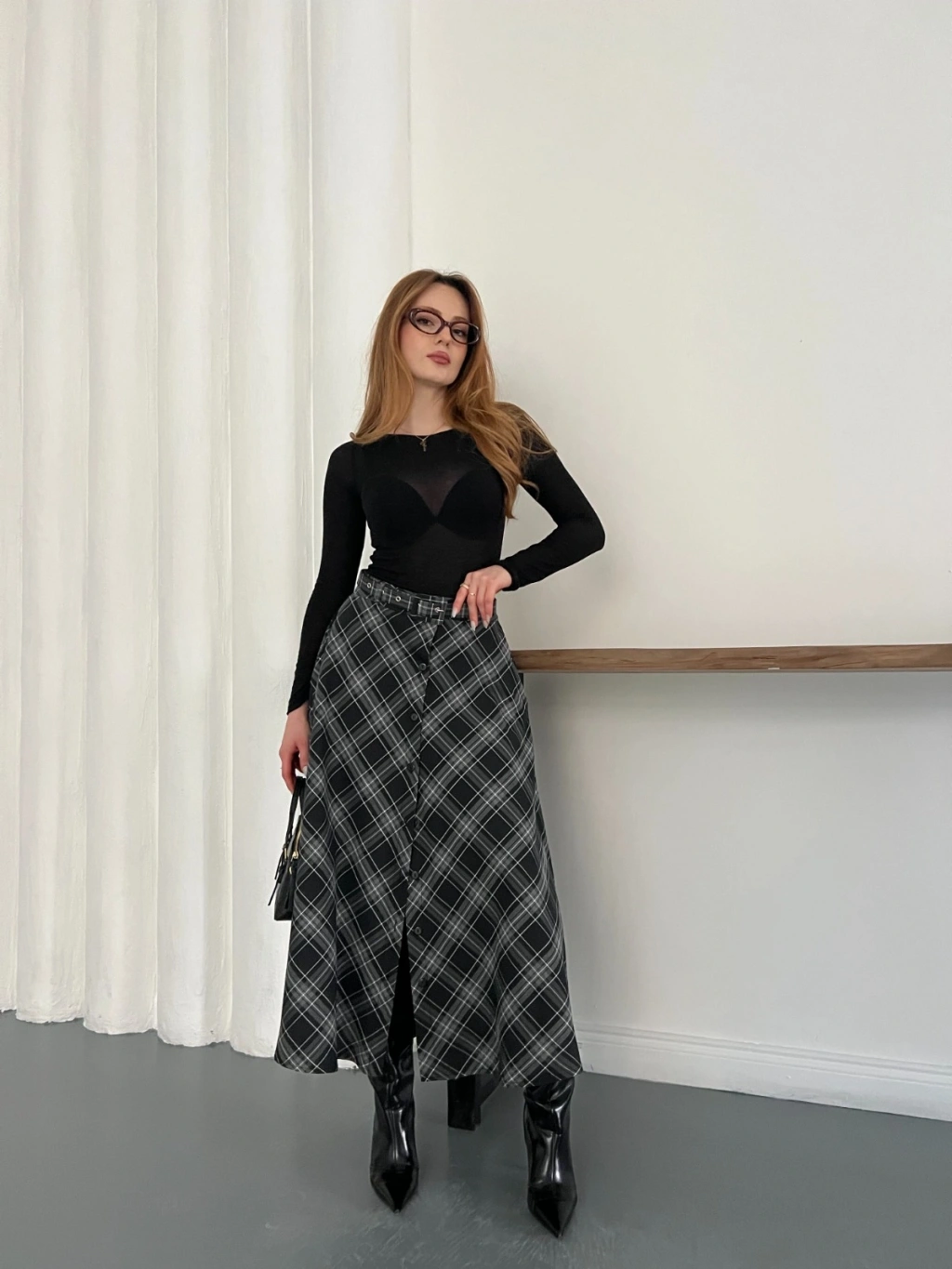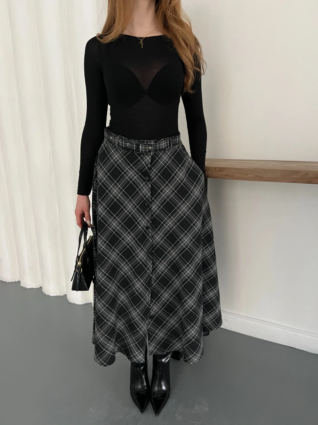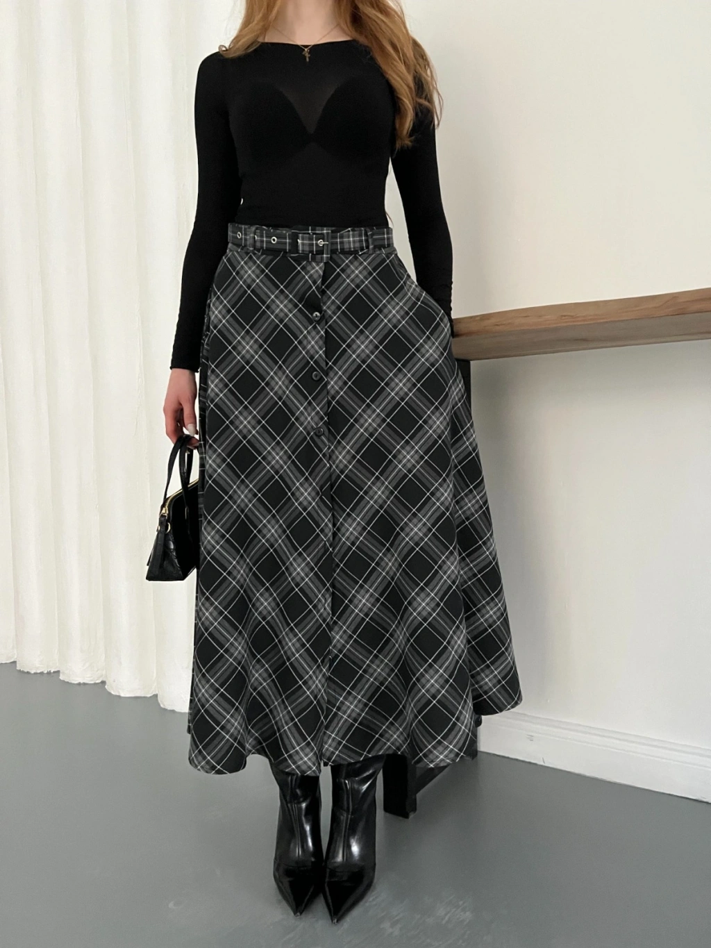 Ekose Kemerli Düğme Detaylı Etek