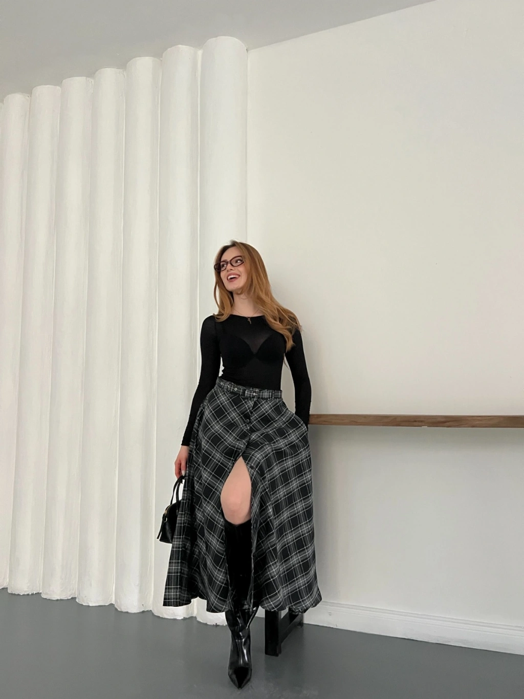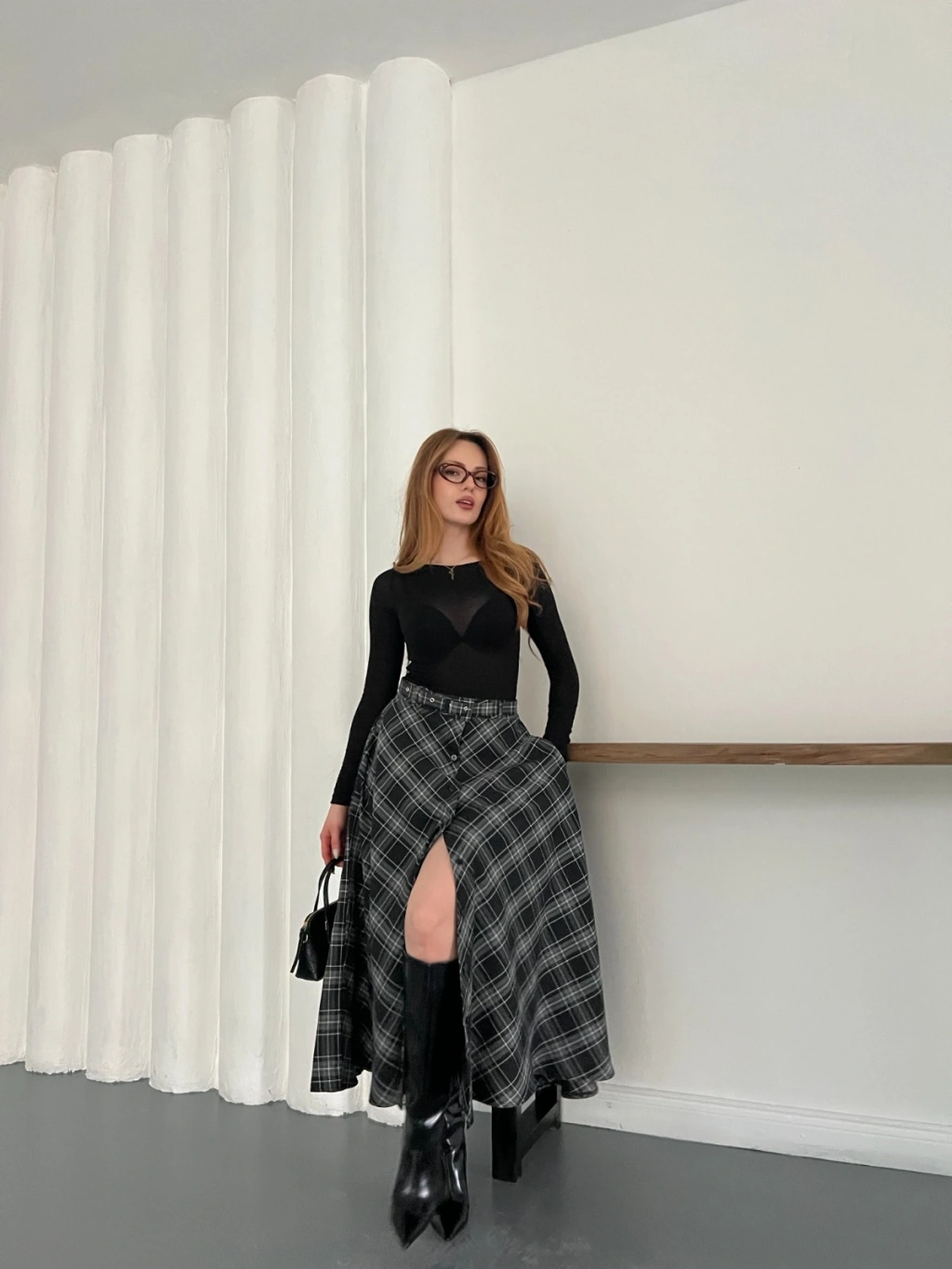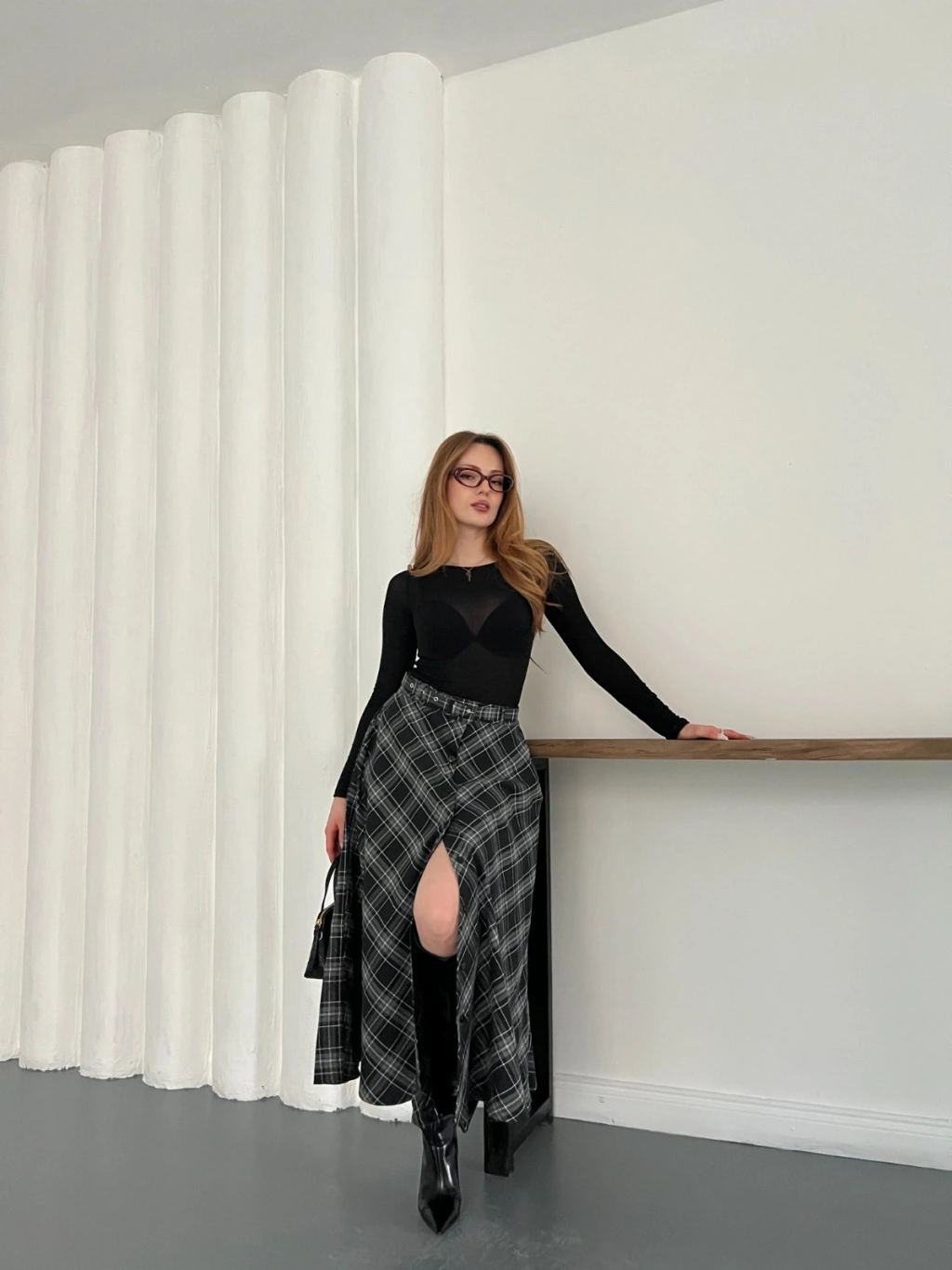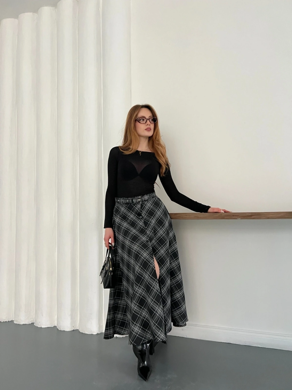 Ekose Kemerli Düğme Detaylı Etek