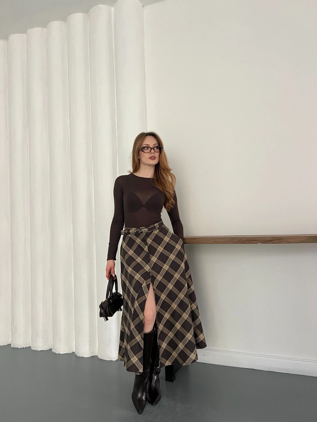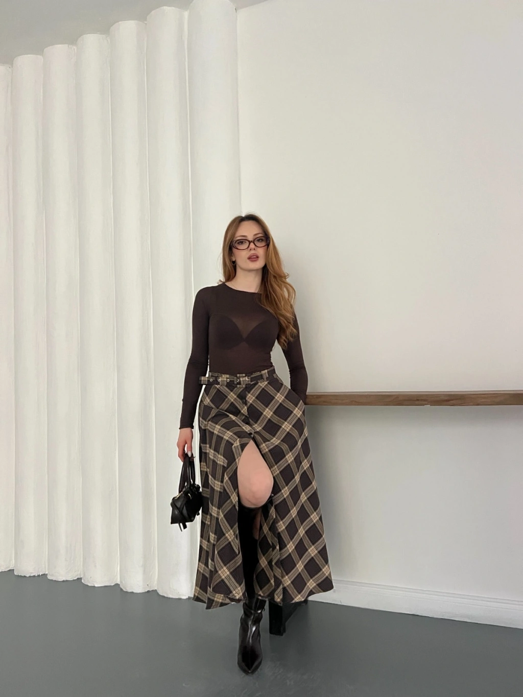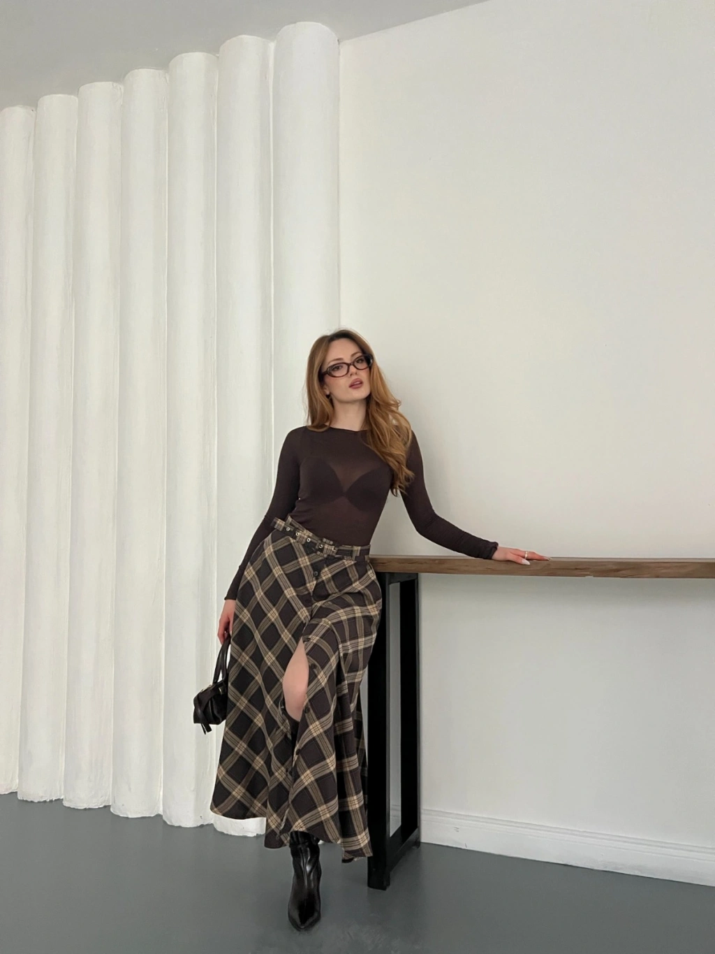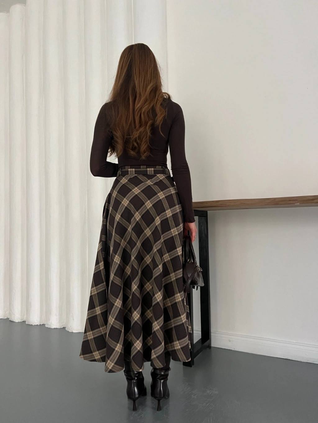 Ekose Kemerli Düğme Detaylı Etek Kahve