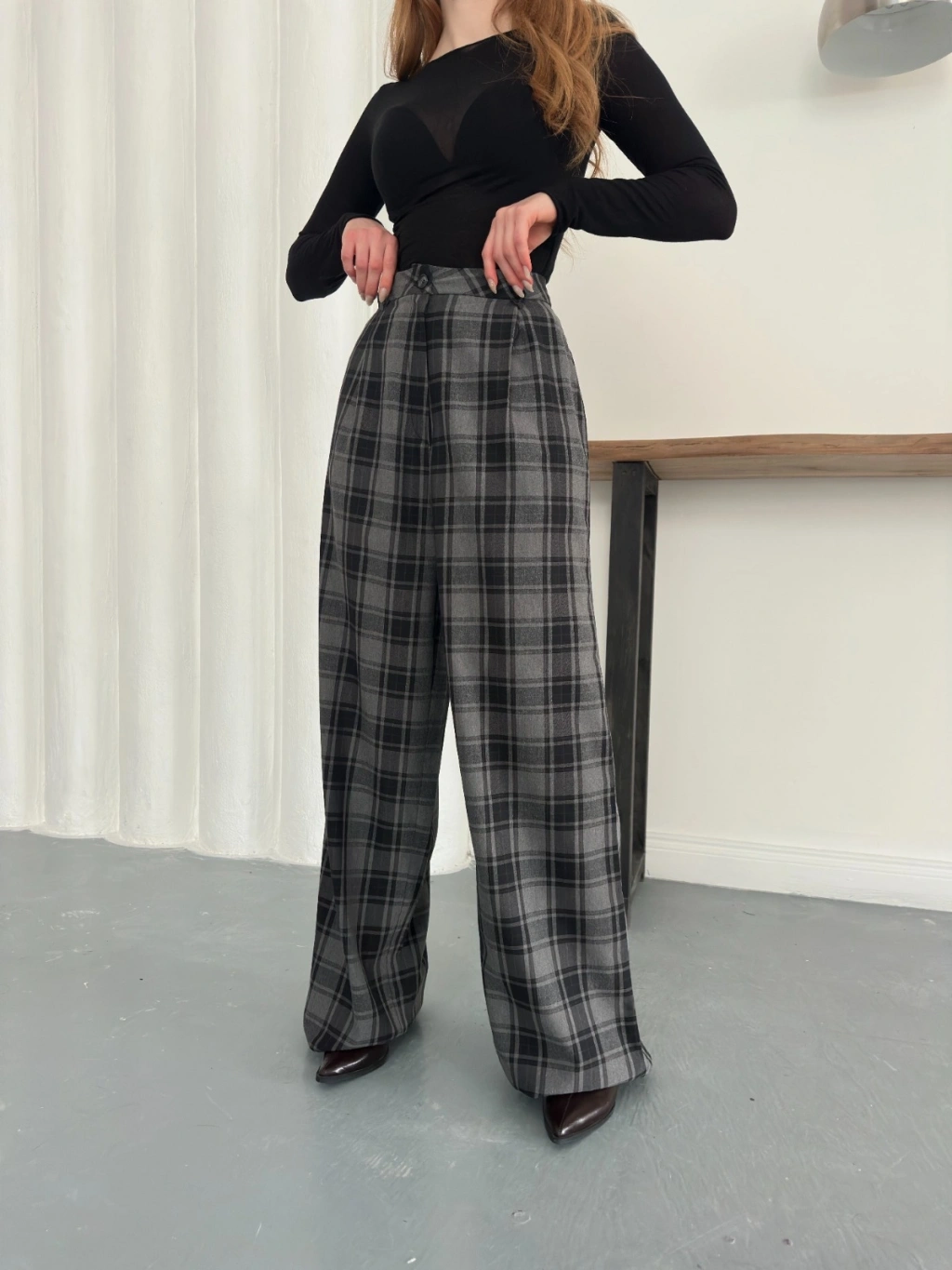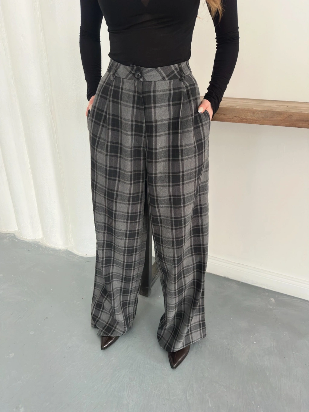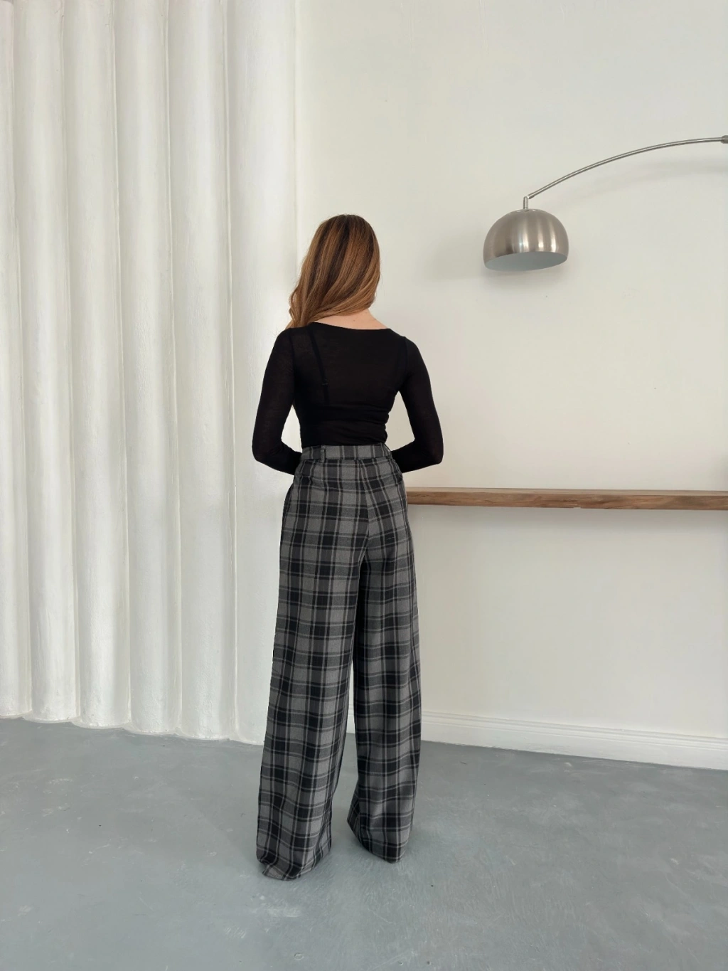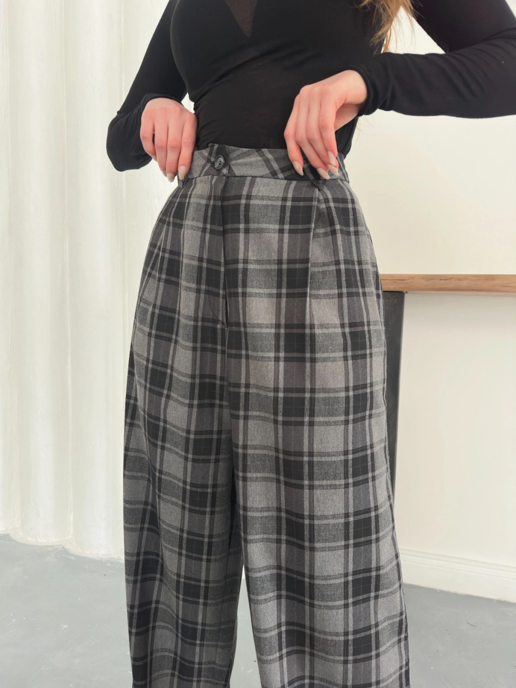 Ekose Yüksek Bel Bol Paça Pantolon Antrasit