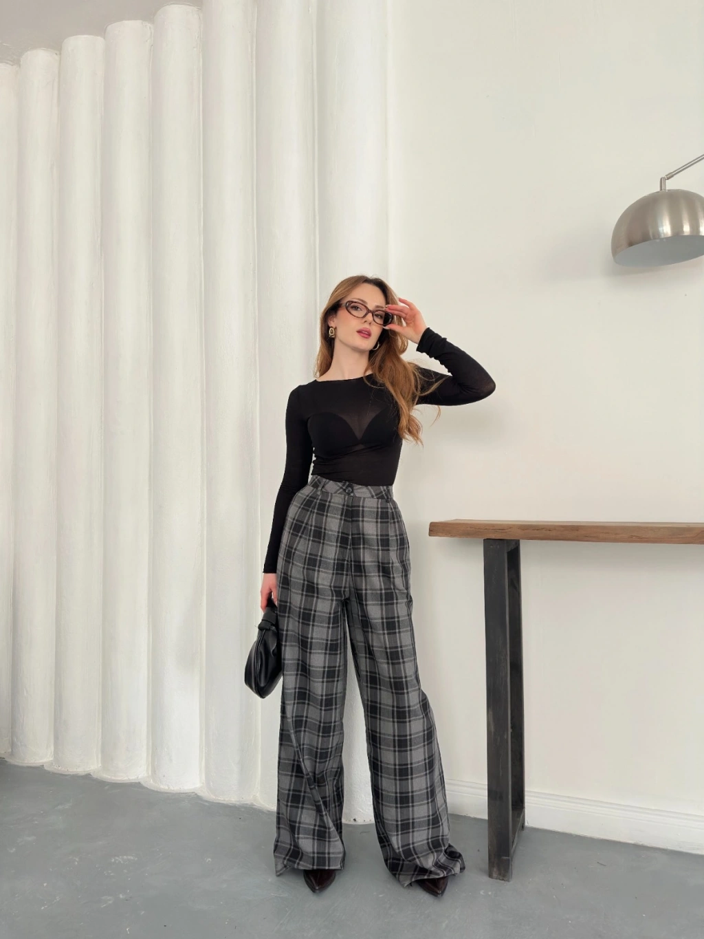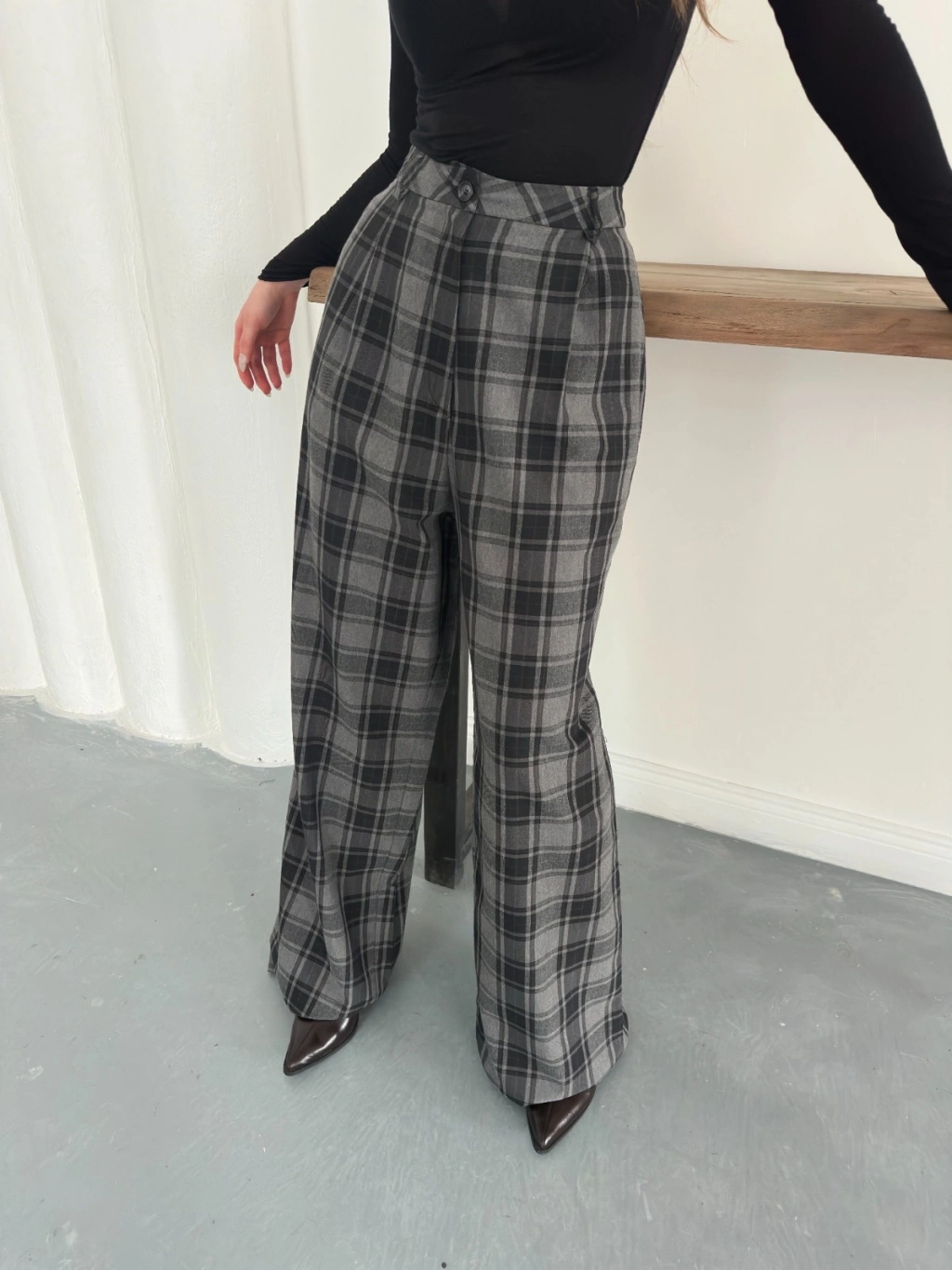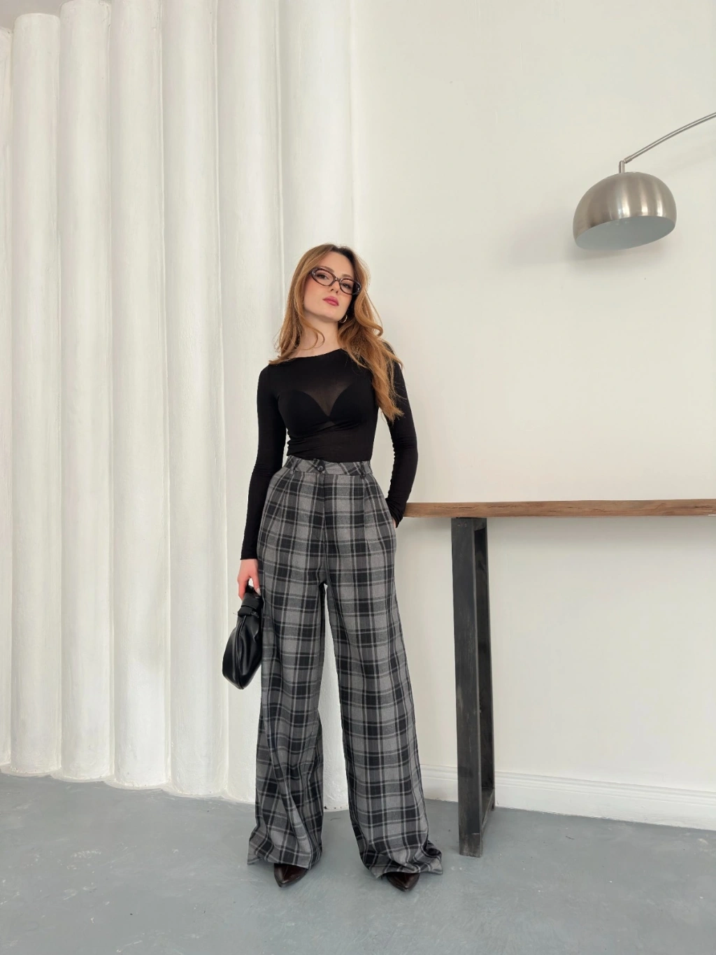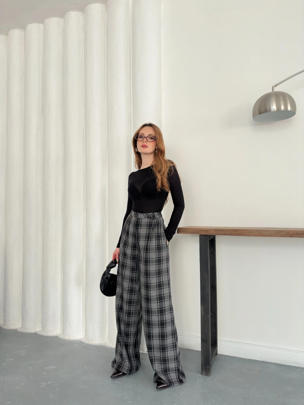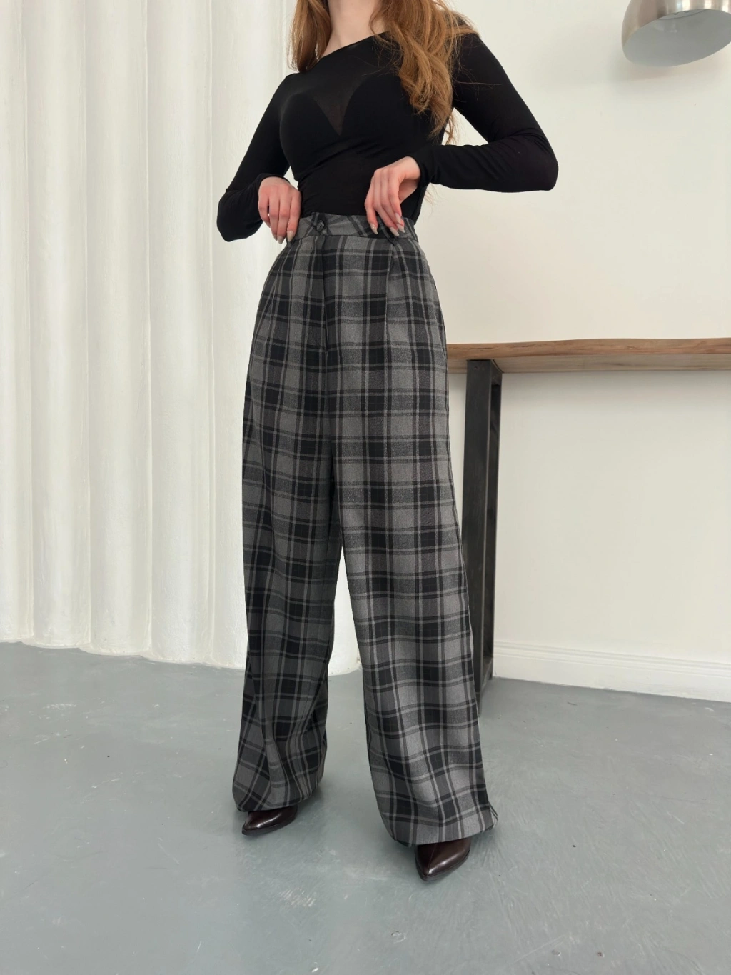 Ekose Yüksek Bel Bol Paça Pantolon Antrasit