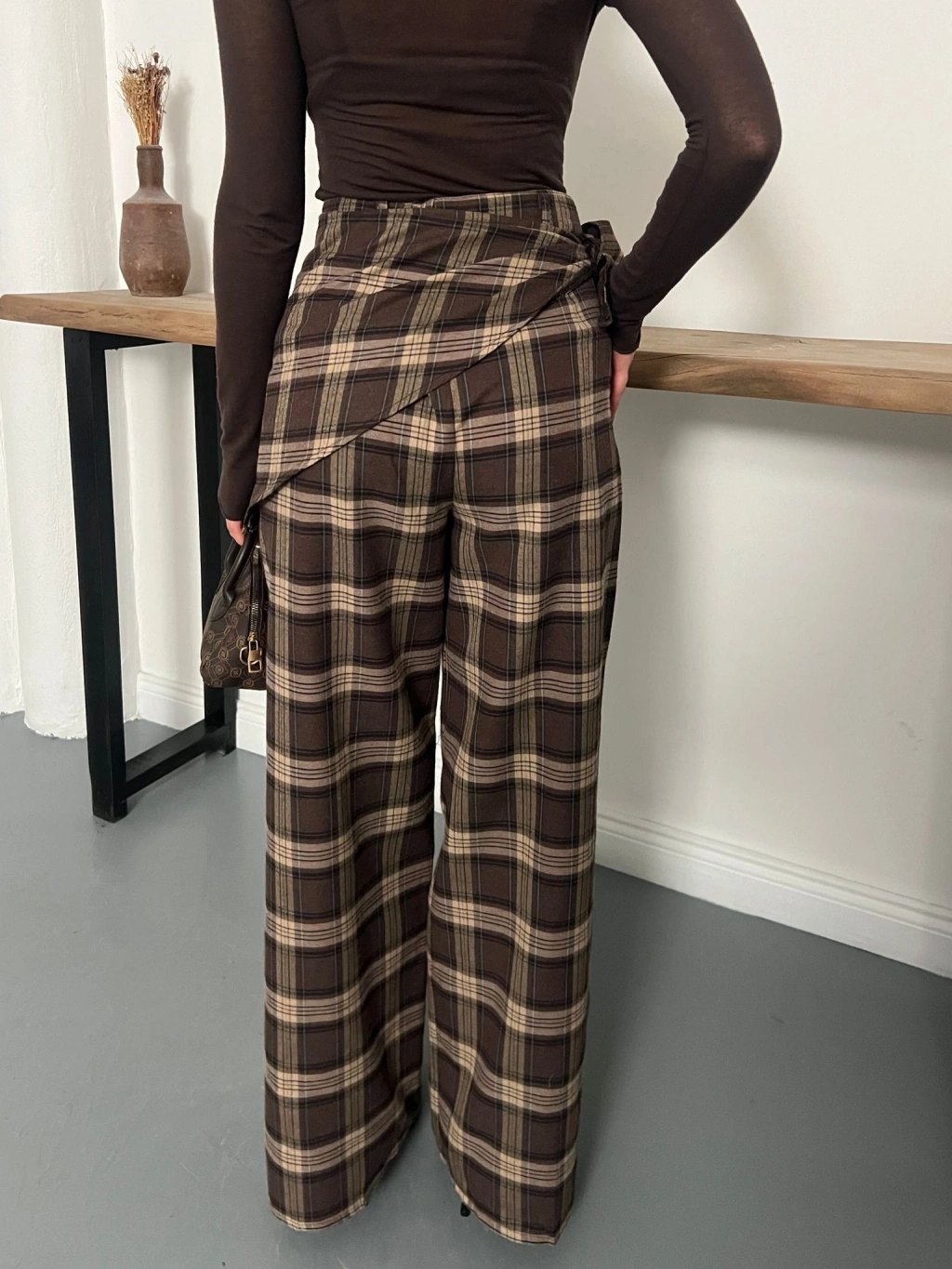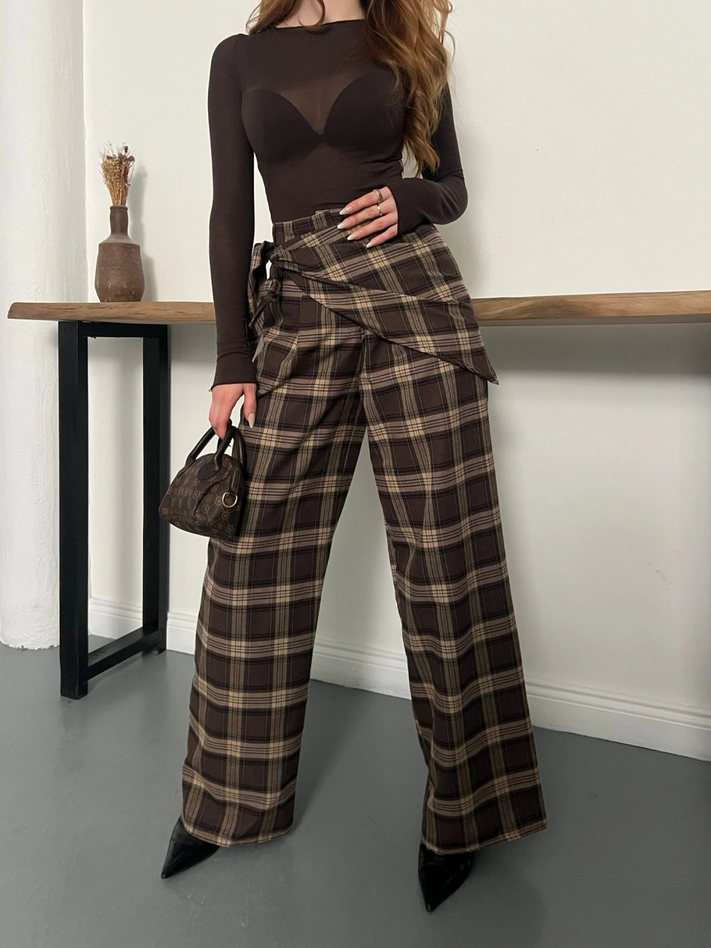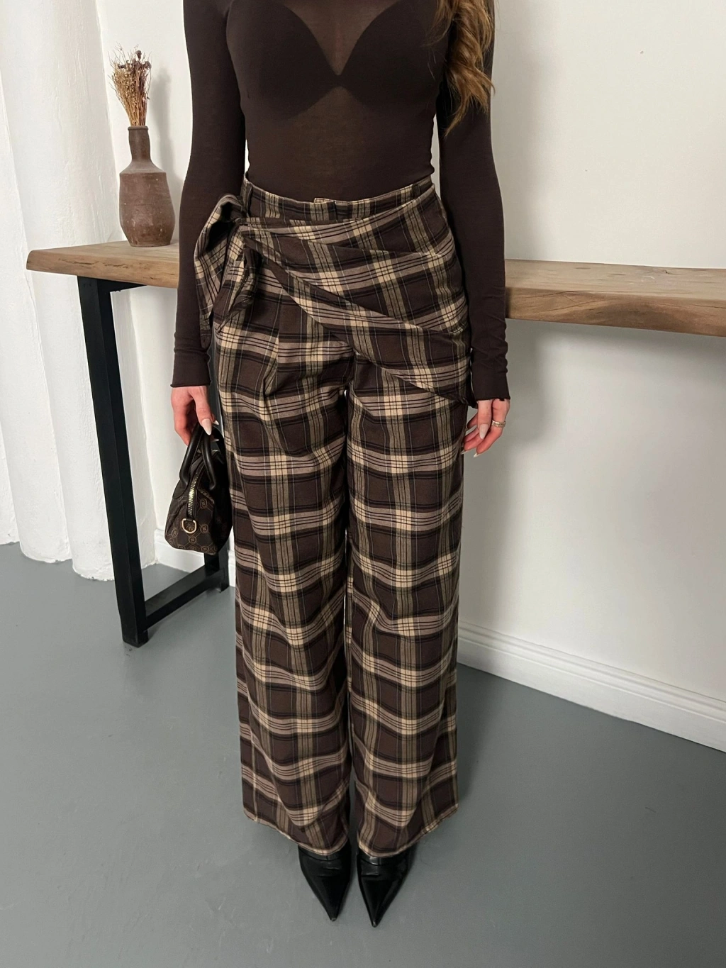 Ekose Yüksek Bel Fularlı Pantolon Kahve