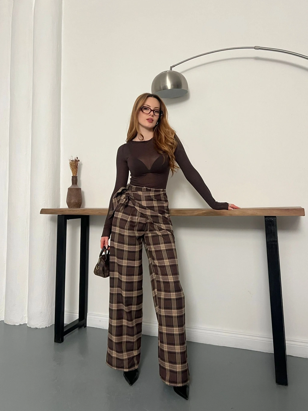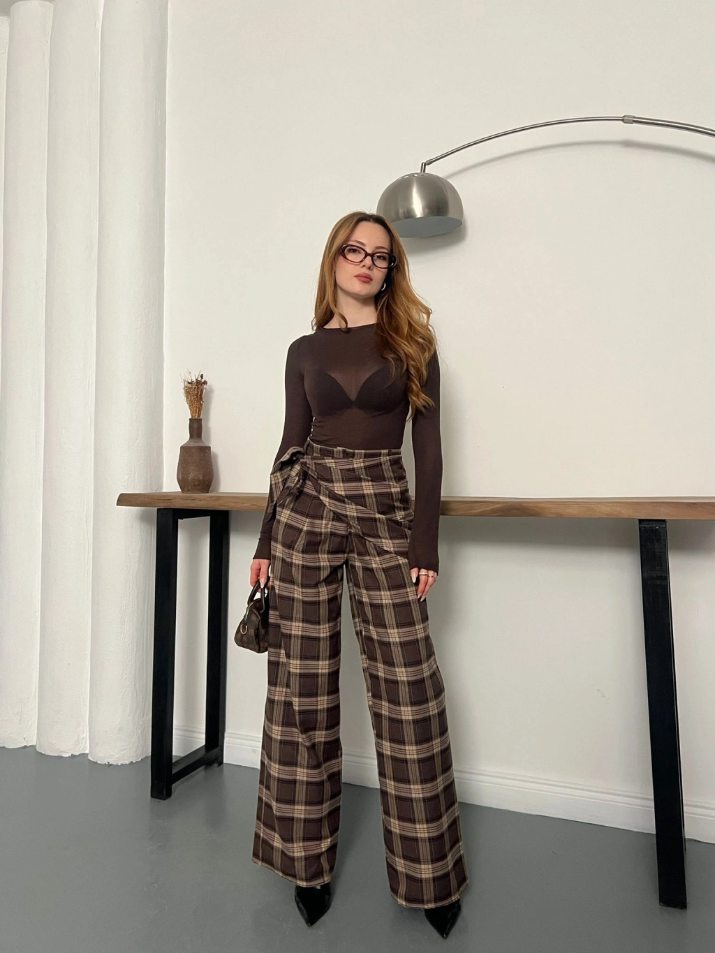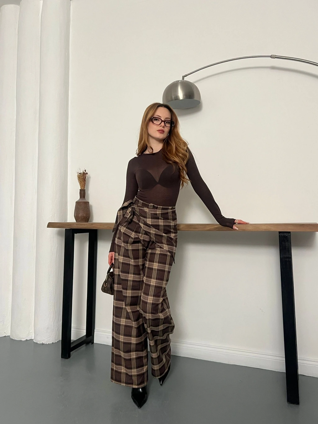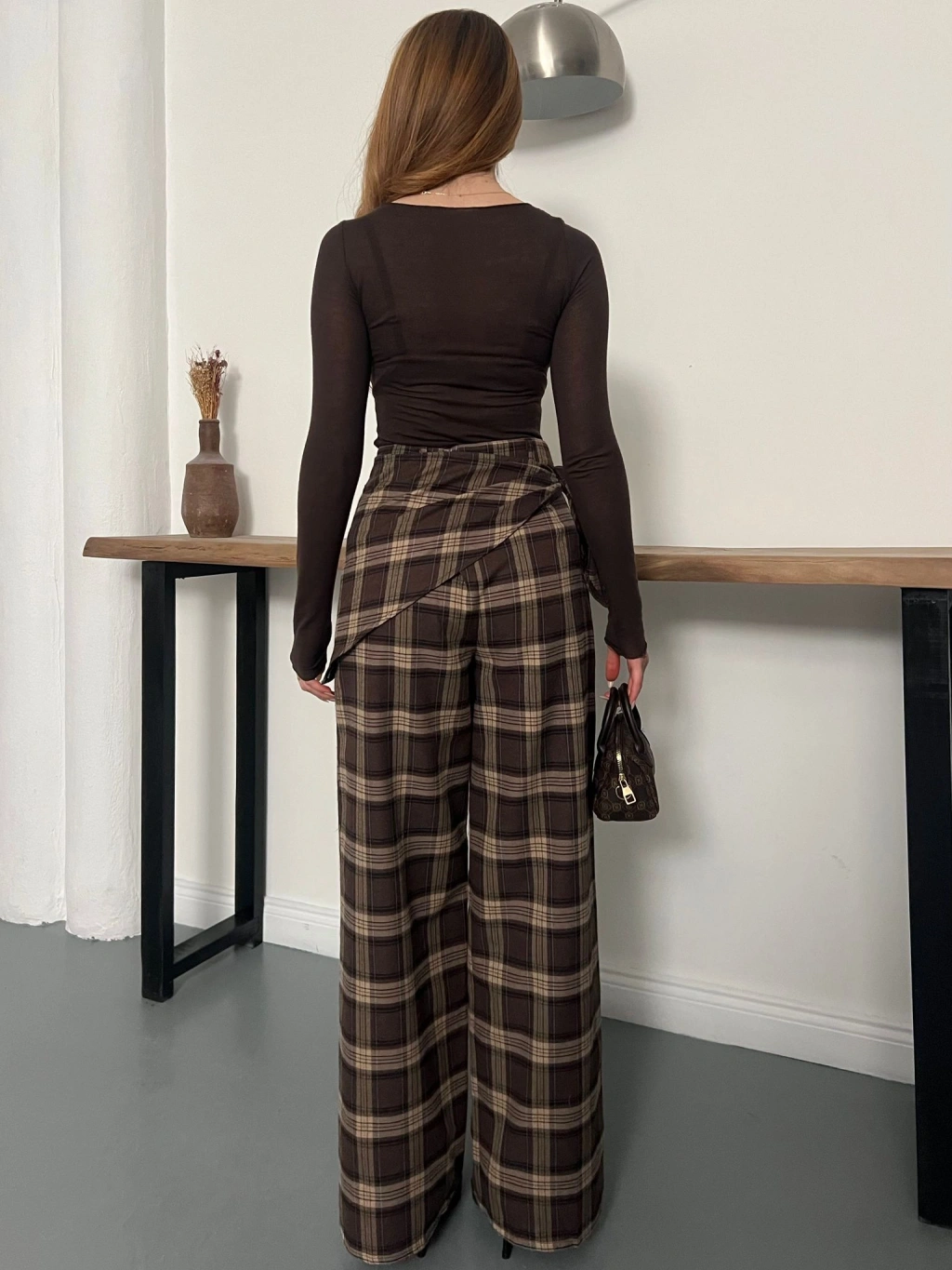 Ekose Yüksek Bel Fularlı Pantolon Kahve