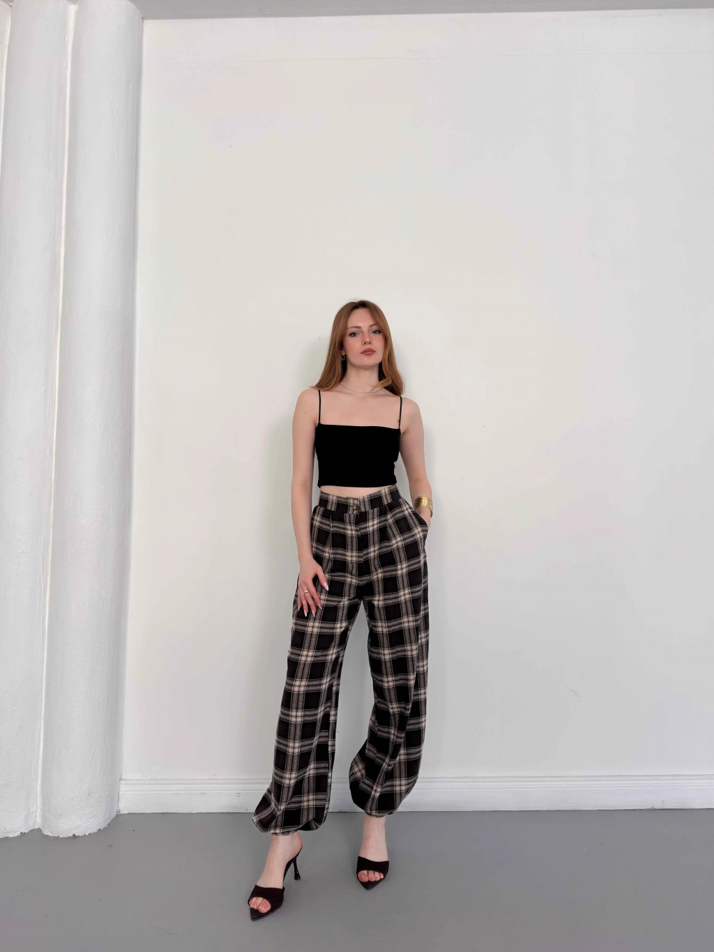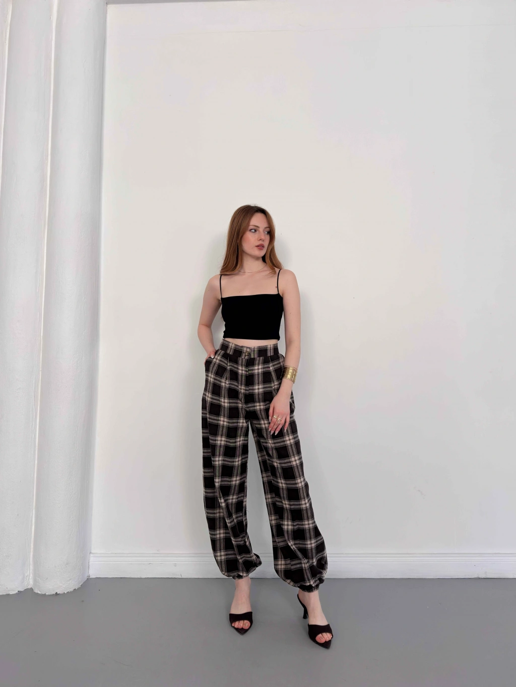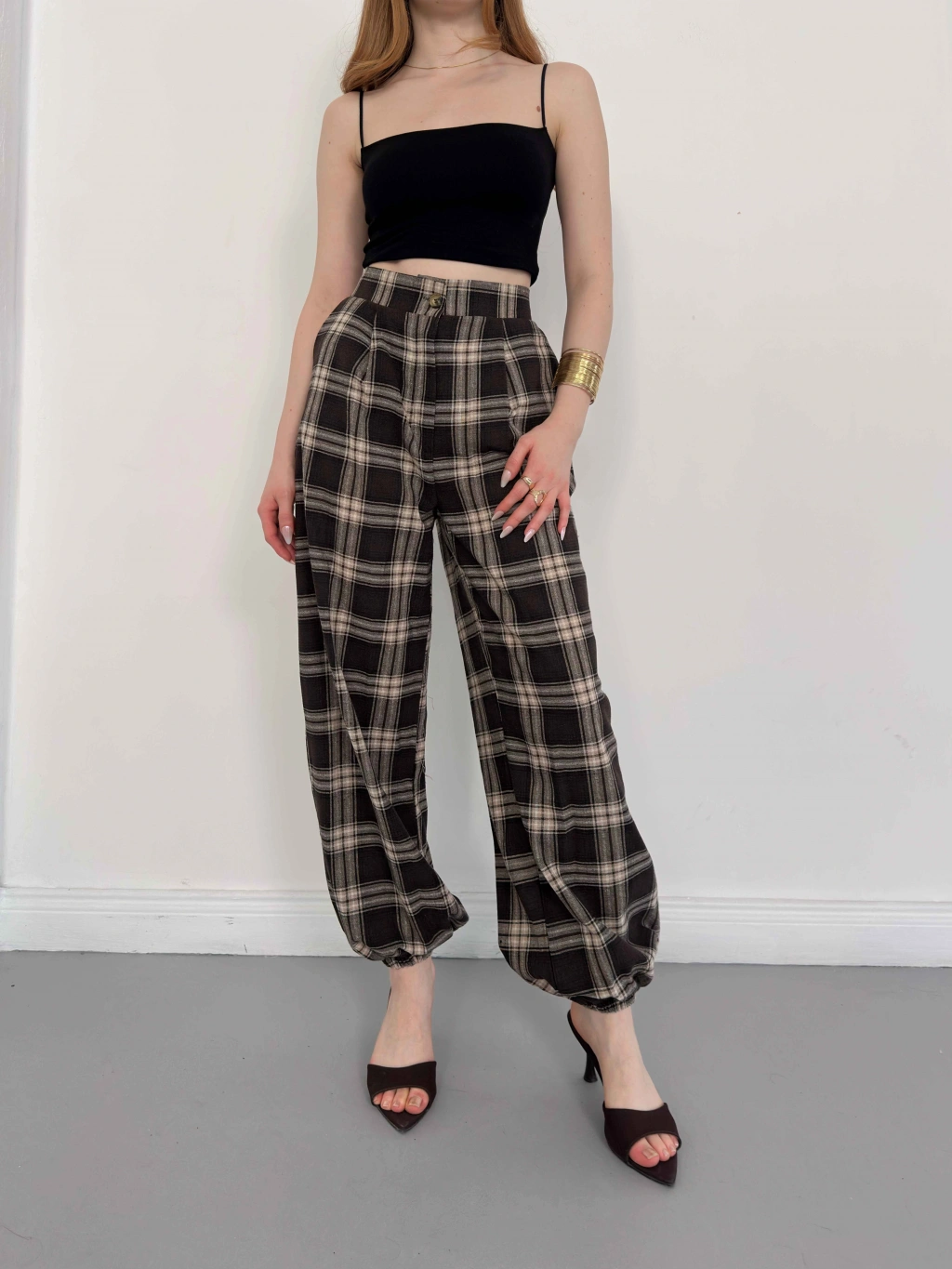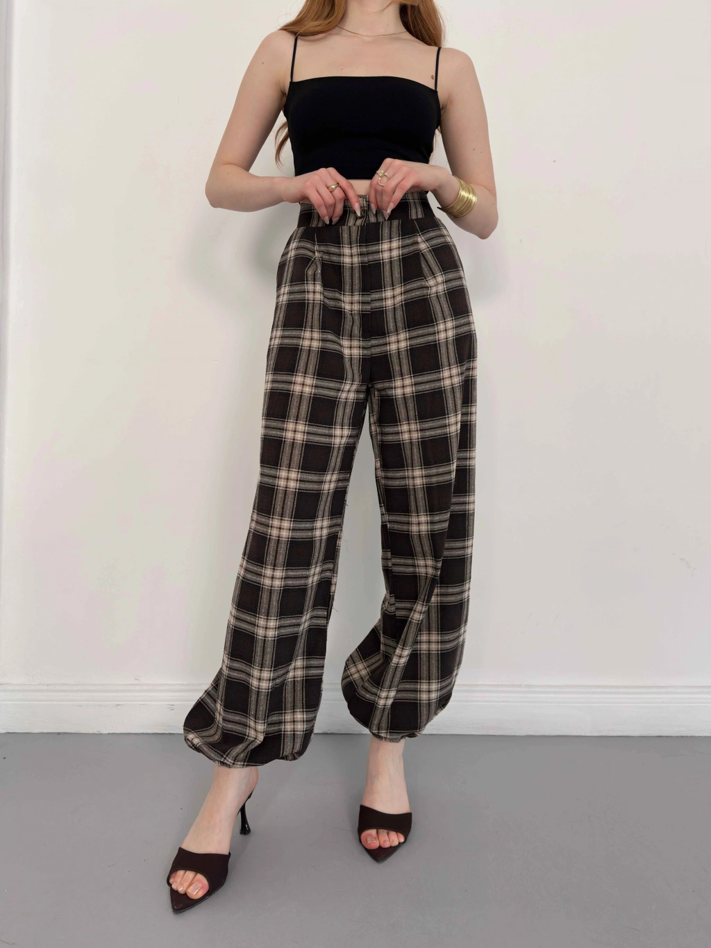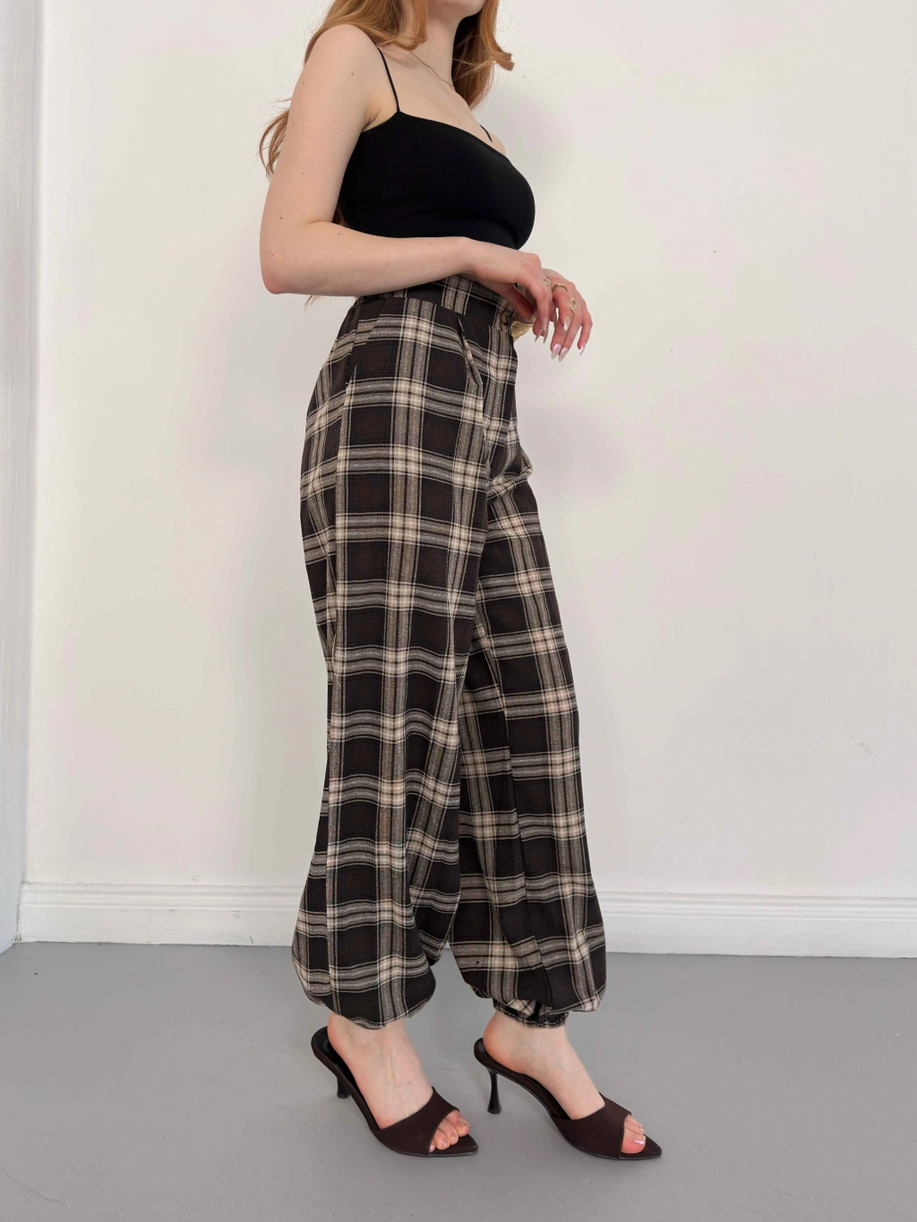 Ekose Yüksek Bel Paça Lastikli Pantolon Kahve