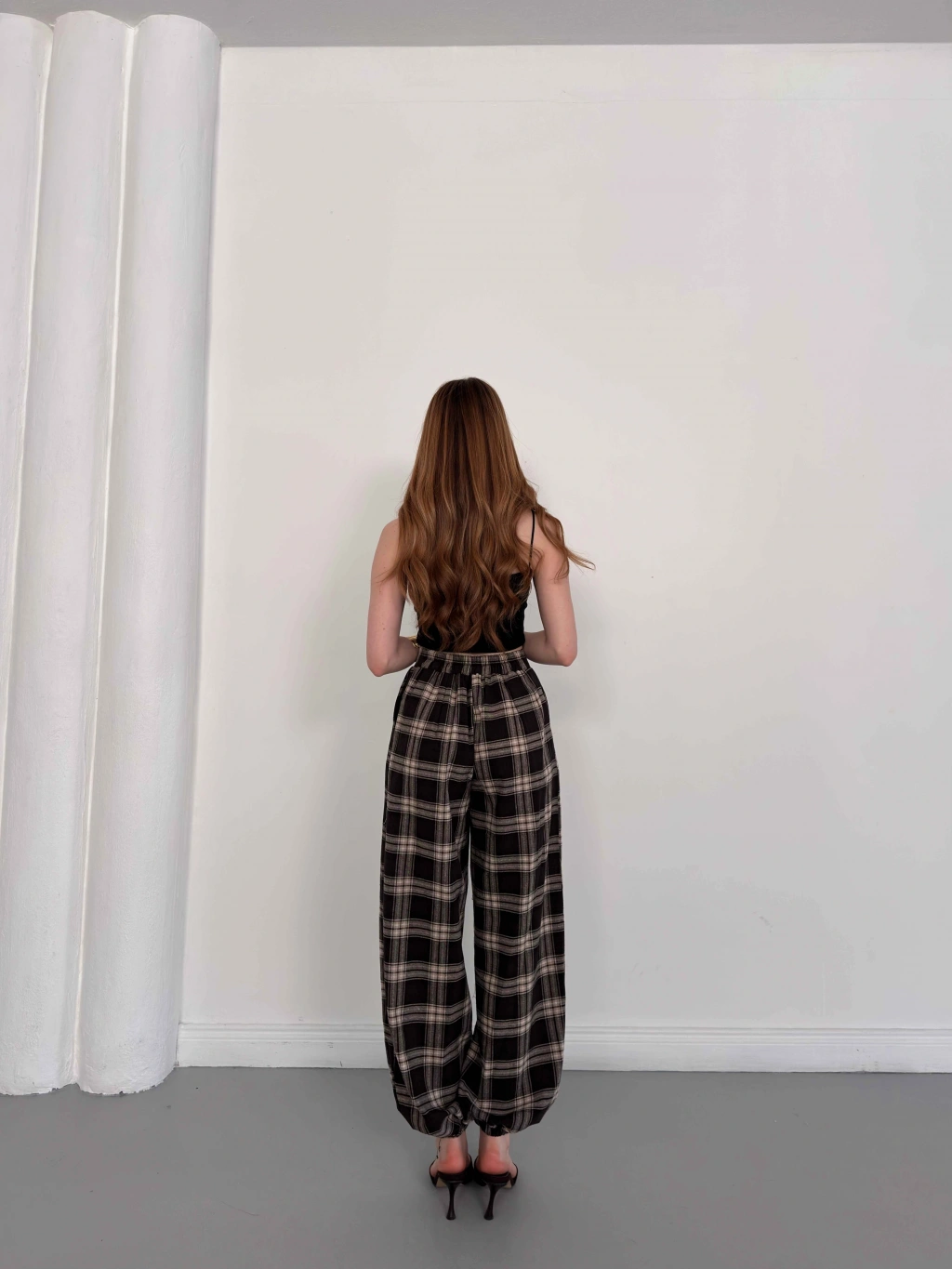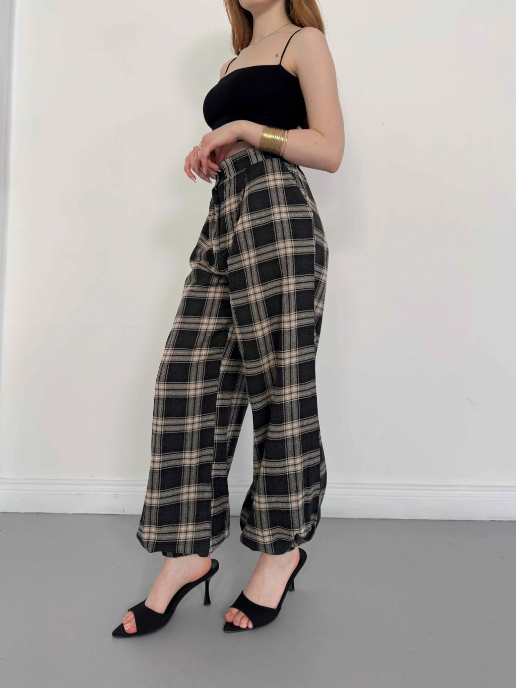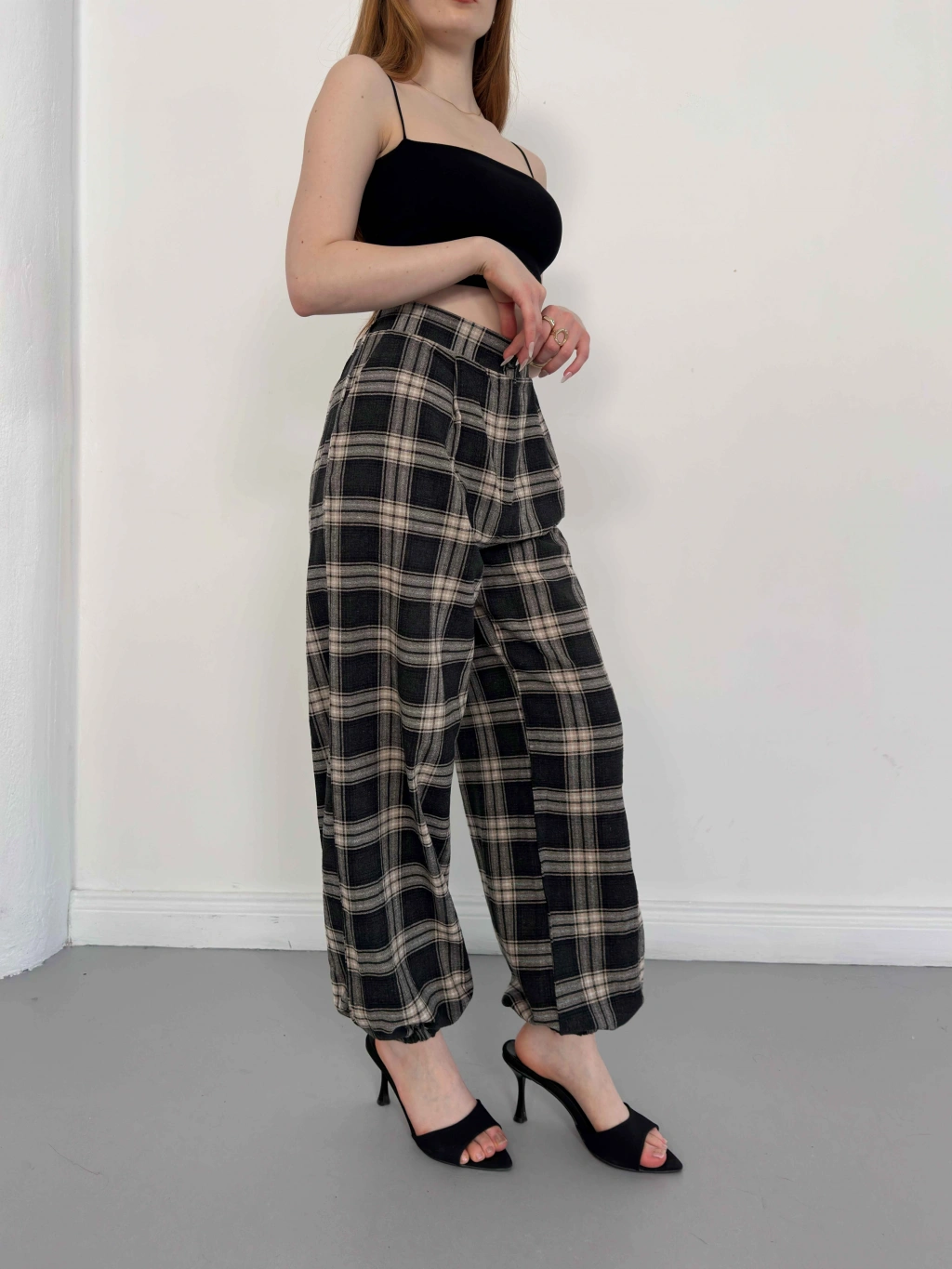 Ekose Yüksek Bel Paça Lastikli Pantolon Siyah