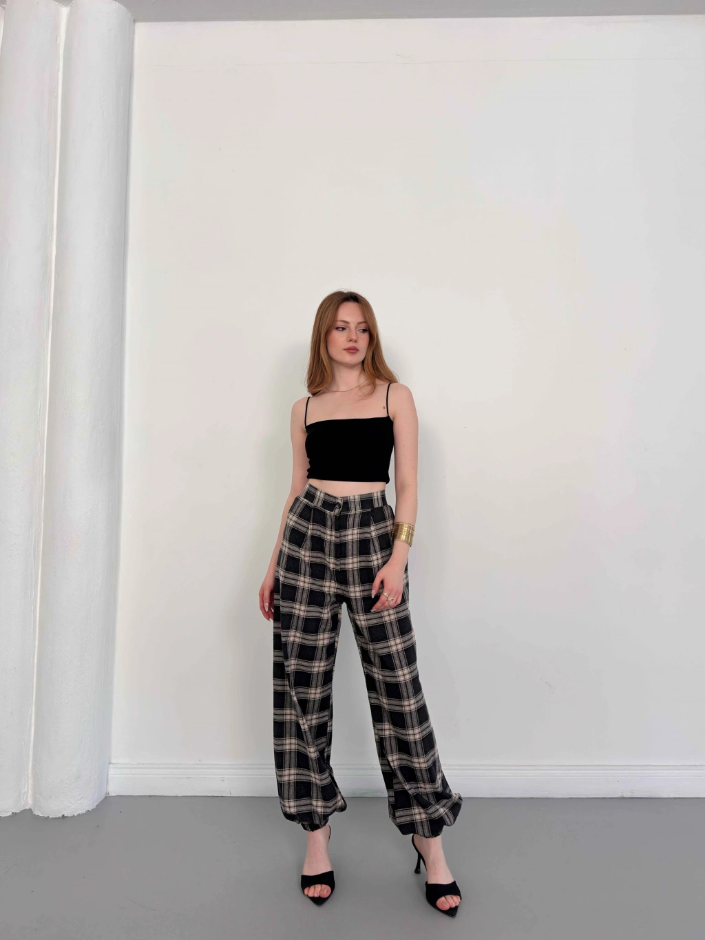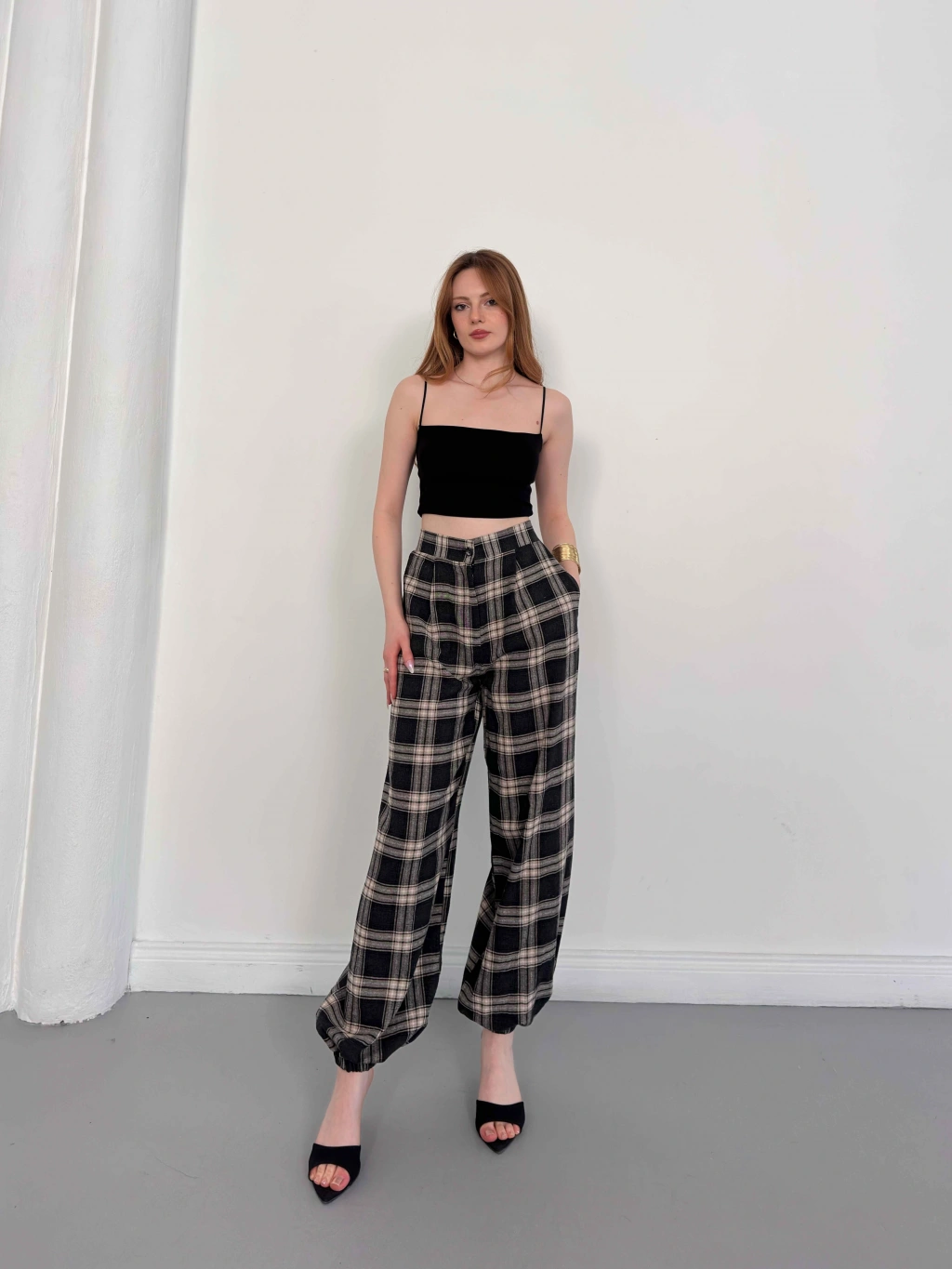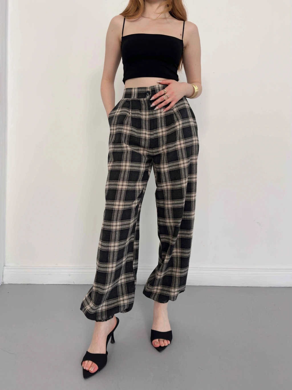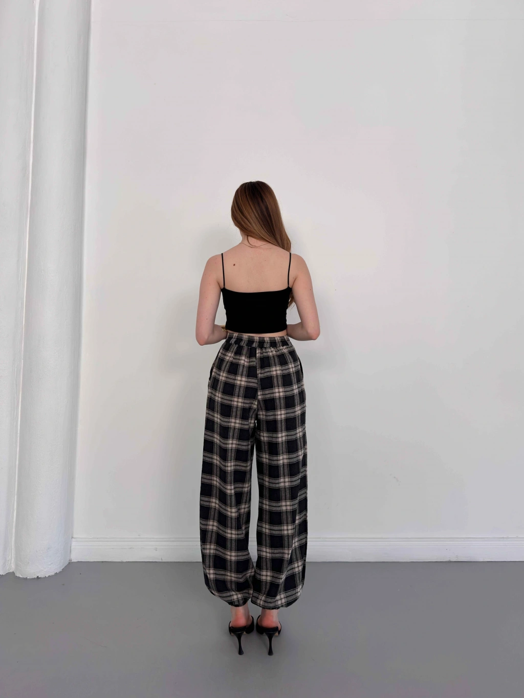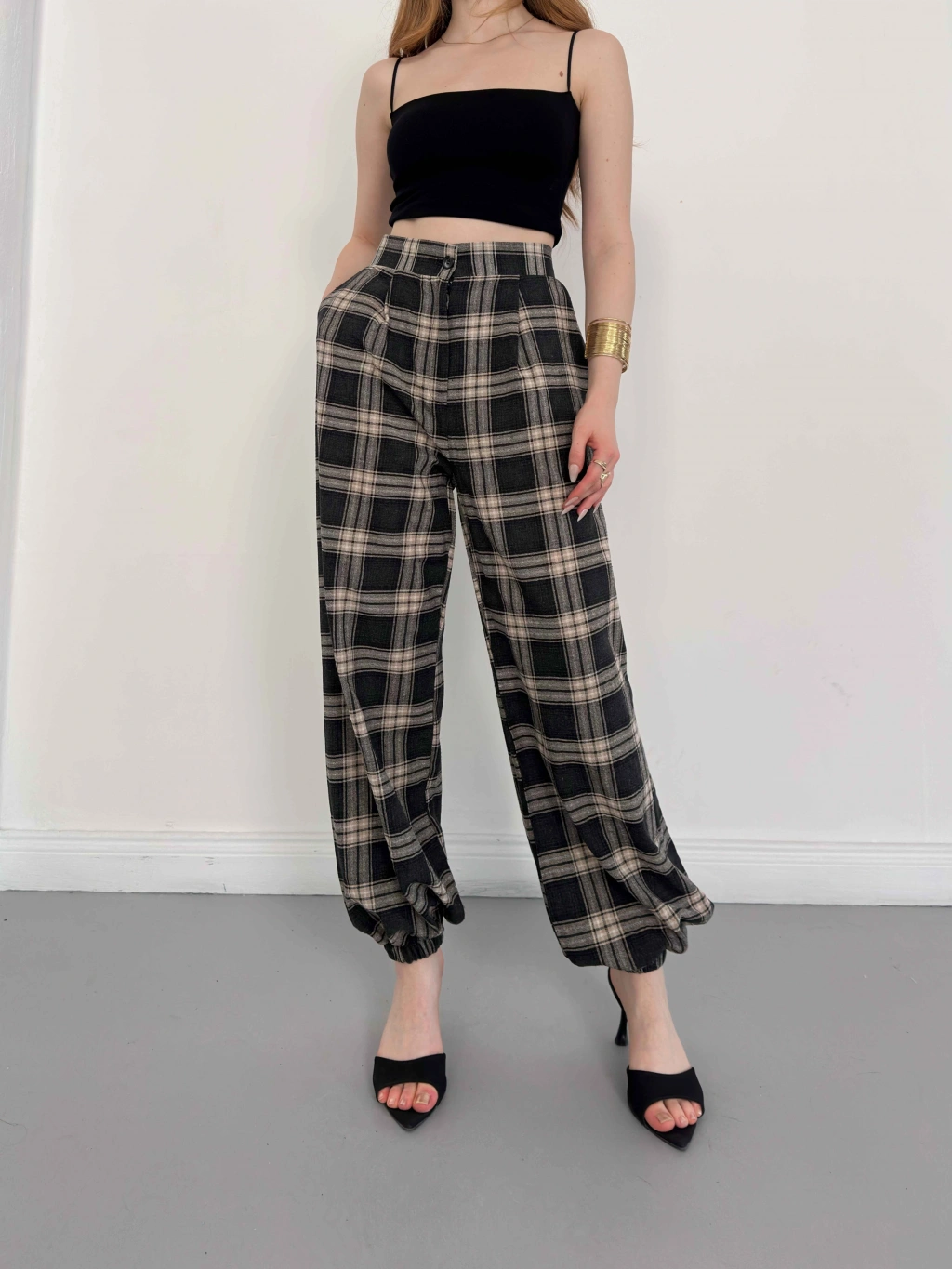 Ekose Yüksek Bel Paça Lastikli Pantolon Siyah