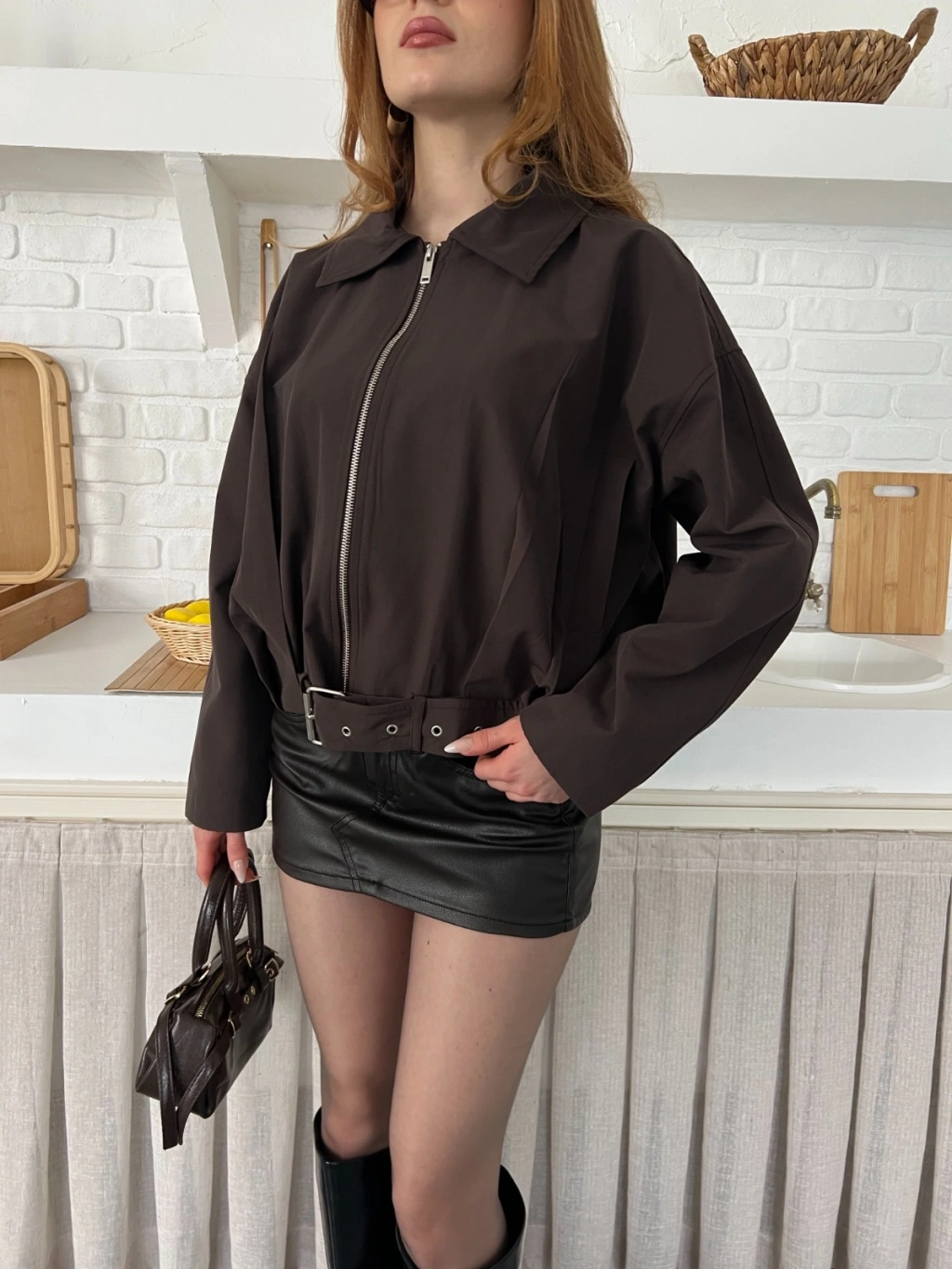 Fermuarlı Kemer Detaylı Oversize Trenç Ceket Acı Kahve