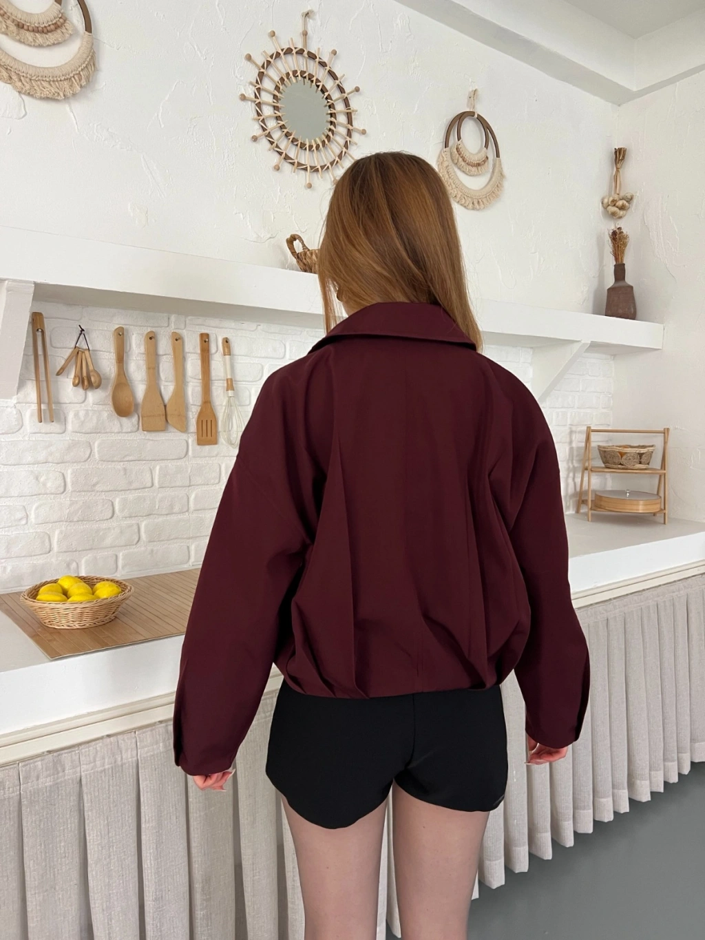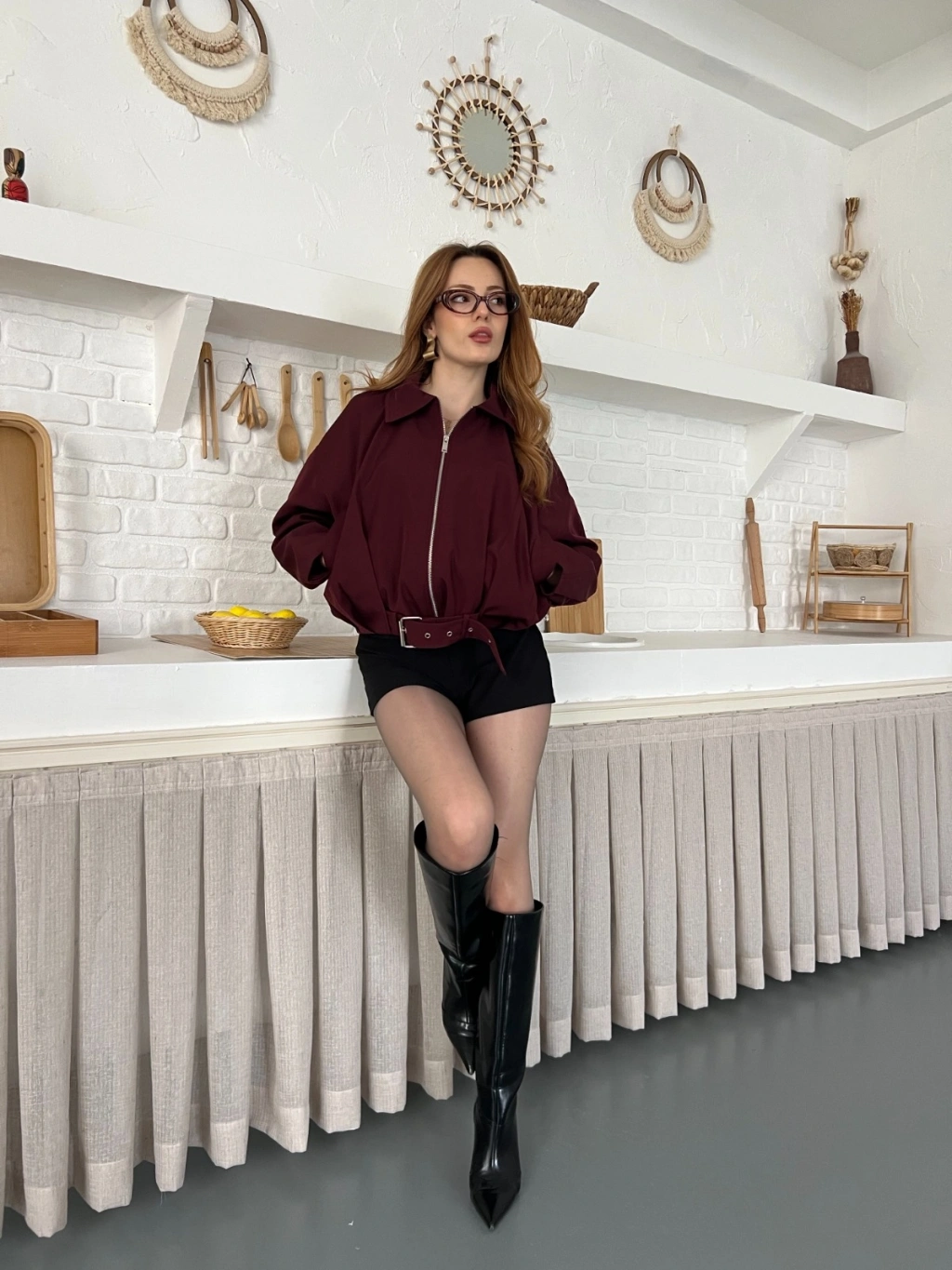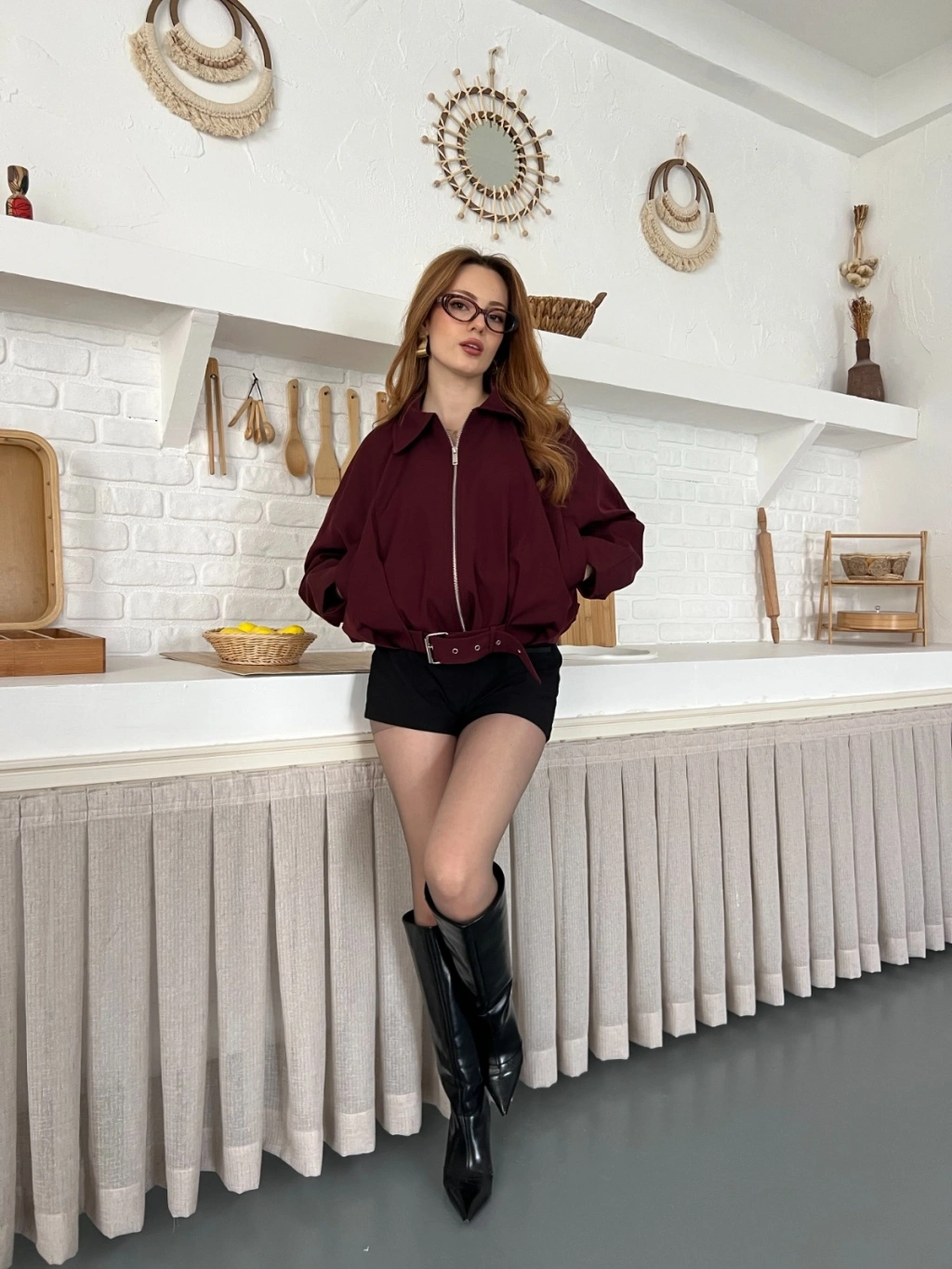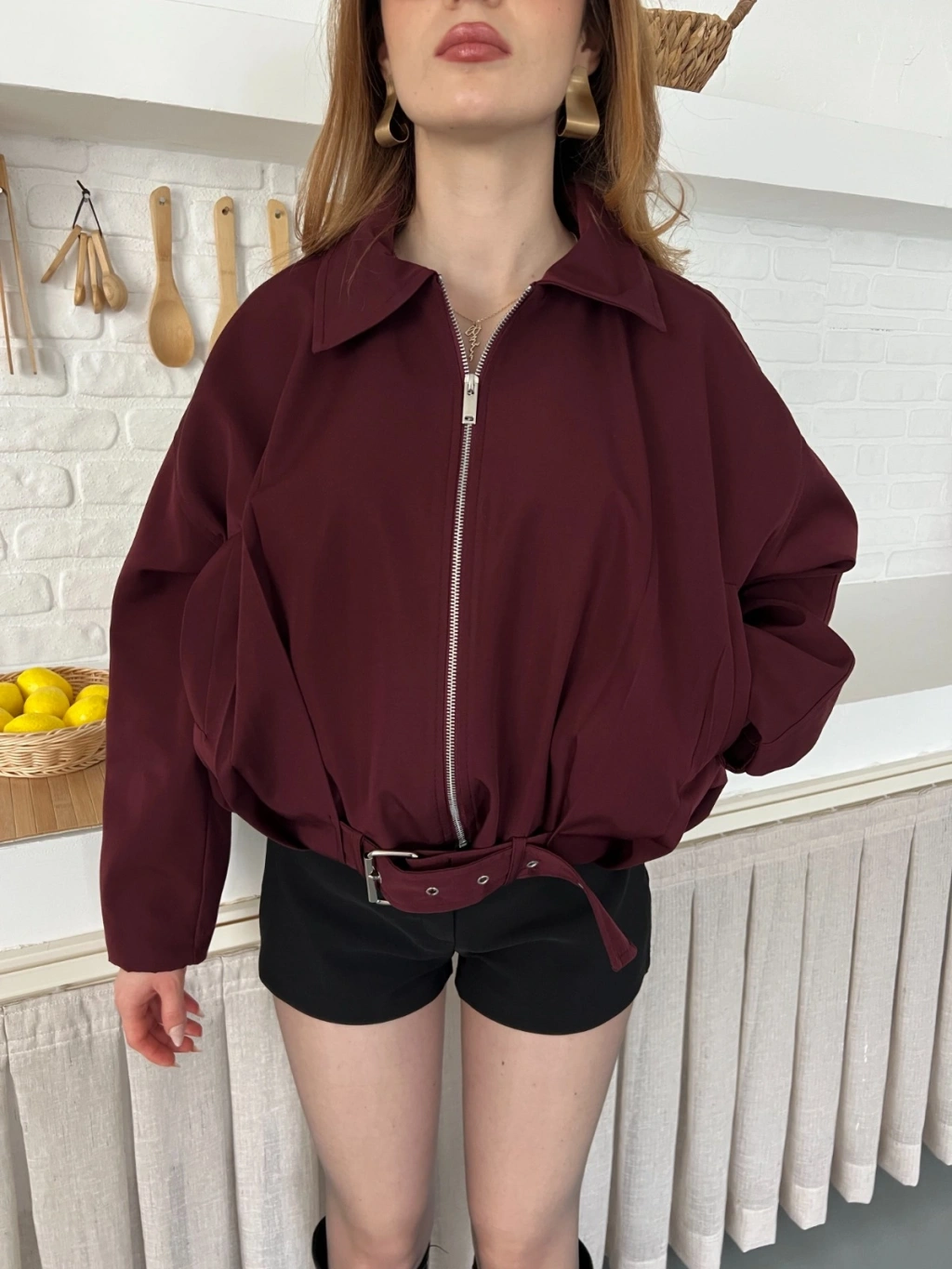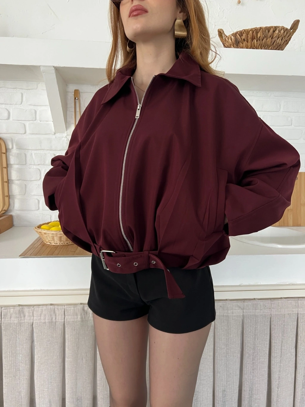 Fermuarlı Kemer Detaylı Oversize Trenç Ceket Bordo