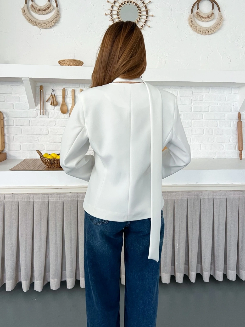 Fular Detaylı Düğmeli Ceket Beyaz