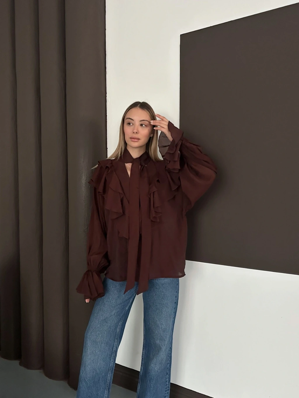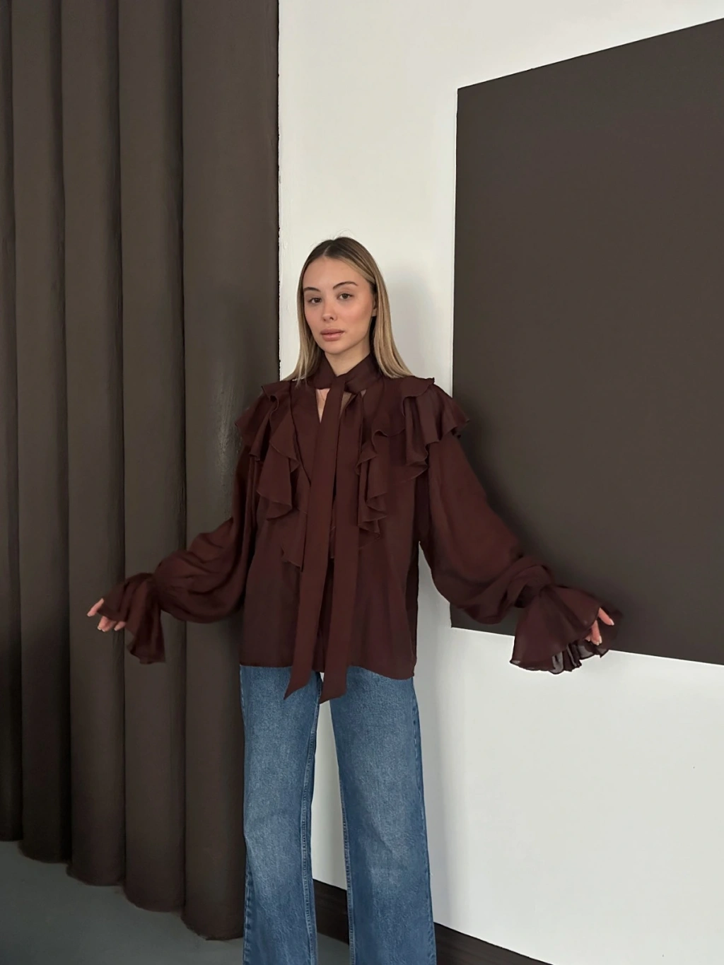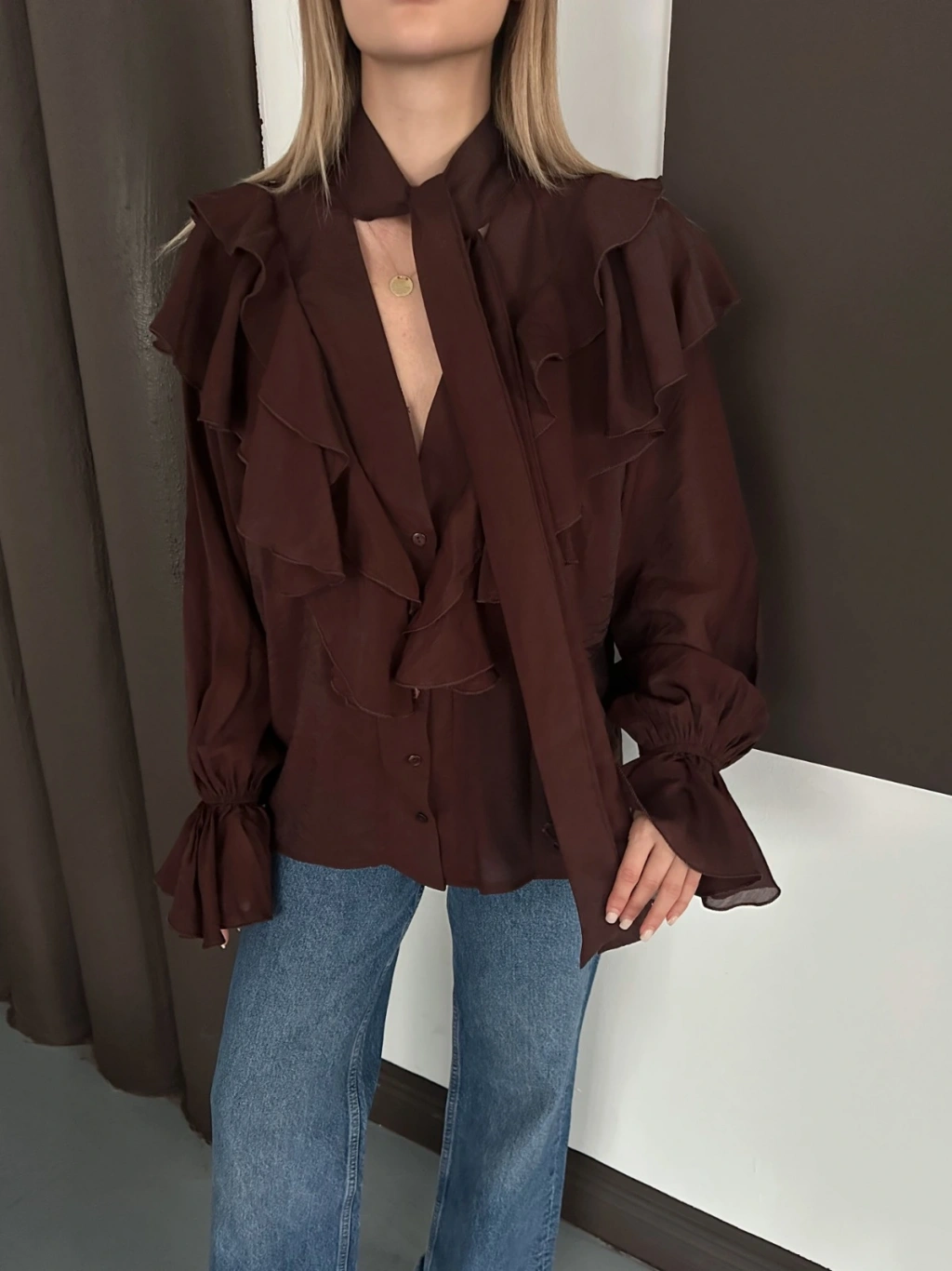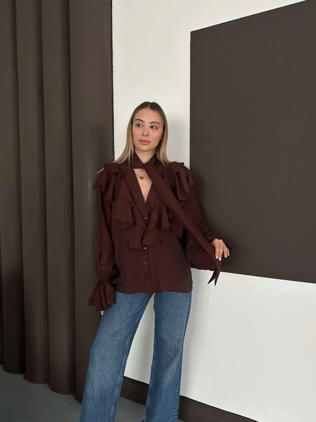 Fular Detaylı Fırfırlı Tasarım Gömlek Acı Kahve
