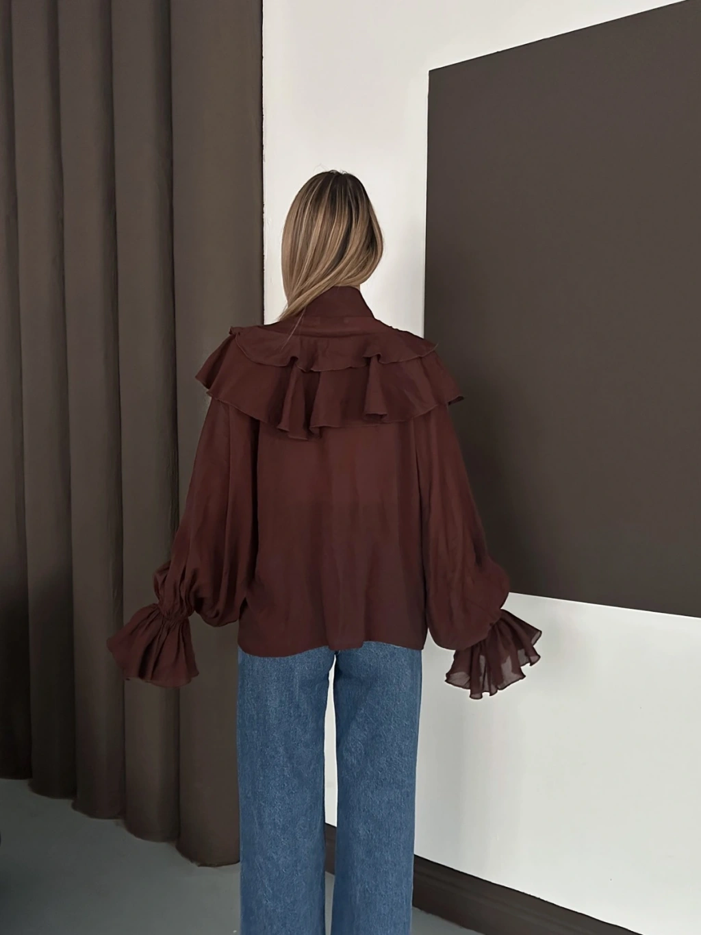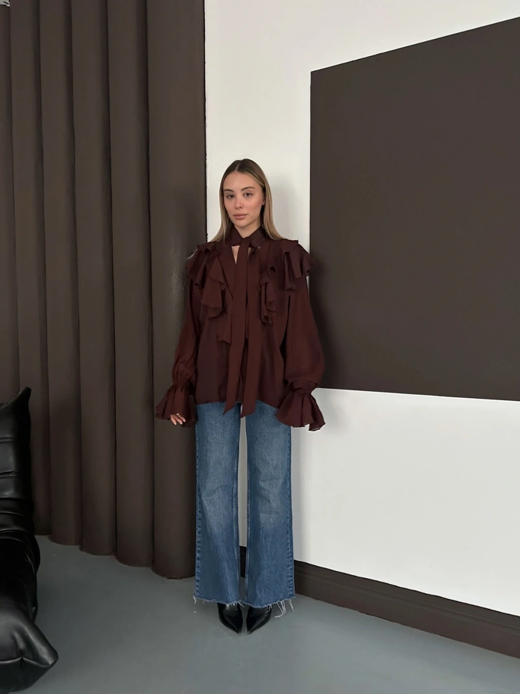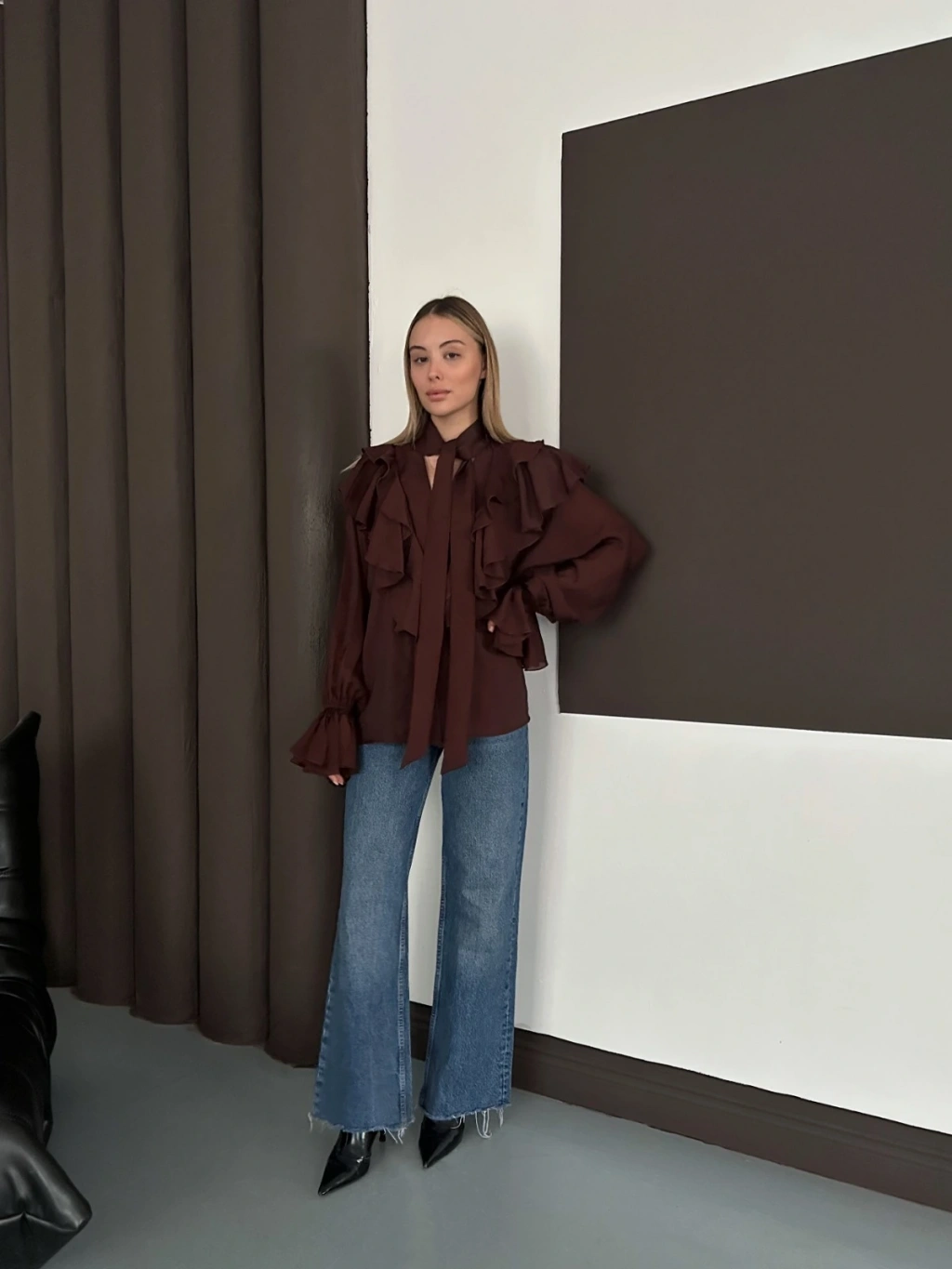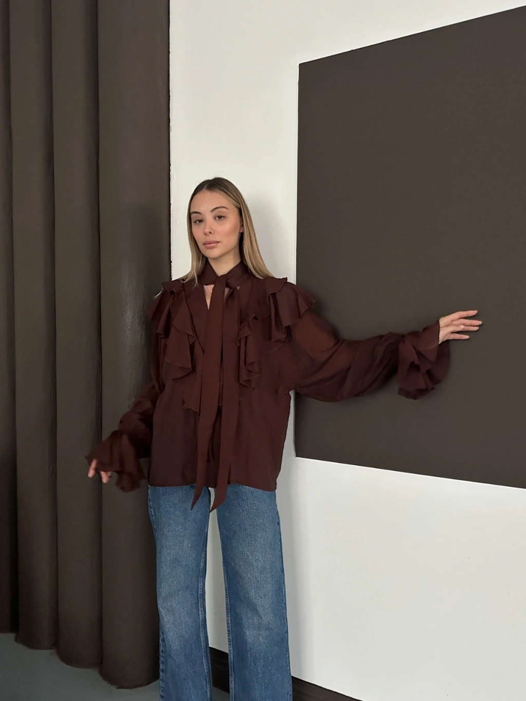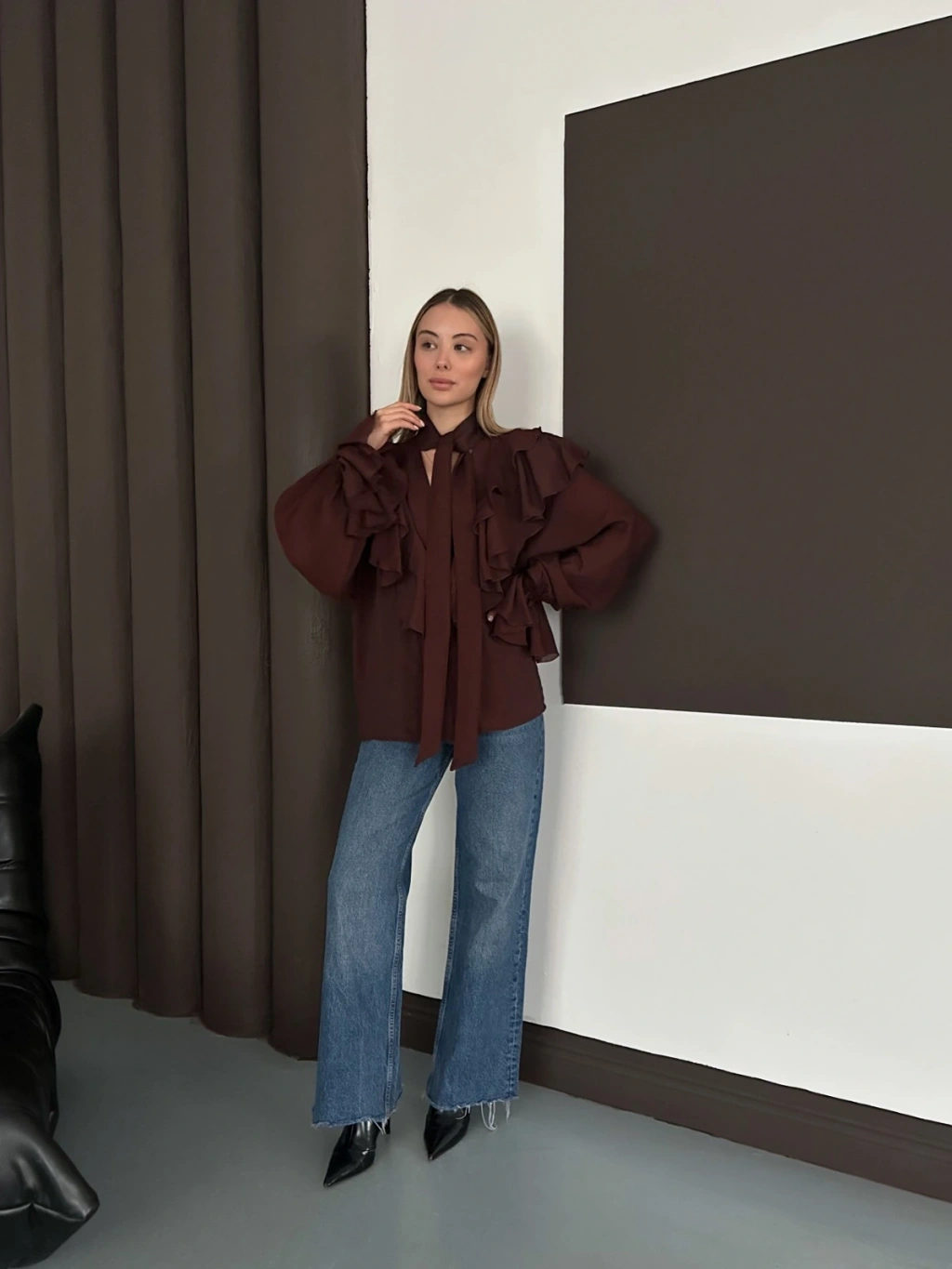 Fular Detaylı Fırfırlı Tasarım Gömlek Acı Kahve