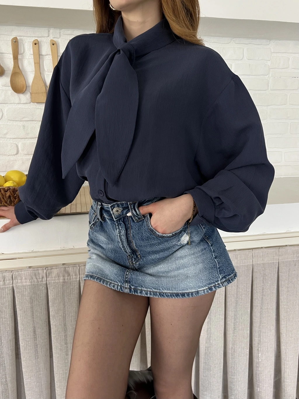 Fular Yaka Detaylı Oversize Gömlek Lacivert