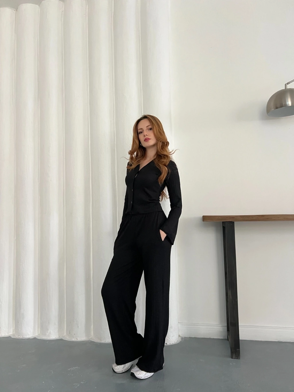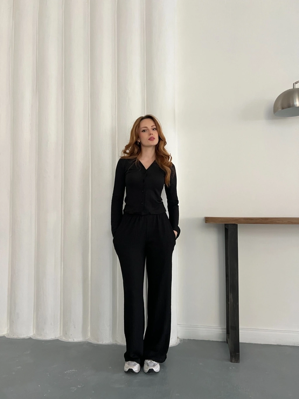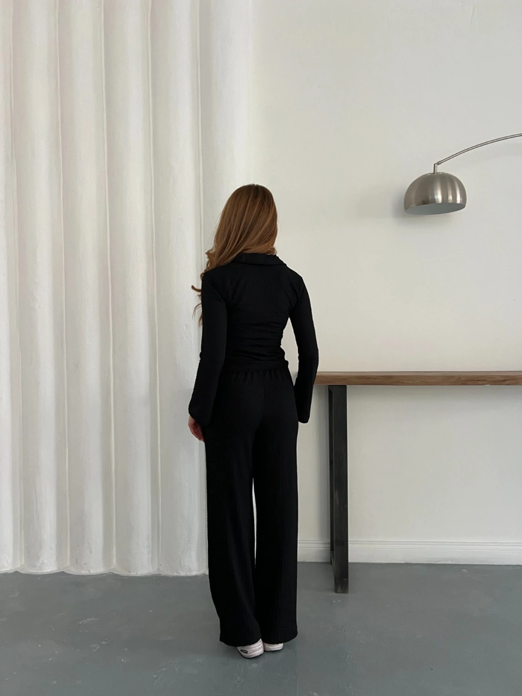 Kemerli Yüksek Bel Bol Paça Pantolon Siyah