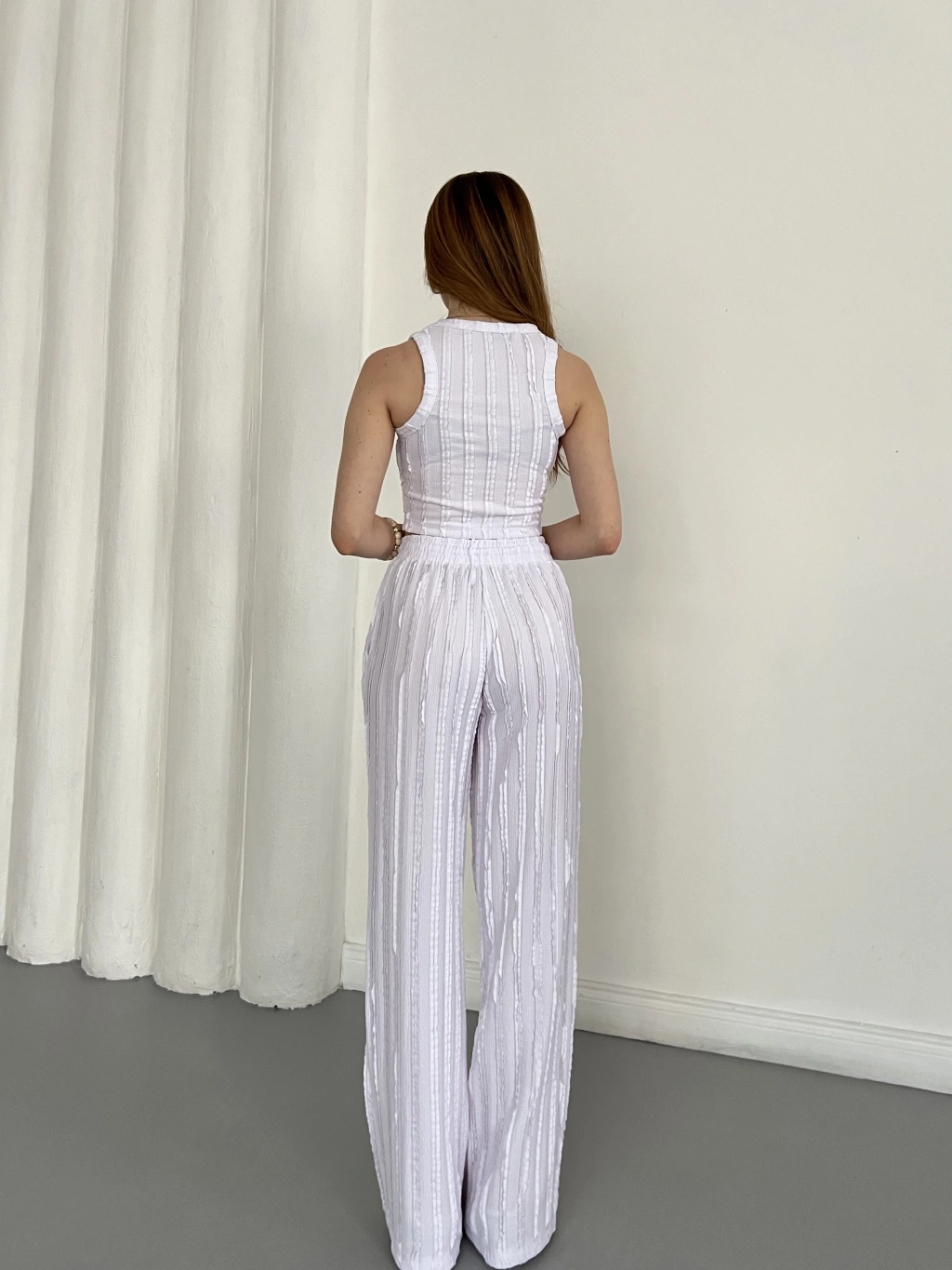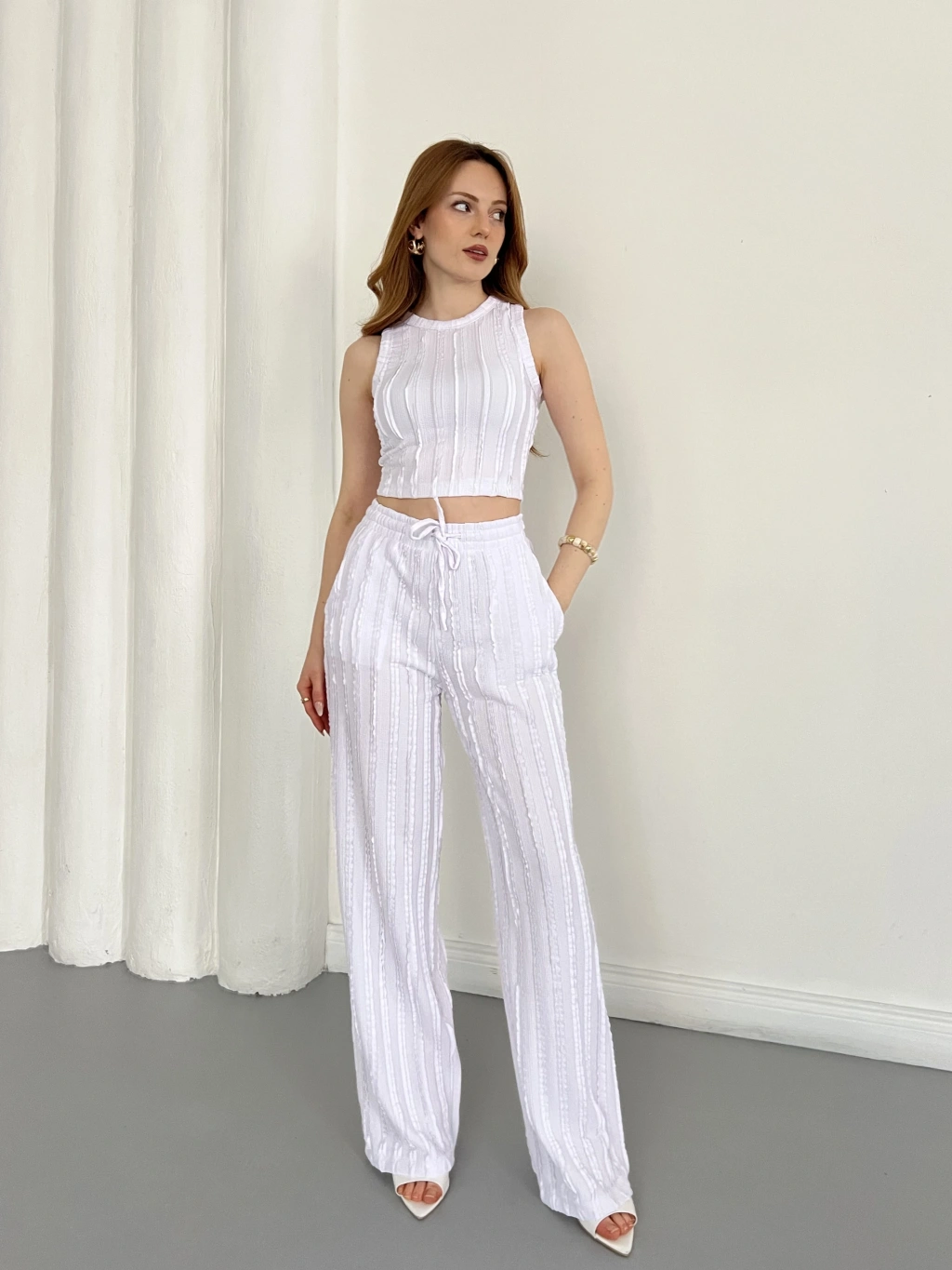 Gofre Kumaş Ters Dikiş Halter Yaka Takım Beyaz