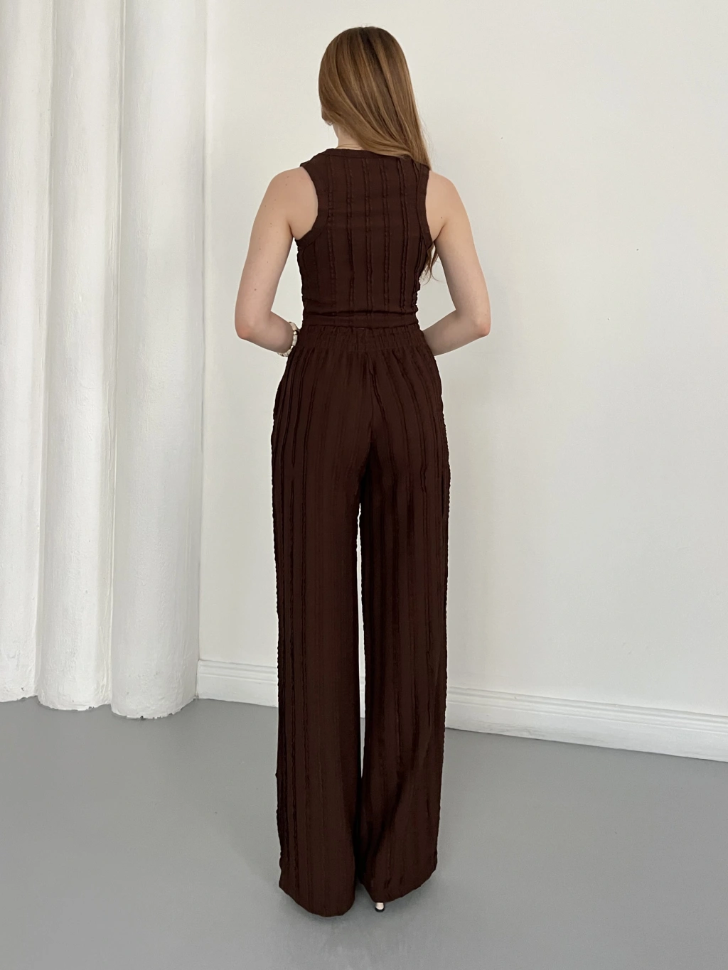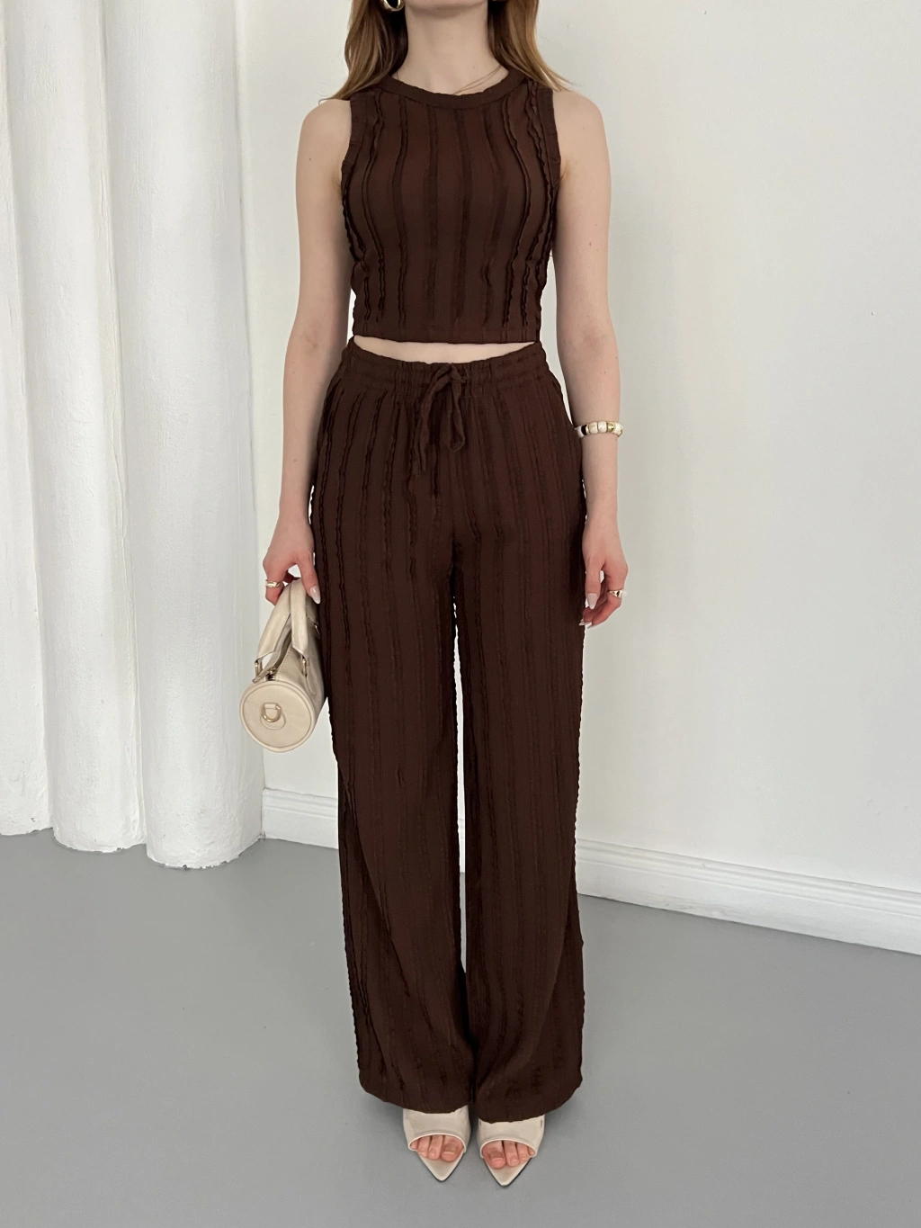 Gofre Kumaş Ters Dikiş Halter Yaka Takım Kahve
