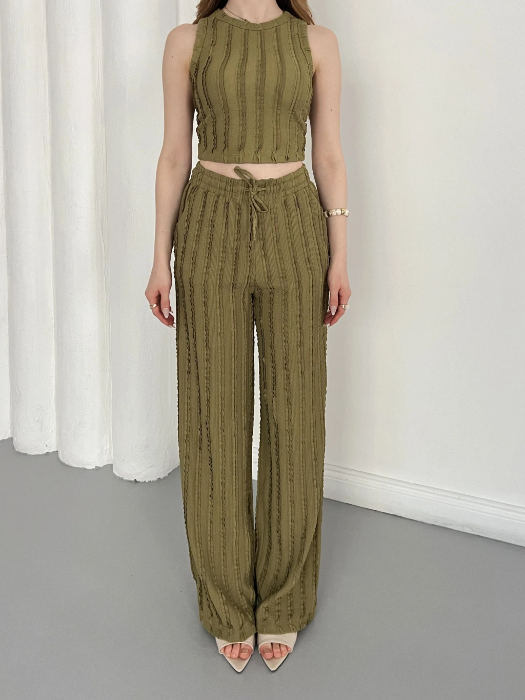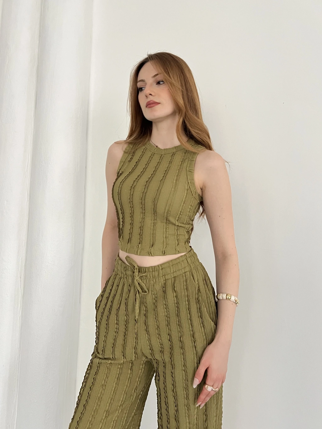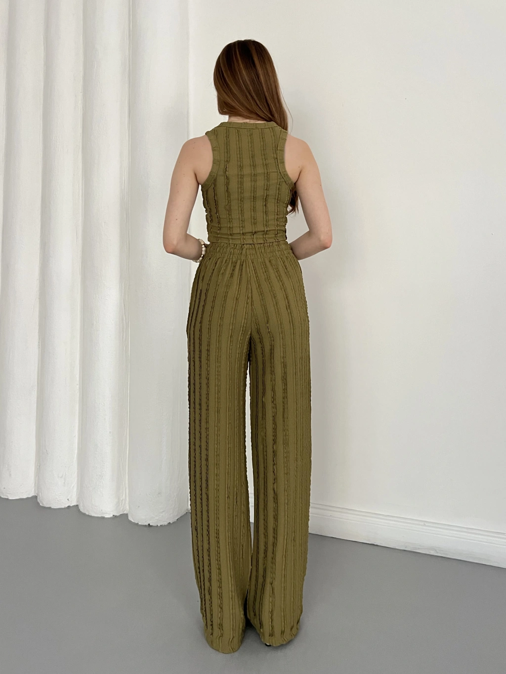 Gofre Kumaş Ters Dikiş Halter Yaka Takım Yeşil