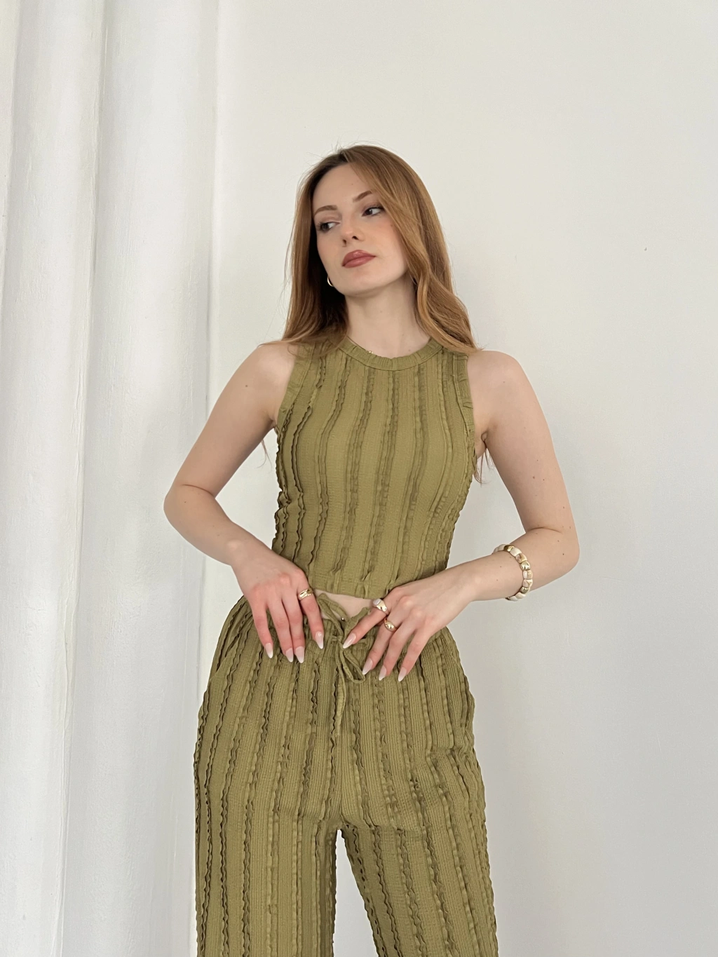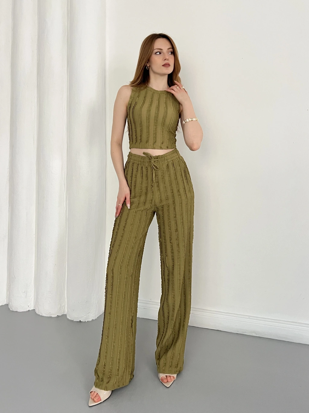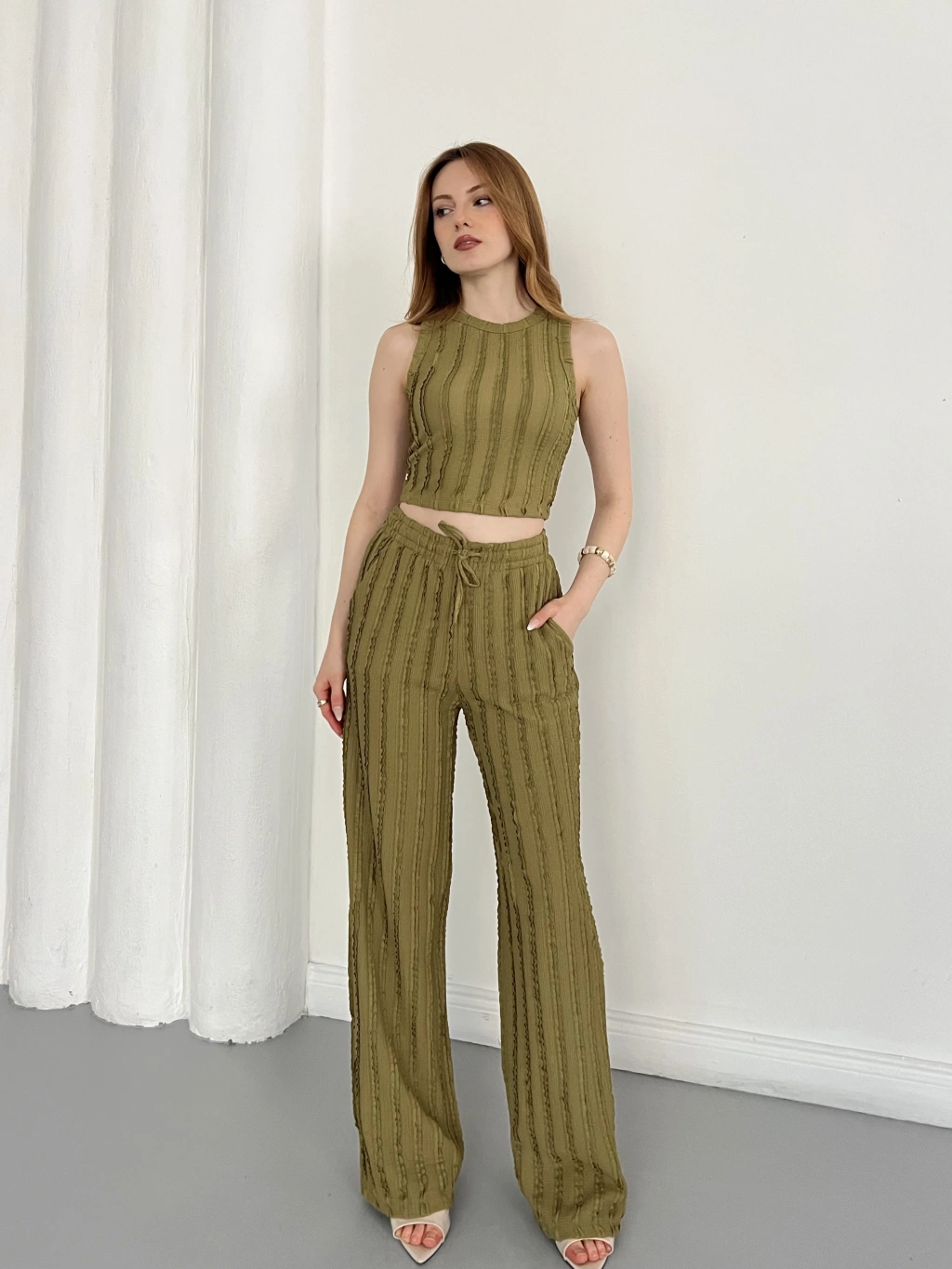 Gofre Kumaş Ters Dikiş Halter Yaka Takım Yeşil