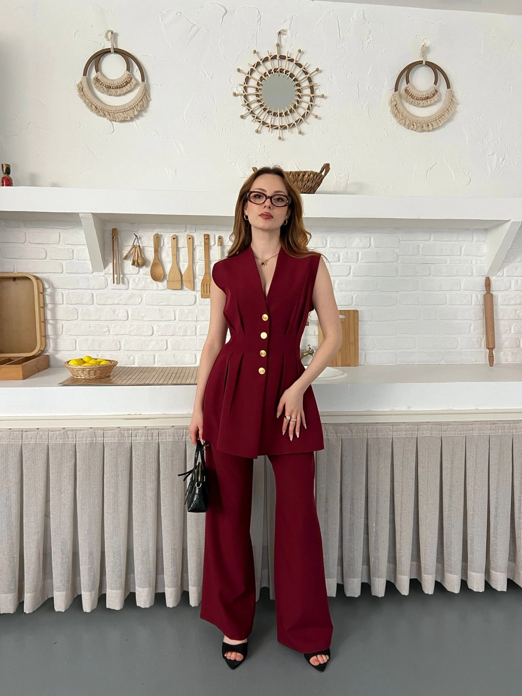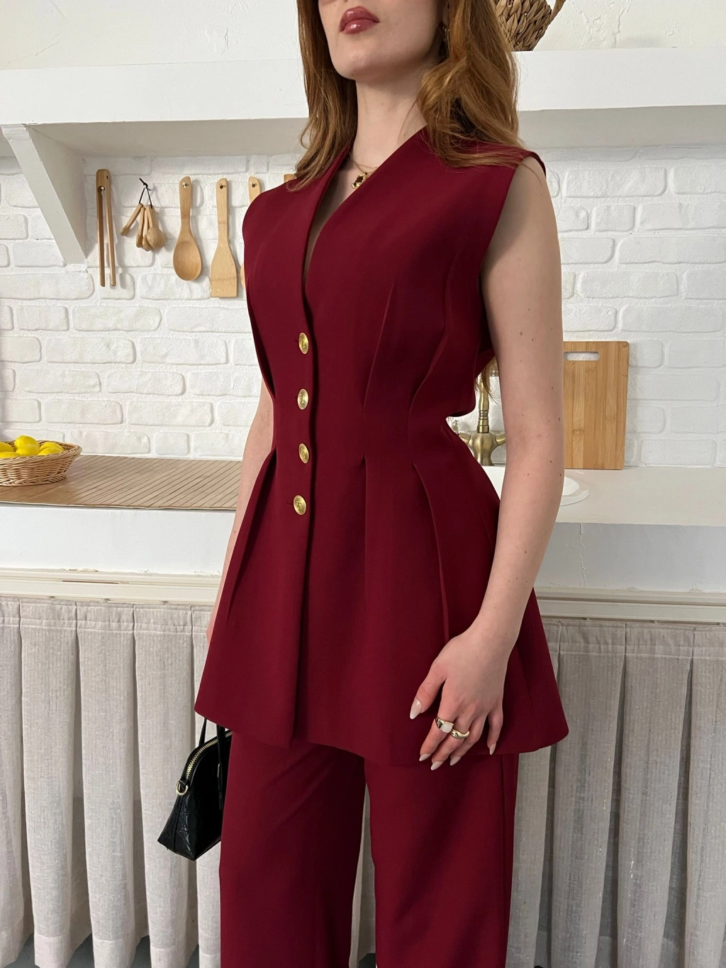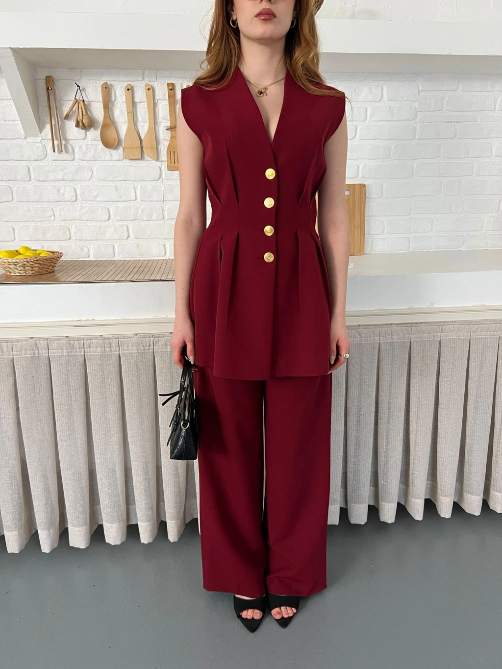 Gold Düğme Detaylı İkili Takım Bordo